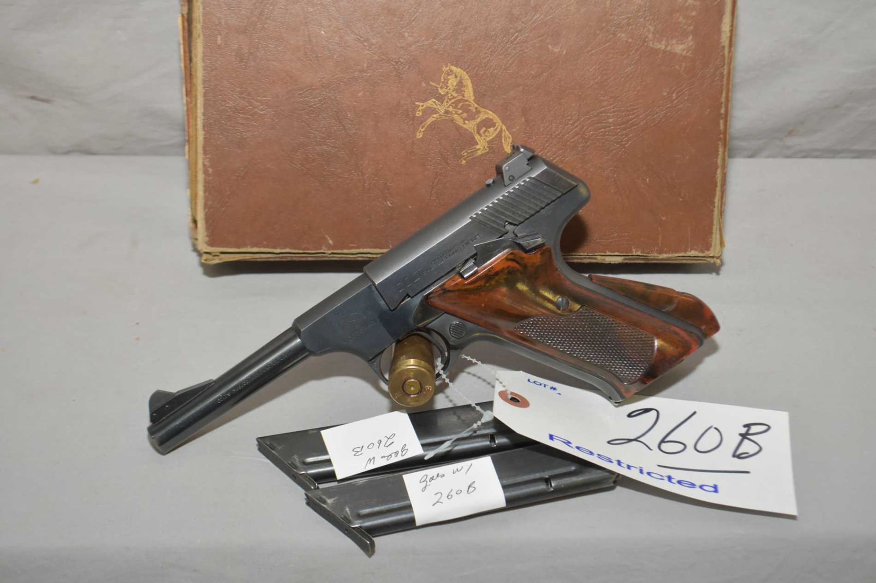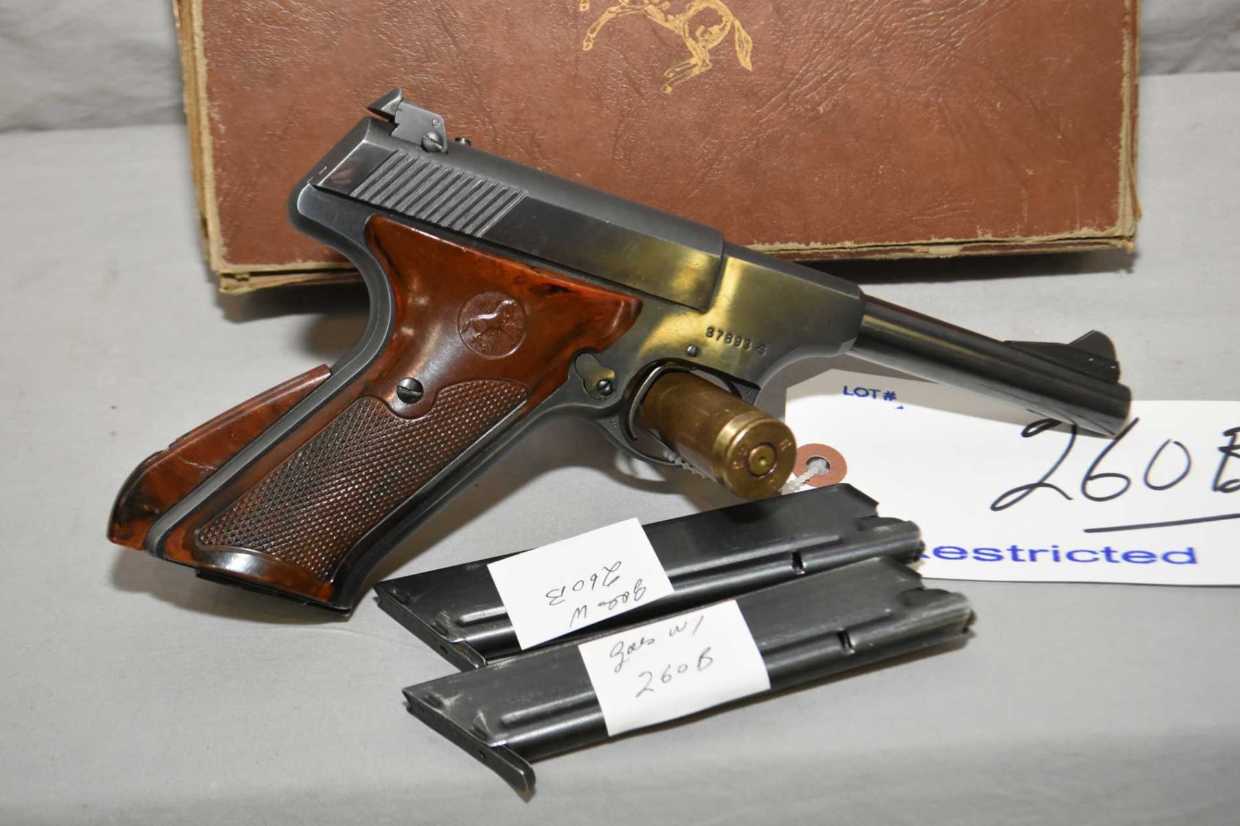 Colt Model Woodsman .22 LR Cal 10 Shot Semi Auto Pistol w/ 114 mm bbl [ blued finish, few marks, good checkered grips, some slight fading to front and back straps, crack to back plastic grip strap extension by screw, c/w two extra mags, in damaged original Colt box, Circa 1950 ] Ser # 37893S Restricted Handgun Cert # 376084 FRT # 17448 - 1