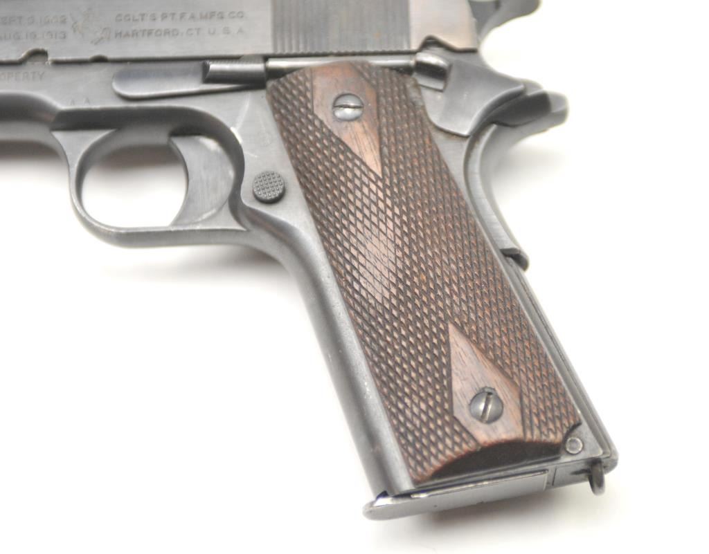 Colt Model of 1911 U.S. Army semi-automatic pistol, .45 ACP caliber, Serial #203446. The pistol is in fine overall condition retaining approximately 98% of an arsenal re-finish with associated “AA” proofs. Thediamond checkered wood grips are in good condition with mars, dents and some flattening of the checkering. The frame is marked, “UNITED STATES PROPERTY” with one correct two-tone magazine and the lanyardring is retained. The bore is good, the action functions well and the markings are crisp on this nice Colt. Est.: $800-$1,600. (C+R/PPT).