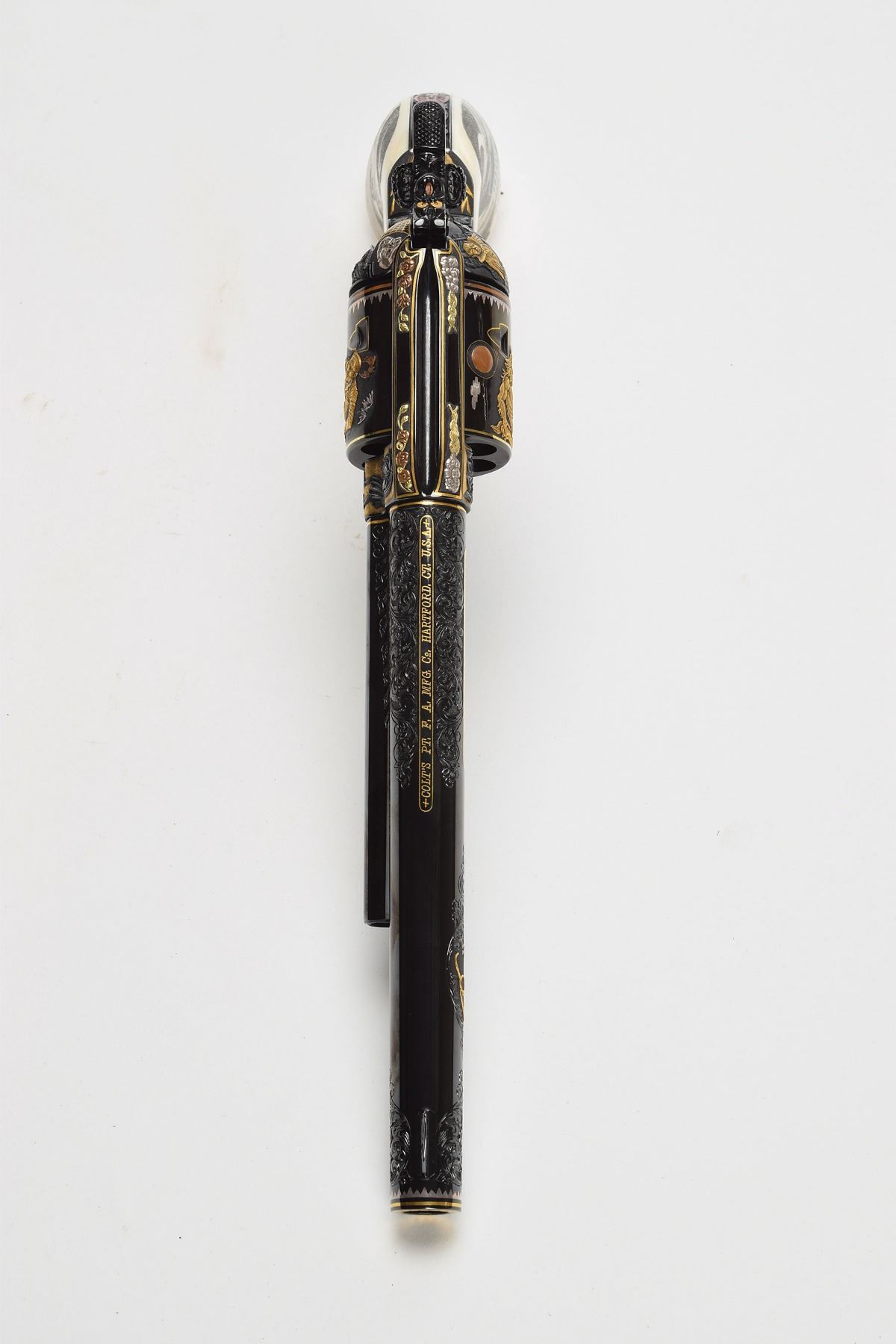 Spectacular Colt 'Monster Legacy' revolver, engraved and inlaid by master engraver Bryson Gwinnell, serial #1675PC, .44-40, 7 1/2? barrel with an excellent, bright bore. This is a simply stunning, and uniquely themed, masterpiece of the engraver's art. Conceived jointly by the original collector and Mr. Gwinnell, their quest for something different, stunning, and unique was an unqualified success. The revolver features fourteen separate gold, silver, and copper sculpted inlays along with deeply chiseled, relief engraved vignettes, all in an iconic gothic horror theme.