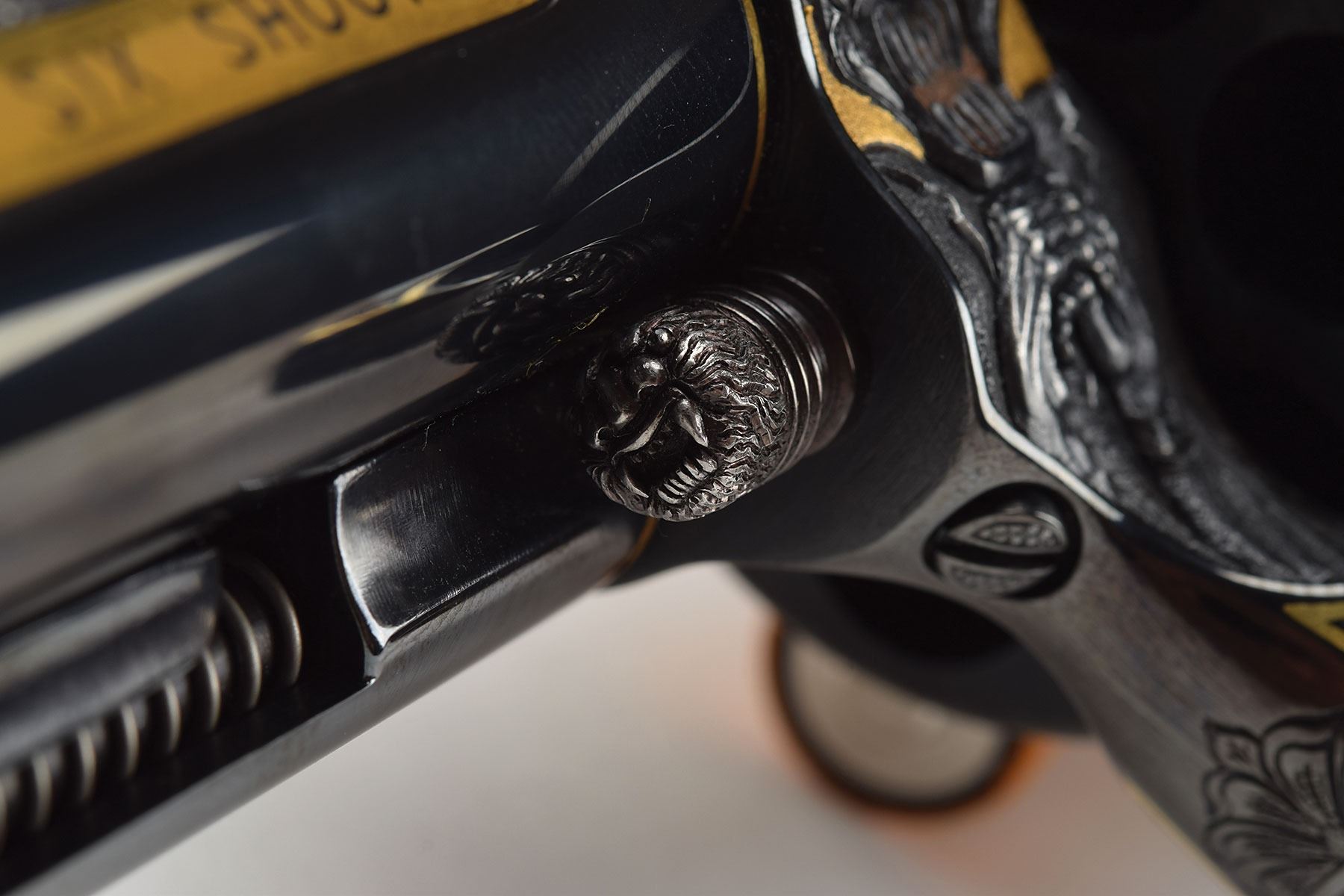 The revolver was originally a Peacemaker Centennial, which was chosen for the unfluted cylinder that allowed for more surface area for embellishment. The right side of the cylinder shows a relief engraved gold inlay depicting Frankenstein's Monster sitting atop a casket, which is inlaid in silver with two bats flying above, one in silver and one in copper. The left side of the cylinder has a stunning sculpted werewolf in gold with full moon above in copper and surrounding clouds in silver. The left recoil shield has a relief engraved gold inlay of Dracula holding a victim in his arms, she is sculpted in silver with copper hair, and castle in the background. Below these inlays is a bat in flight. The right recoil shield has a sculpted silver skull and gold spider web above the loading gate.