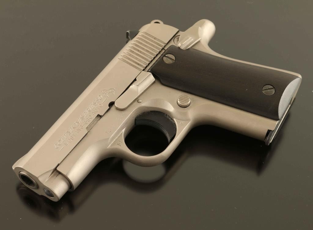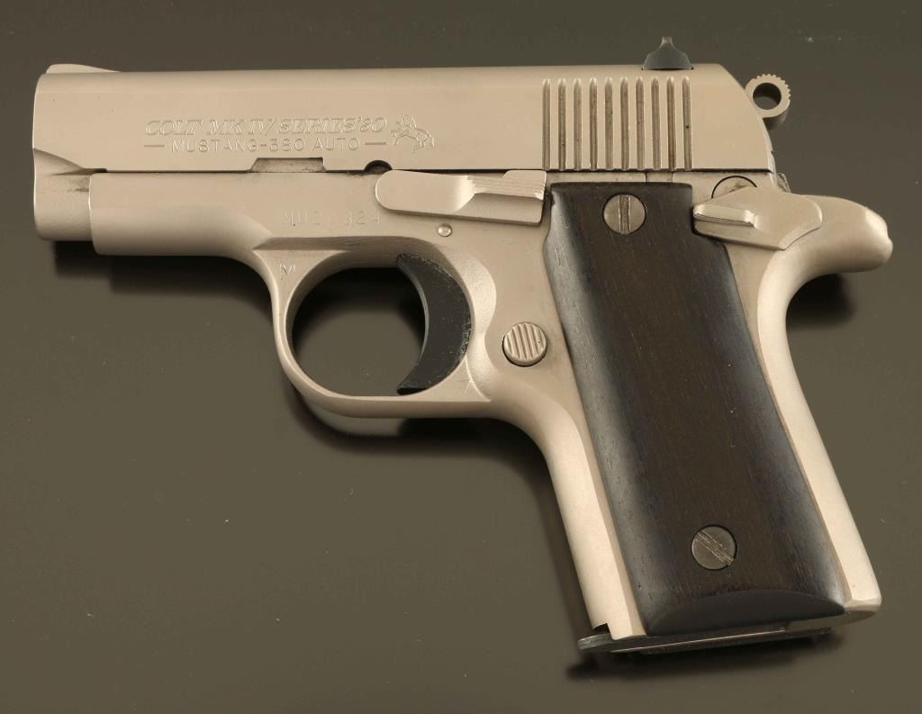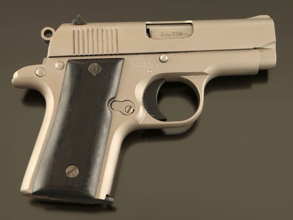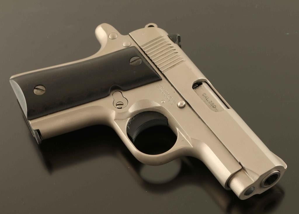 'MK IV/Series'80' Stainless steel single action semi-automatic pocket pistol chambered in .380 Auto. Features a matte finish, 2 3/4" barrel, fixed front sight, dovetailed rear sight, serrated trigger, serrated round hammer spur, push button magazine release, factory 5 round magazine, thumb safety on the left side of the frame, and custom two-piece smooth dark wood grips. Pistol exhibits very little wear with only a couple light scratches observed. Action is crisp, bore is excellent and wood grips are near fine with a small crack on the top of the right panel extending from the upper screw. Condition is NRA Excellent. ***Modern Firearm***