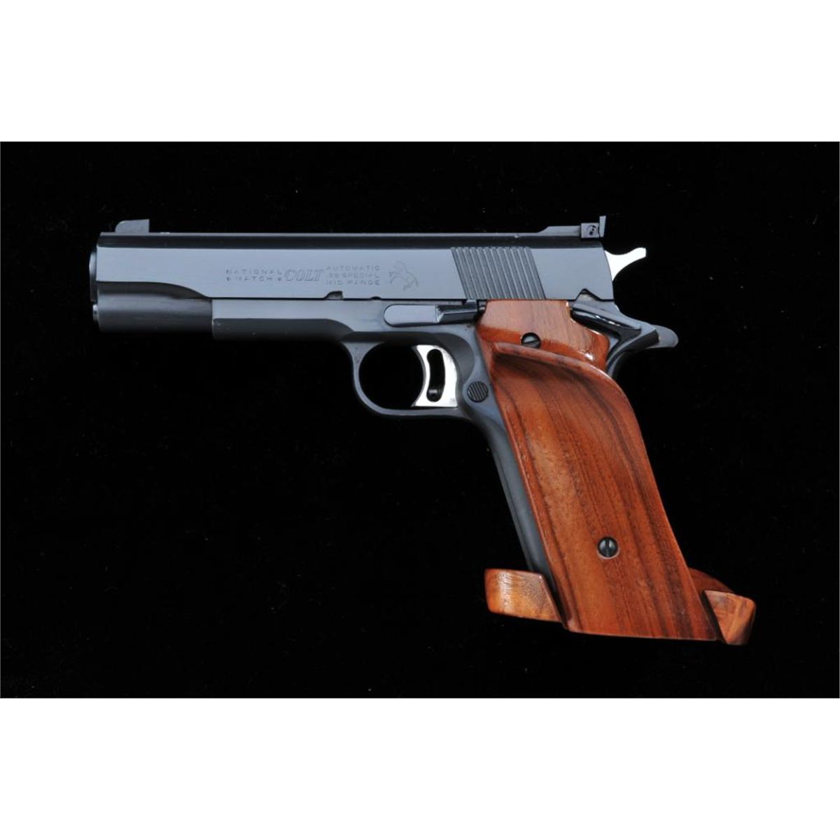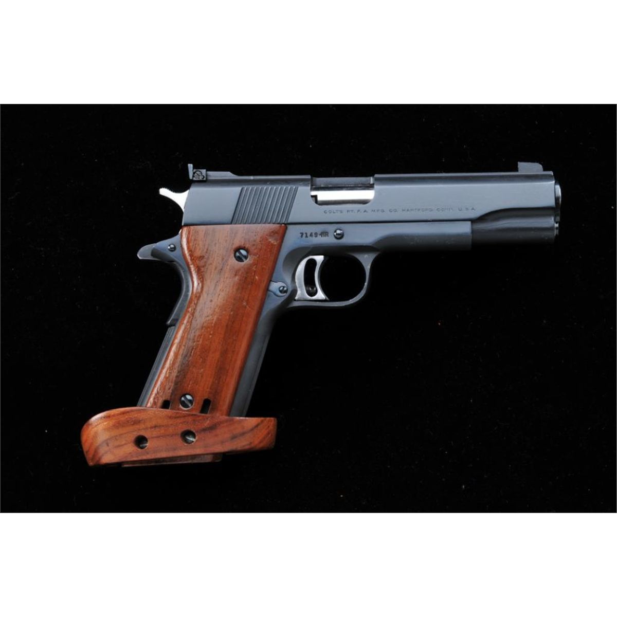 Colt National Match .38 Special Mid Range, semi-automatic target-grade pistol, serial #7149-MR. Blued finish, custom adjustable target grips, factory Colt-marked magazine. Fine to excellent used condition. All factory parts other than grips. 96-98% original finish, bright bore. Two extra magazines, not Colt marked. Est: $750 - $1,500