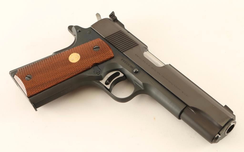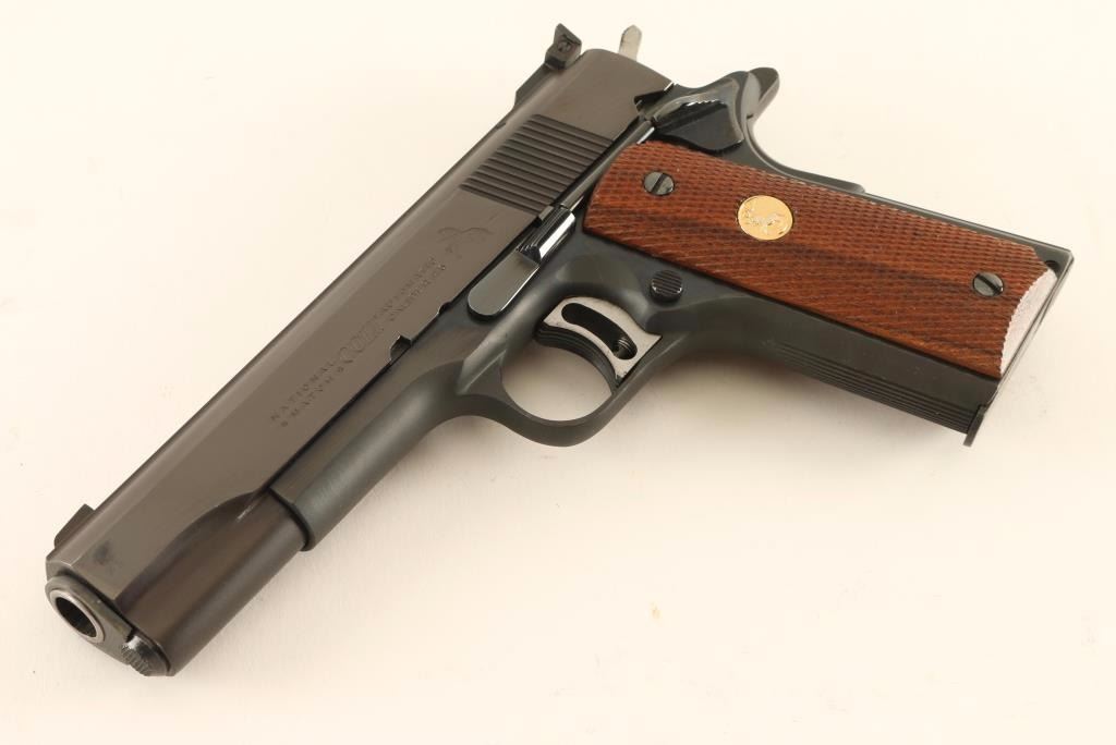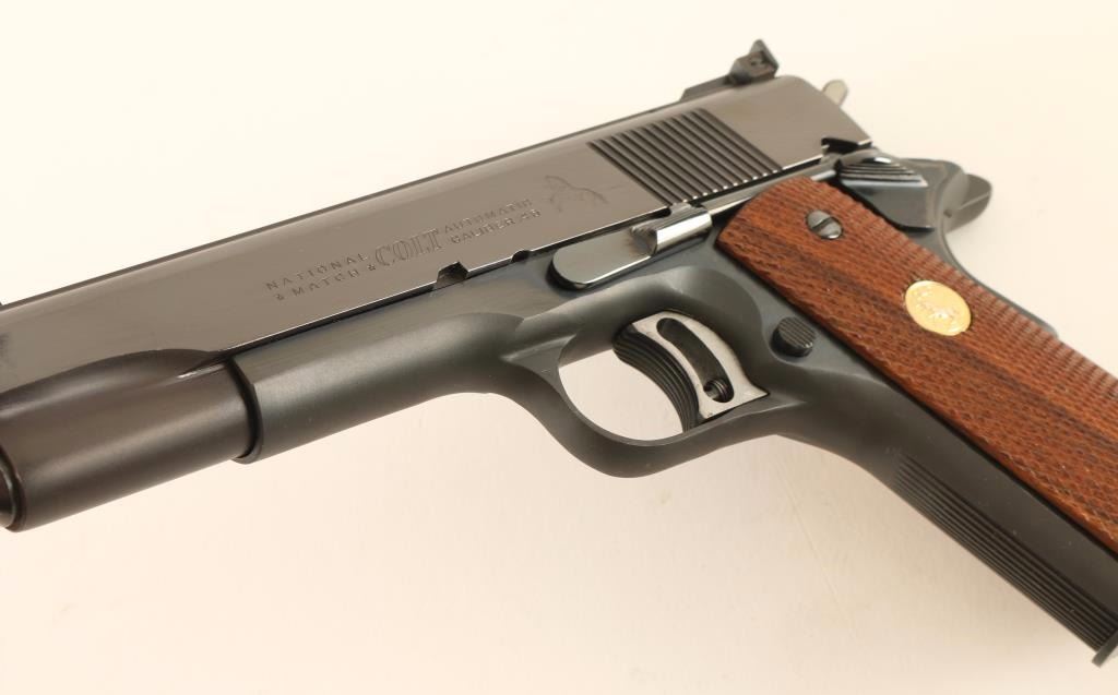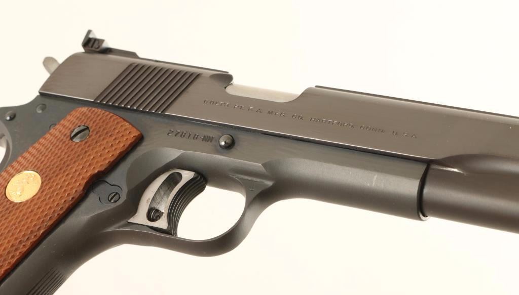 'Gold Cup' Vintage high quality 1911-A1 style semi-automatic pistol chambered in .45 Automatic, built for National Match competition circa 1968. Features a polished blued finish, 5" N.M. barrel, patridge front sight, Elliason adjustable rear window sight, serrated wide adjustable trigger, serrated hammer spur, thumb safety, beavertail grip safety, push button magazine release, 7 round magazine, serrated front strap, serrated flat mainspring housing and two-piece checkered walnut grips with gold Colt medallions. Pistol exhibits approximately 98% of it's blued finish overall showing light edge wear and handling marks on the slide that has turned plum. Action is smooth, bore is pristine and wood grips are fine.