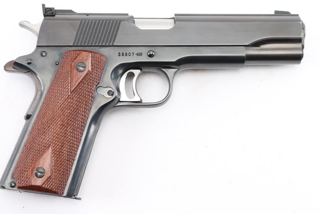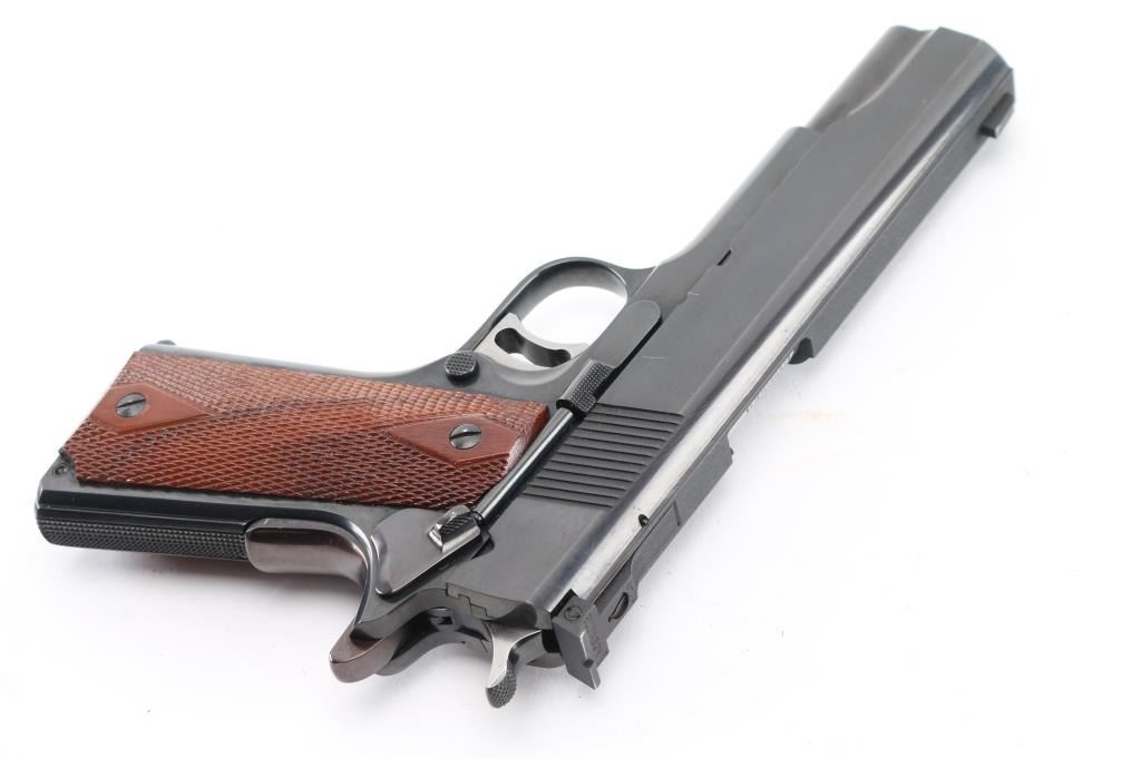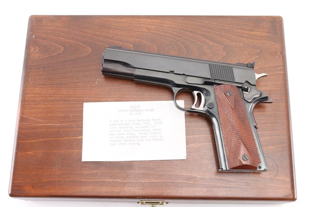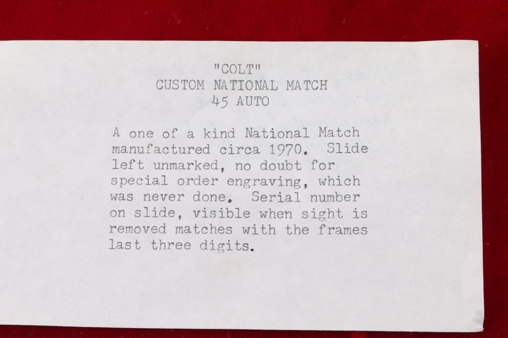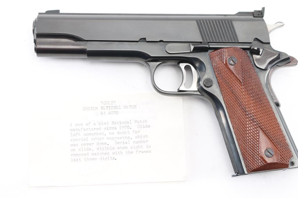 This custom 1911 platform National Match pistol in high polish blue finish. The Colt serial number puts it at 1970. Has a NM trigger, barrel marked " Colt .45 Auto N.M. MK. Vi, Series 70", correct checkered double diamond wood grips, Elliason adjustable rear sight. Serial number on frame, and last 3 digits of this number is on the slide, visible when sight is removed. These are the only markings on the pistol, no Colt roll stampings. Plum colored grip safety, flat knurled mainspring housing, serrated sighting rib on slide. We believe this is a special order pistol. Appears factory done. Should be further researched through Colt. The pistol itself is overall excellent, bore is pristine, grips are excellent, blue is about 98% with a couple of minor scratches, and very minor edge wear. Comes in a very nice Colt wooden case, form fitted red velvet lined. with gold "Rampant Colt" inside lid. "Colt" in circle on lid. Comes with a smooth mainspring housing. NRA Condition-Excellent. C&R Firearm.