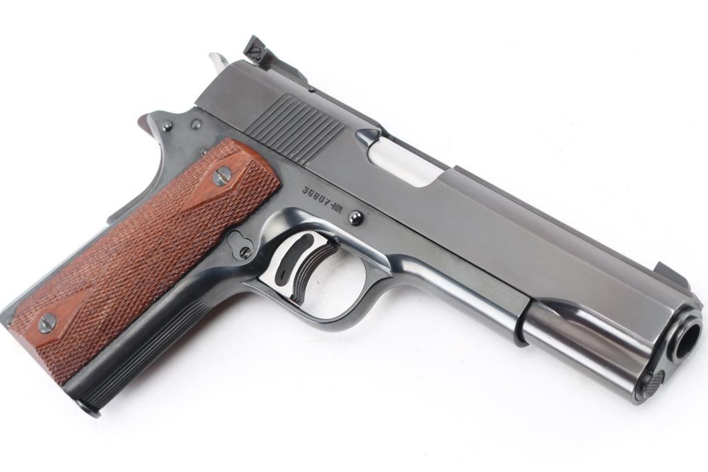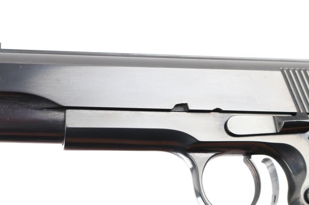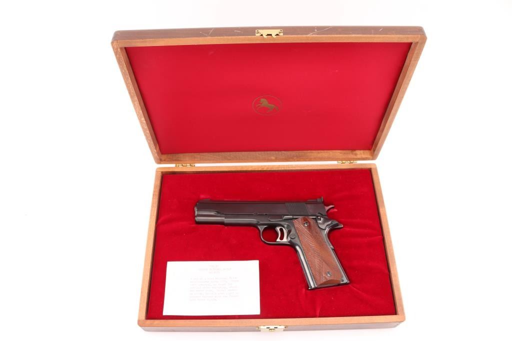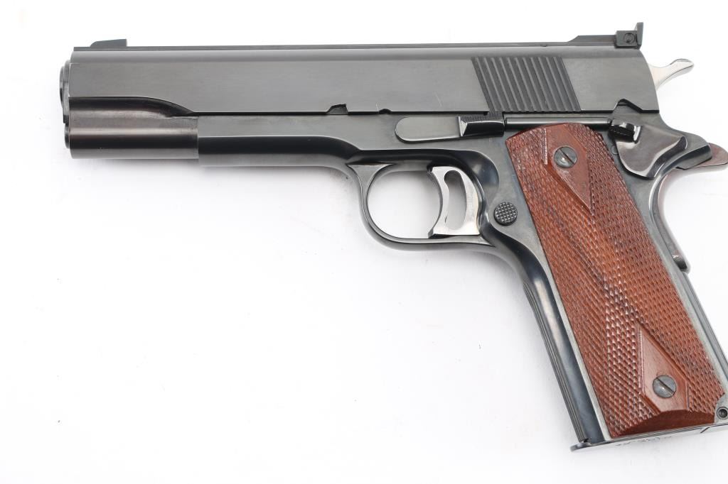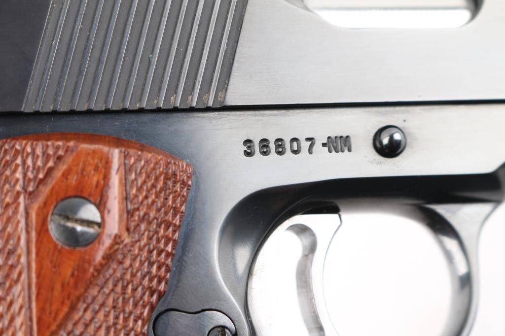 This custom 1911 platform National Match pistol in high polish blue finish. The Colt serial number puts it at 1970. Has a NM trigger, barrel marked " Colt .45 Auto N.M. MK. Vi, Series 70", correct checkered double diamond wood grips, Elliason adjustable rear sight. Serial number on frame, and last 3 digits of this number is on the slide, visible when sight is removed. These are the only markings on the pistol, no Colt roll stampings. Plum colored grip safety, flat knurled mainspring housing, serrated sighting rib on slide. We believe this is a special order pistol. Appears factory done. Should be further researched through Colt. The pistol itself is overall excellent, bore is pristine, grips are excellent, blue is about 98% with a couple of minor scratches, and very minor edge wear. Comes in a very nice Colt wooden case, form fitted red velvet lined. with gold "Rampant Colt" inside lid. "Colt" in circle on lid. Comes with a smooth mainspring housing. NRA Condition-Excellent. C&R Firearm.