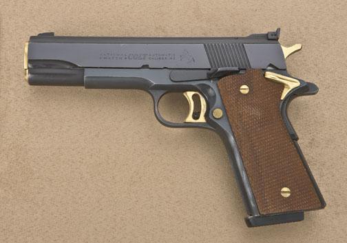 Colt National Match semi-auto pistol, .45 cal., 5” barrel marked “Colt .45 Auto N.M.”; polished blue slide and mat blue frame, customized gold accented lightened adjustable trigger, gold accented magazine release,slide safety, barrel bushing and hammer; checkered custom ambidextrous “swelled” thumb rest wood grips, #26414-NM. This gun is in overall excellent condition showing approx. 98% original finish, fine bore, crisp action, sharp markings, excellent custom grips with weighted Pachmayr magazine and Elliason adjustable rear sight. Est.: $600-$1,250.
