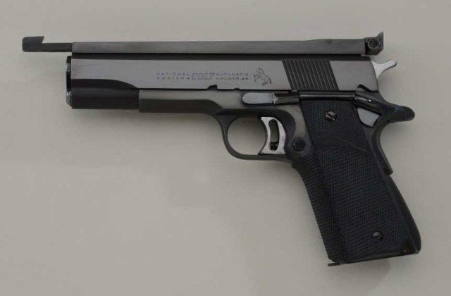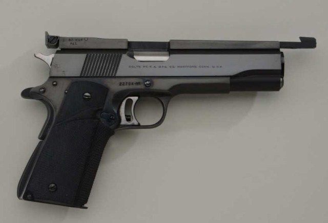 Colt National Match semi-auto pistol, .45 cal., extended front sight, adjustable trigger, Pachmayr wrap-around grips, extra magazine, .22 conversion kit included, all in fine condition, National Match #22784-NM.Est.: $500-$1,000.