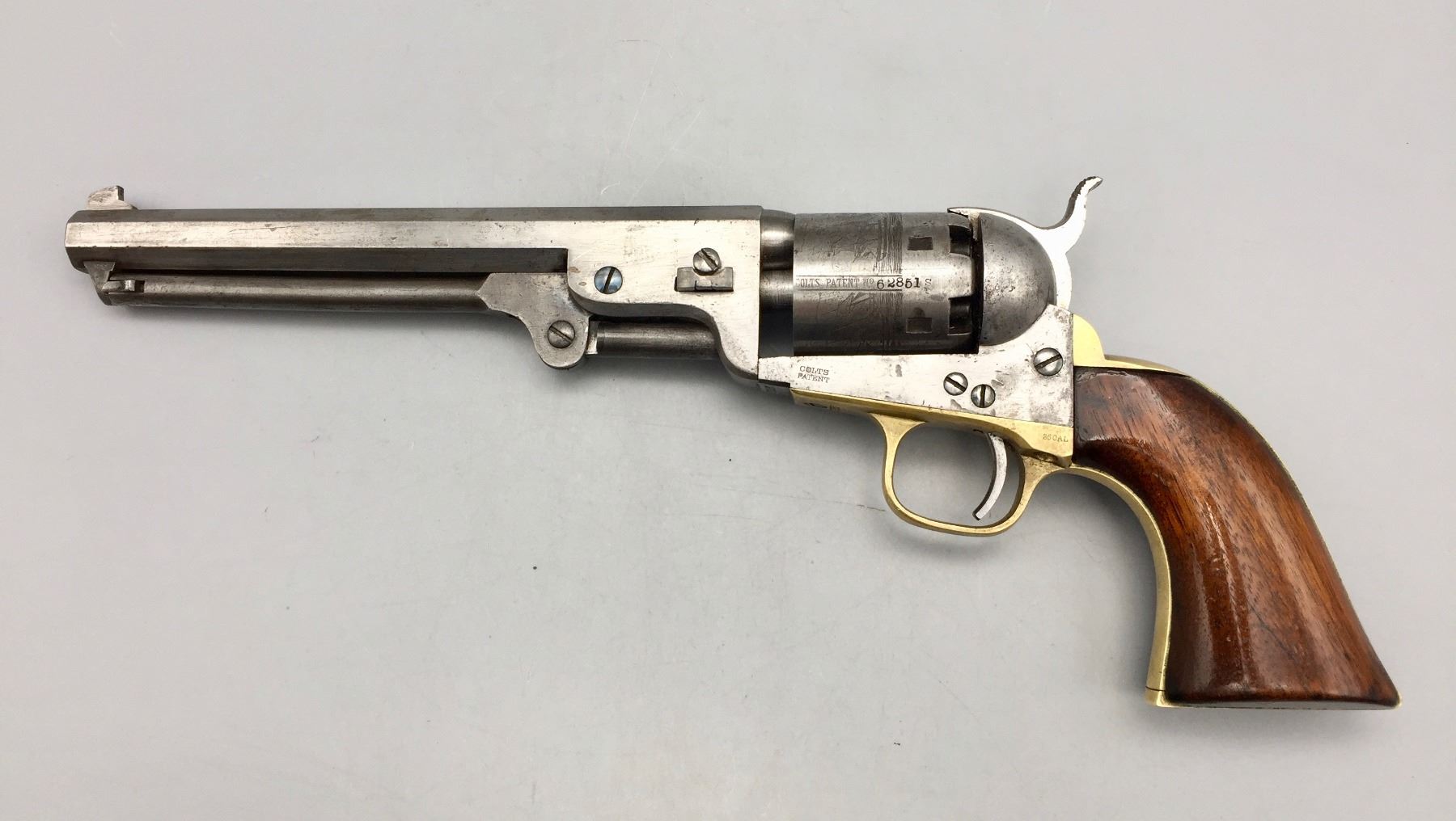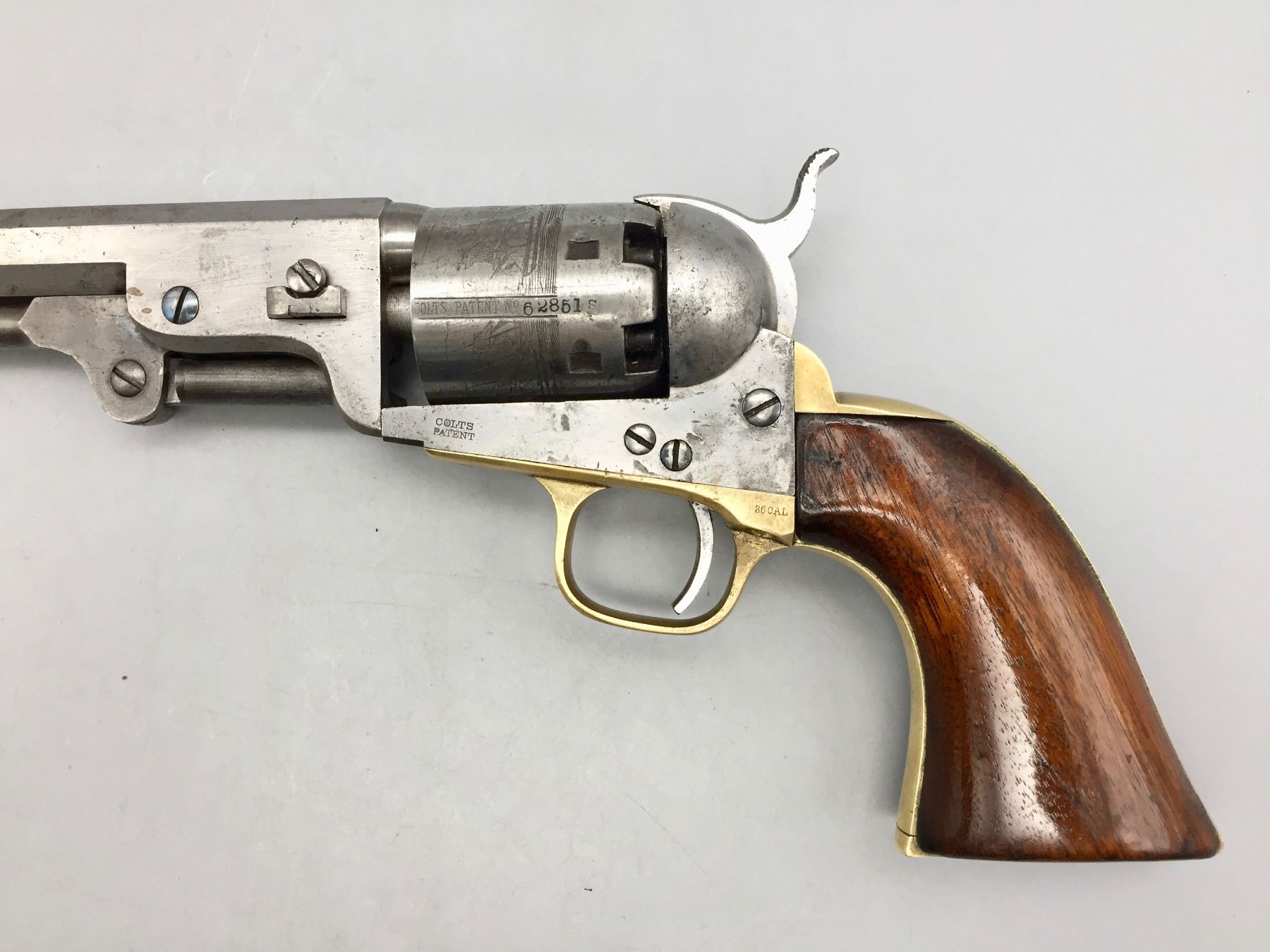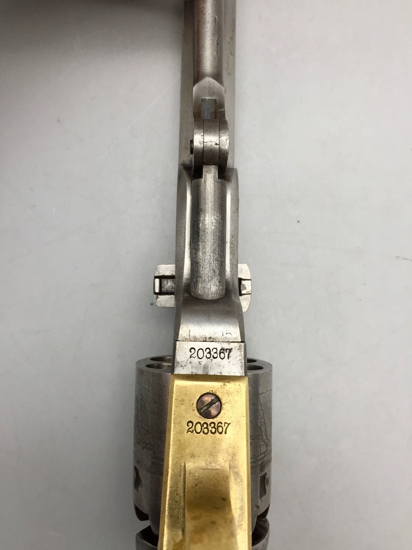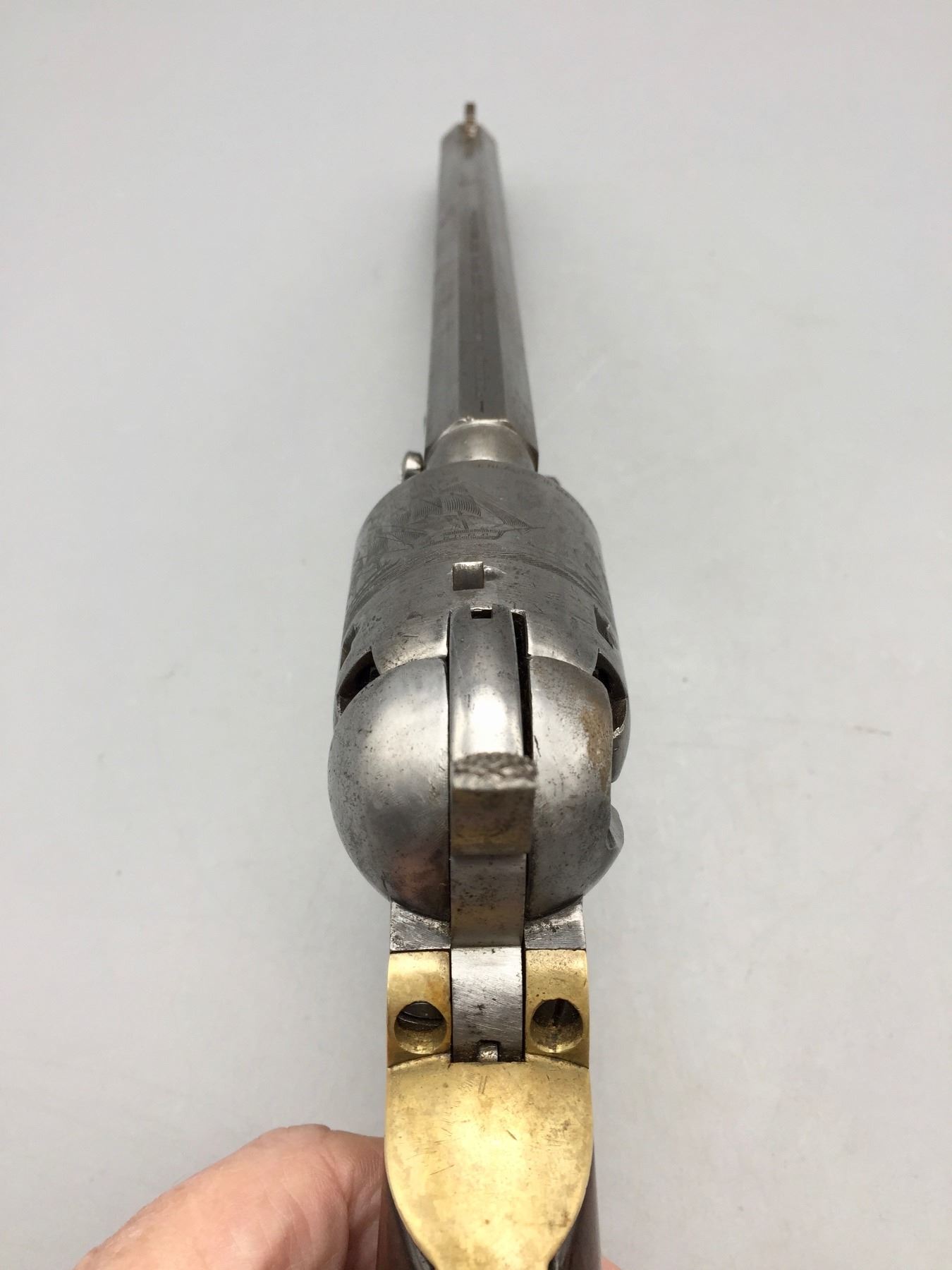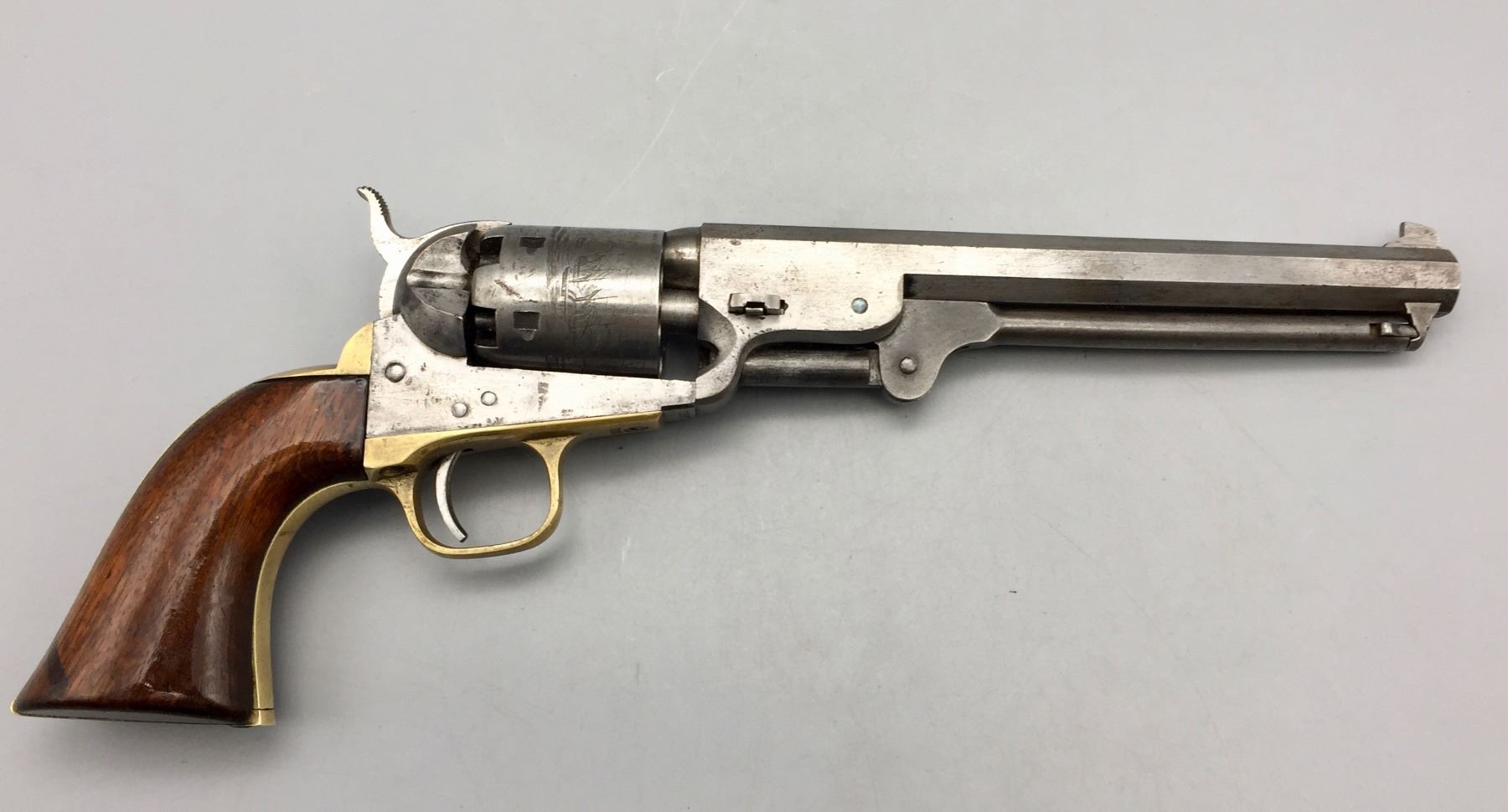 Description: For your consideration we offer this antique Colt Navy, percussion cap revolver in .36 caliber. It has a visible scene on the cylinder still. The frame, trigger guard and butt strap all have matching serial numbers, but the barrel does not. Maker: Colt’s PT. F.A. Mfg. Co., Hartford, Conn. Approx. Age: 1867. Size: 7.5” barrel. Condition: Fair for its age, wear expected. Seems like it cycles properly. Not much finish left. Please look closely at the pictures - they are an important part of our description. Shipping: There will be a $10 handling / packaging fee for shipping this lot. The actual cost of postage will be added on top of that.