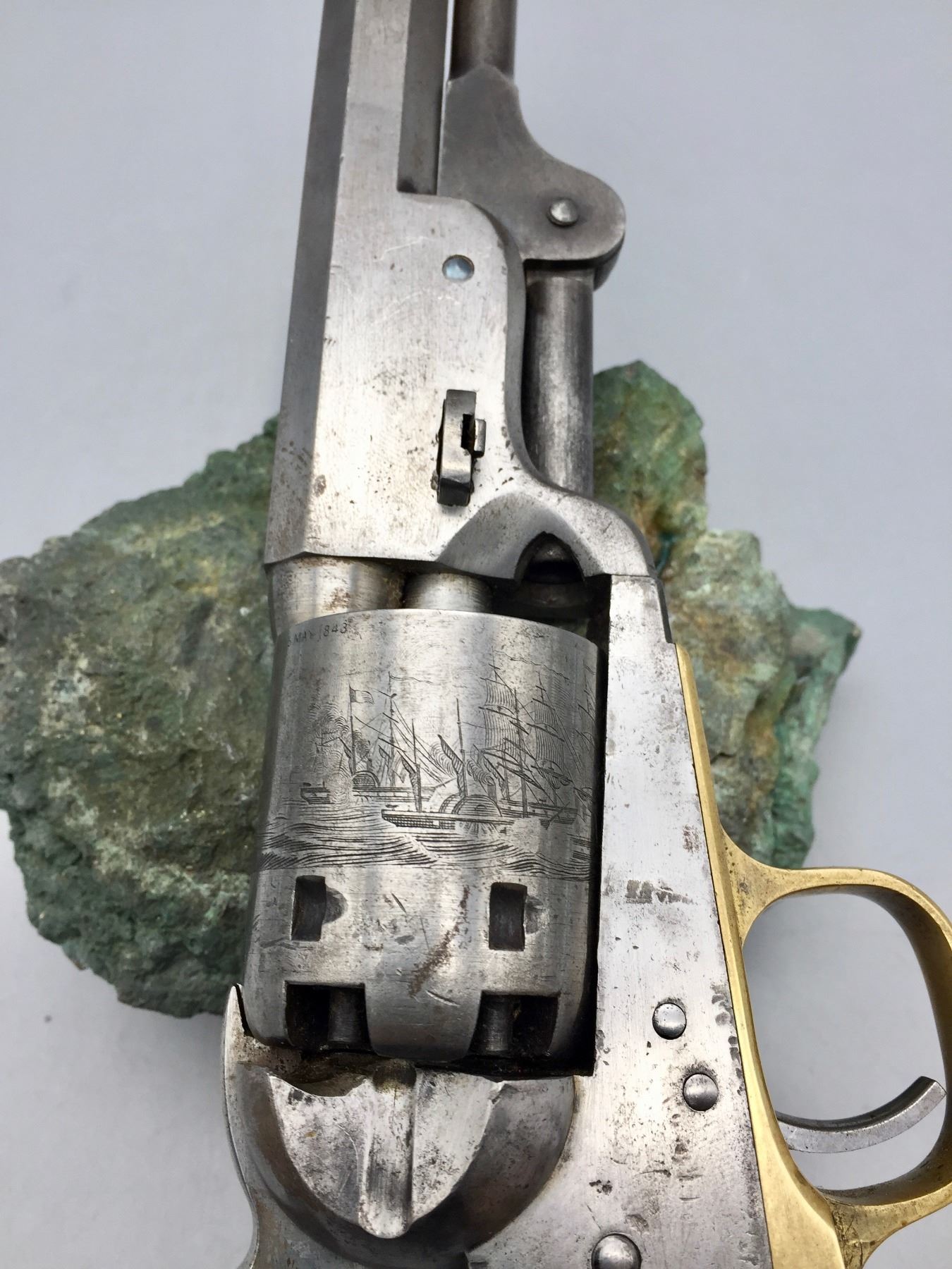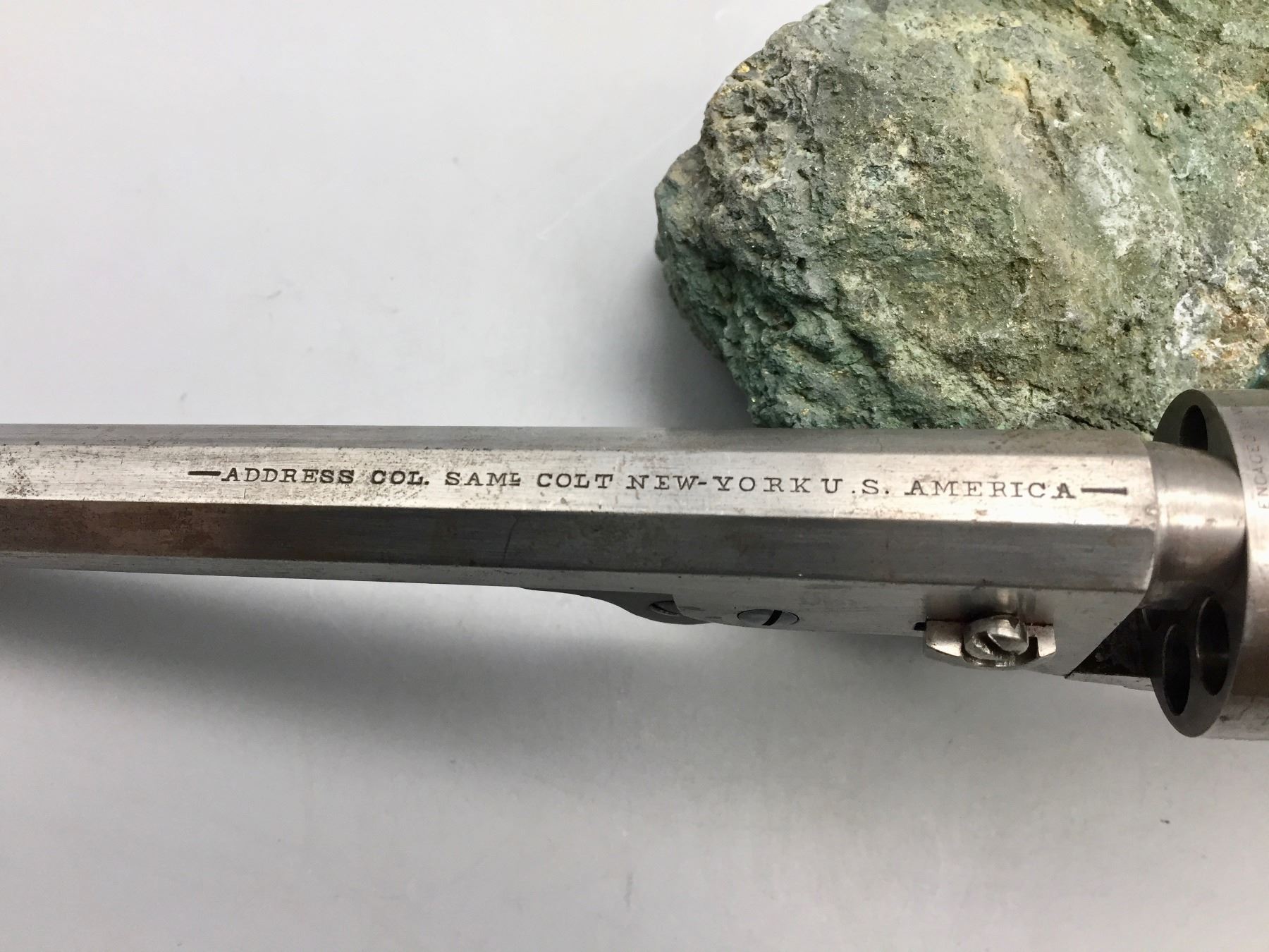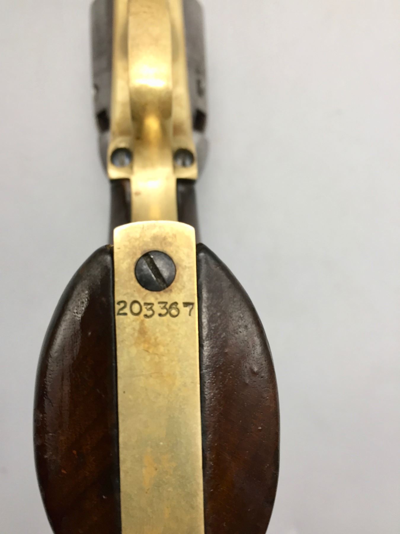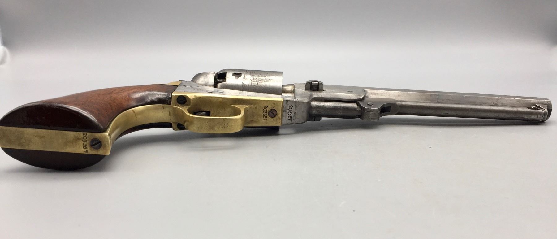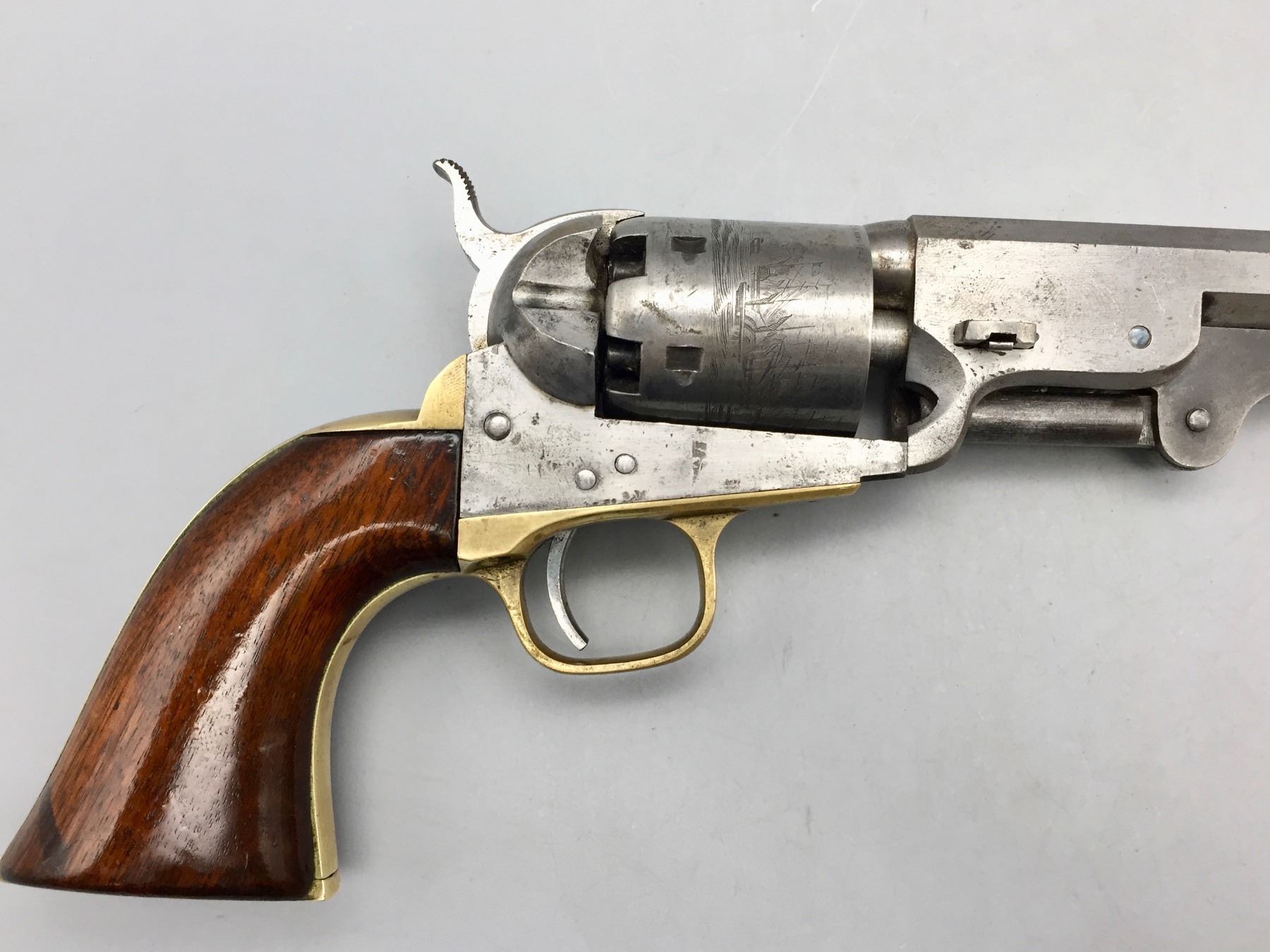 Description: For your consideration we offer this antique Colt Navy, percussion cap revolver in .36 caliber. It has a visible scene on the cylinder still. The frame, trigger guard and butt strap all have matching serial numbers, but the barrel does not. Maker: Colt’s PT. F.A. Mfg. Co., Hartford, Conn. Approx. Age: 1867. Size: 7.5” barrel. Condition: Fair for its age, wear expected. Seems like it cycles properly. Not much finish left. Please look closely at the pictures - they are an important part of our description. Shipping: There will be a $10 handling / packaging fee for shipping this lot. The actual cost of postage will be added on top of that.