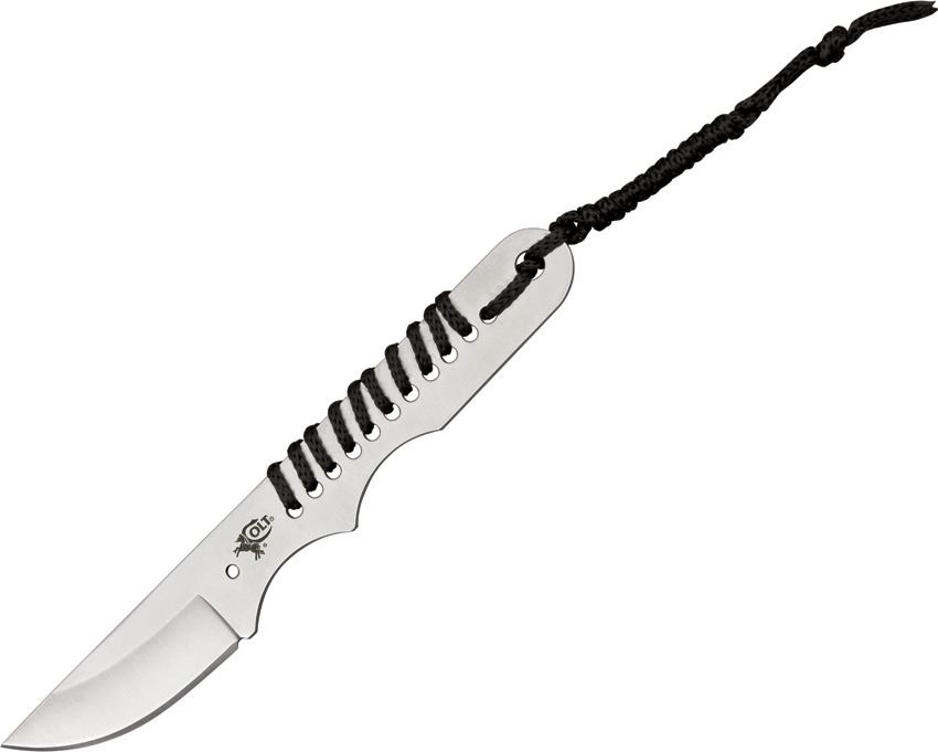 6" overall. 2 1/4" blade. One piece stainless construction. Handle has drilled holes which have black paracord weave and lanyard. Beaded neck chain. Black nylon pouch with ring which can be attached to neck chain.