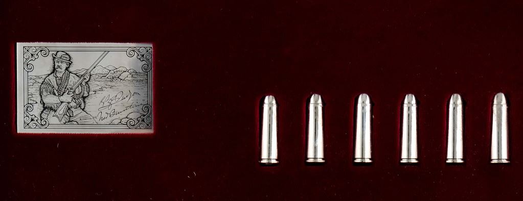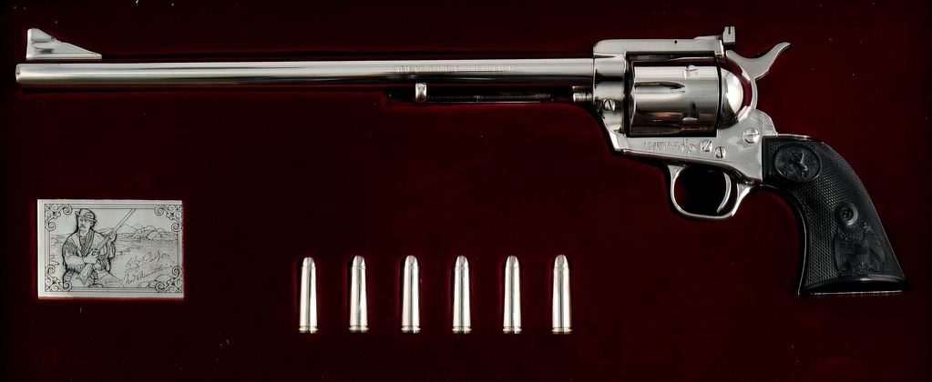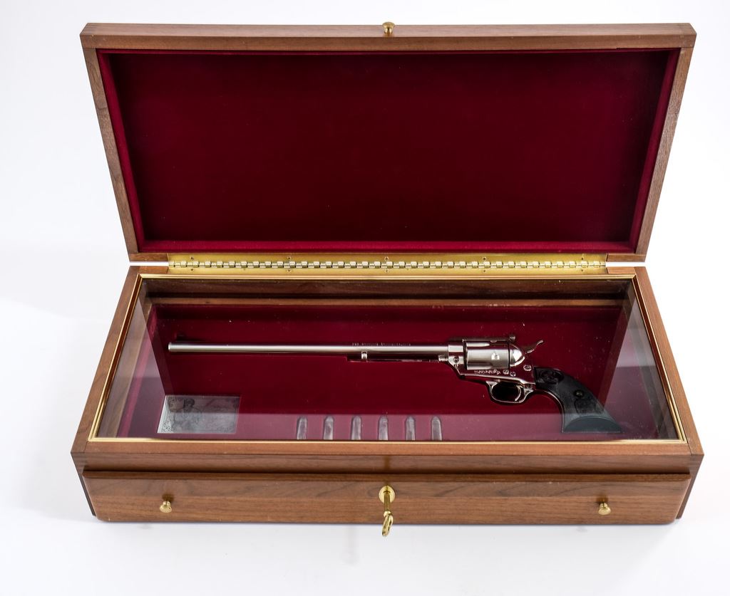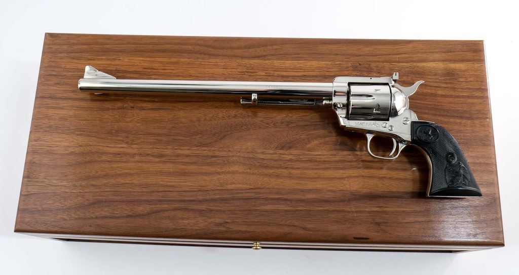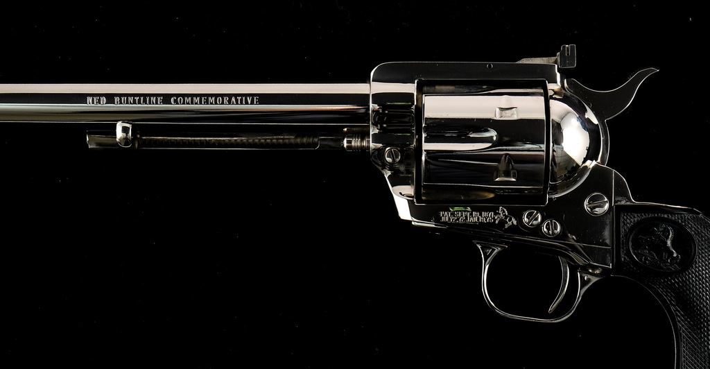 Colt Commemorative saluting literary great Ned Buntline and his alleged gift to Wyatt Earp and company. No proof has ever come about that this transaction actually occurred however the "Buntline Special" was born and remains a western classic firearm. This series was made in 1979, of which only 300 were produced. The 12" nickel barrel provides a grand scene as the lid to the presentation case is opened. the entire gun is nickel plated including the special target rear sight. Black synthetic grips with Colt motif and eagle crest. Case has protective glass over a red velvet lined interior. Includes six .45 colt rounds (not original). *Ship to FFL Only Condition: Unfired, as new. Only issues observed are a couple of cloudy spots, likely preservative on the nickel. Appears to come clean with polish cloth. Case has storage scuffs and scratches.