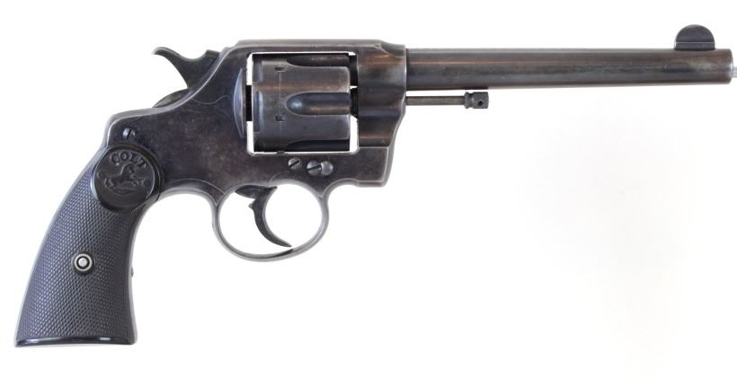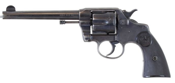 Colt New Army .38 SN 283589 double action revolver with 6" barrel, blued finish and Colt hard rubber grips. Revolver shows approx. 40-50% original finish with very good grips, an excellent action and nice bore. Made in 1907. De Accessioned from a staterevolver with 6" barrel, blued finish and Colt hard rubber grips. Revolver shows approx. 40-50% original finish with very good grips, an excellent action and nice bore. Made in 1907. De Accessioned from a state of AZ Museum. FFL/Modern. Est. 250-400