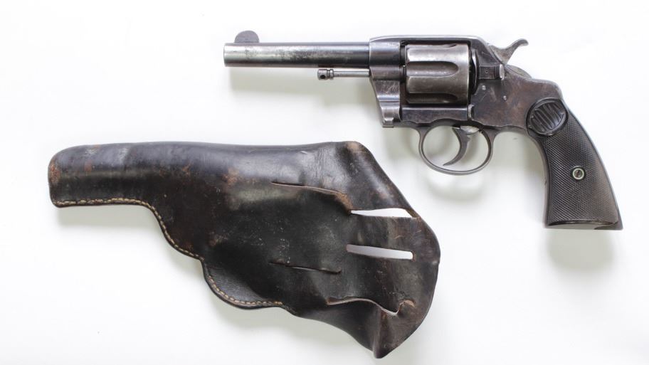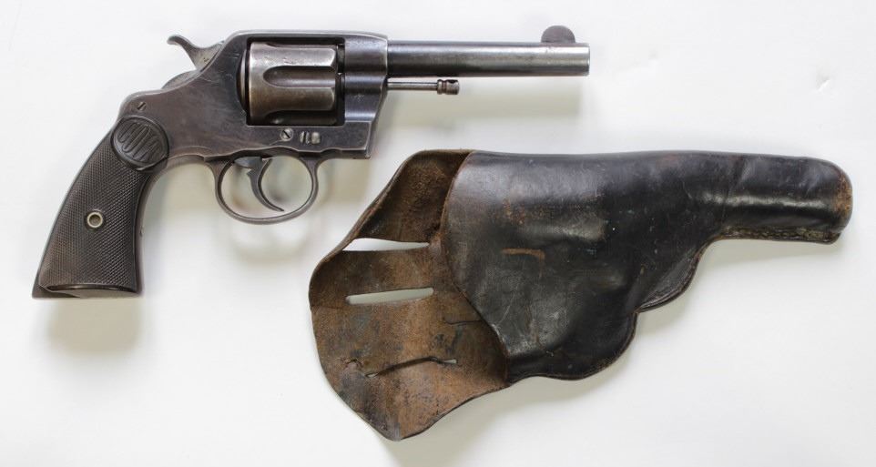 Colt New Army .38 cal SN 31737 double action revolver blue finish, 4 1/2" barrel with Colt hard rubber checkered grips. Fair condition showing two large chips on bottom of grips, loss and scattered areas of light pitting to the finish. Mechanically tightdouble action revolver blue finish, 4 1/2" barrel with Colt hard rubber checkered grips. Fair condition showing two large chips on bottom of grips, loss and scattered areas of light pitting to the finish. Mechanically tight the bore showing light erosion that may clean with strong rifling. Includes holster. Made in 1895, Antique. Est. 200-375