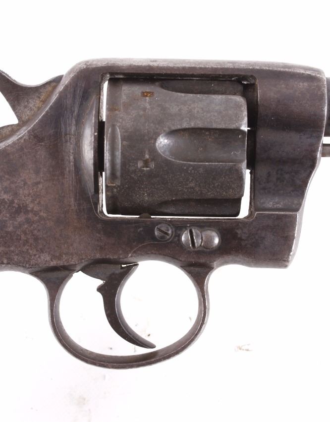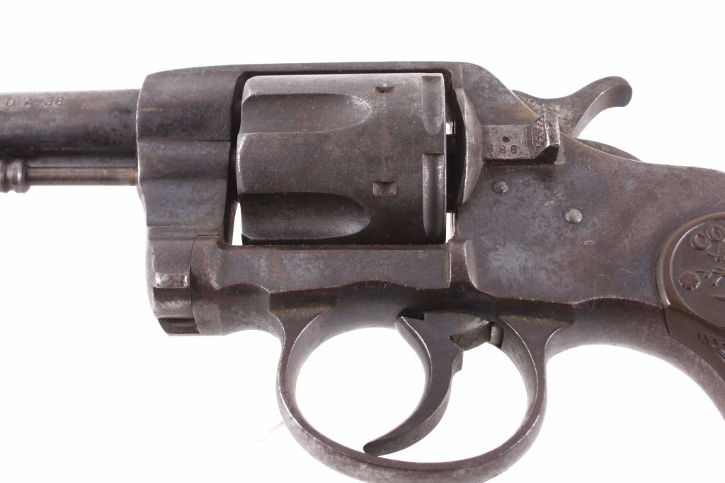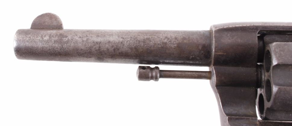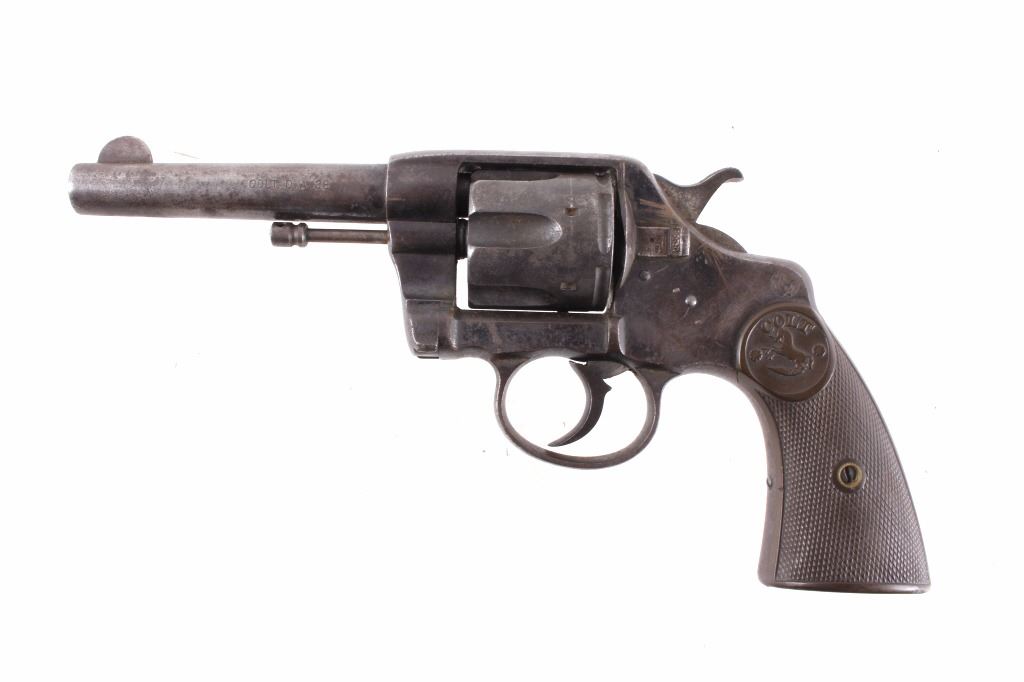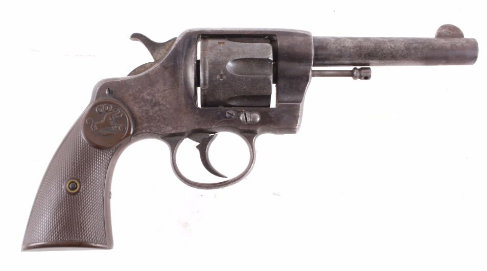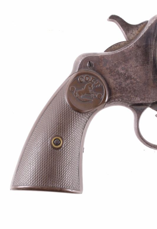 This is an early Colt Model New Army & Navy double action revolver in a 38 Special caliber. The revolver shows a blue finish (with much loss) with rare original Colt prancing pony marked hard rubber grips and a 4 1/2 inch round barrel. The revolver has a serial number of 128658 and was manufactured in 1899. Curio & Relic Handgun FFL Transfer or NICS Background required.