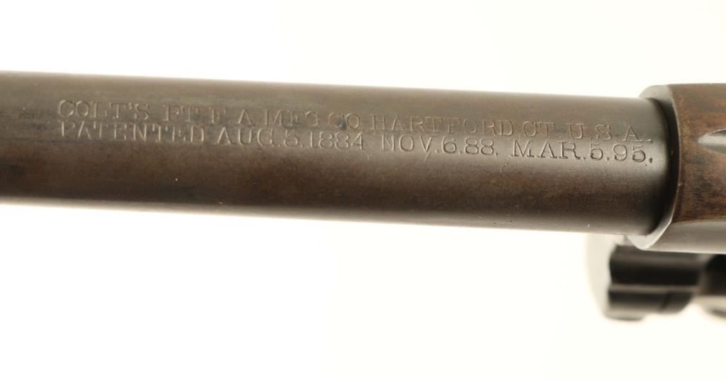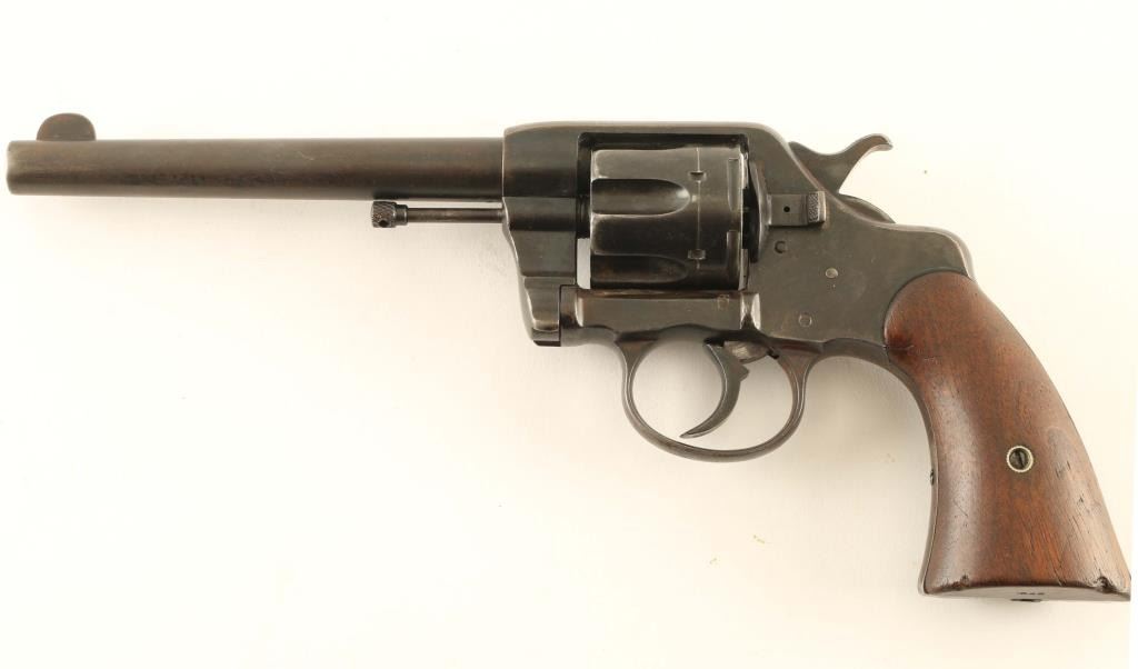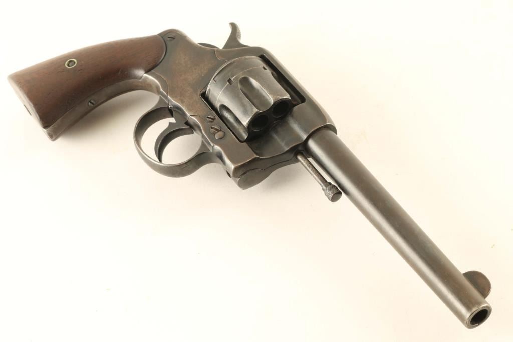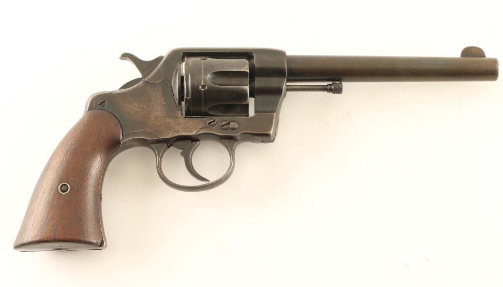 US Military revolver features 6" barrel, fixed sights, swing-out 6 shot cylinder, single/double action. Bore is fair to good condition with visible pitting and minor roughness, strong rifling. Cylinder charge holes are fair to good with little roughness. Retains 75% dark brownish gray finish, thinning on right side of frame & on front strap, bare metal showing at high spots, holster wear at muzzle. Grips are good or better condition walnut, small dents and gouges, fit to frame is good. Cylinder can rotate with trigger at rest and when hammer is cocked, locks up tight when trigger is held to rear. with hammer down. Action operates smoothly. Markings include "RAC" on grips. Bottom of frame is smooth with no markings, lanyard ring removed and hole is plugged. Number on crane matches number inside frame. Condition is NRA Fair *** Antique Firearm ***