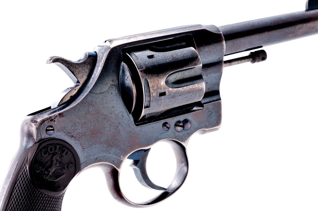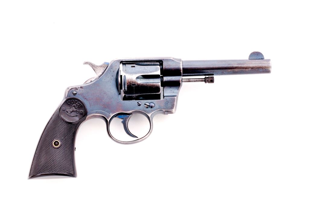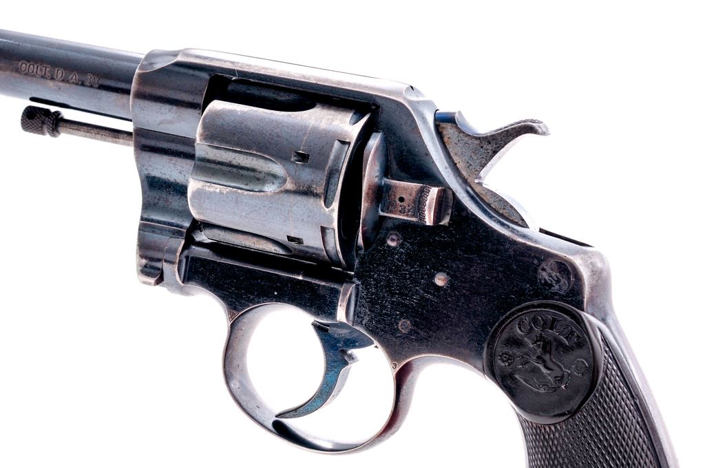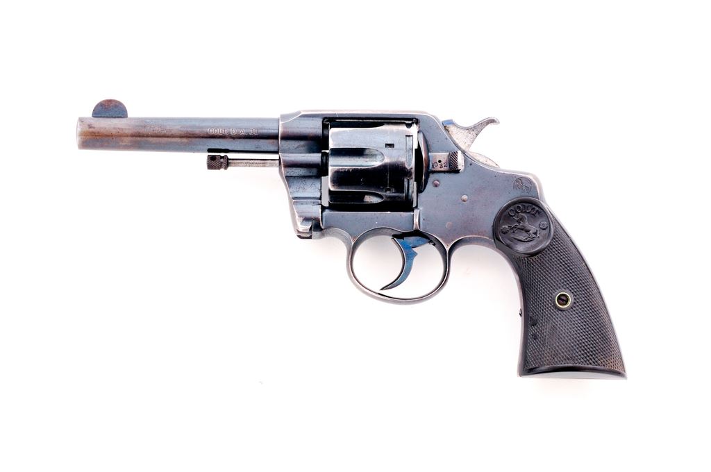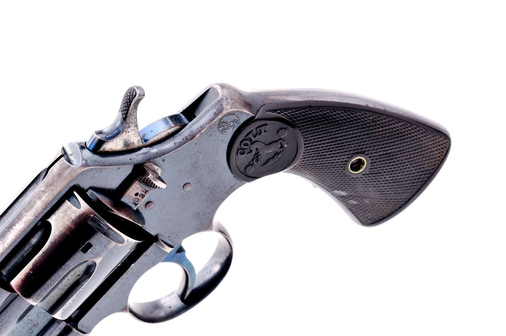 Colt New Army/Navy Double Action Revolver, #273523, .38 cal., 4.5'' barrel, blue finish, checkered hard rubber Colt grips, hammer and trigger with niter blue finish, and standard sights. Top of barrel is marked in three lines ''Aug. 5, 84-Nov. 6, 88 & Mar. 5, 95'' patent dates. Mfg'd 1907. Condition is very good with approx. 65%-70% blue finish, showing some areas of toning and light surface freckling. Right grip is really nice for its age and rates excellent; left grip with a few flat spots to the checks. Good action with a smooth hammer and trigger; cylinder with a little excess movement. Bore is very good with plenty of rifling left, showing moderate wear. Est.: $350-$550. (C&R/PPT)