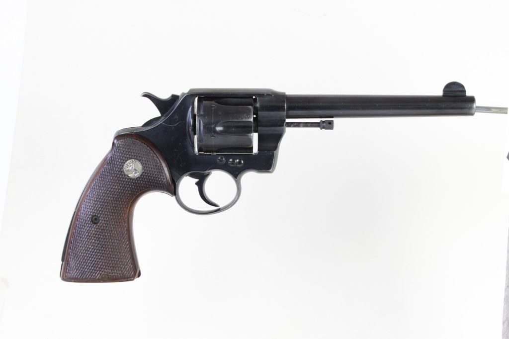 Colt New Army and Navy .38 SN 3123 double action revolver with 6" barrel showing poorly refinished blue with incorrect later Colt walnut grips. Mechanically excellent with firm tight action and good bore. De Accessioned from a state of AZ Museum. FFL /double action revolver with 6" barrel showing poorly refinished blue with incorrect later Colt walnut grips. Mechanically excellent with firm tight action and good bore. De Accessioned from a state of AZ Museum. FFL / Modern. Est. 175-275