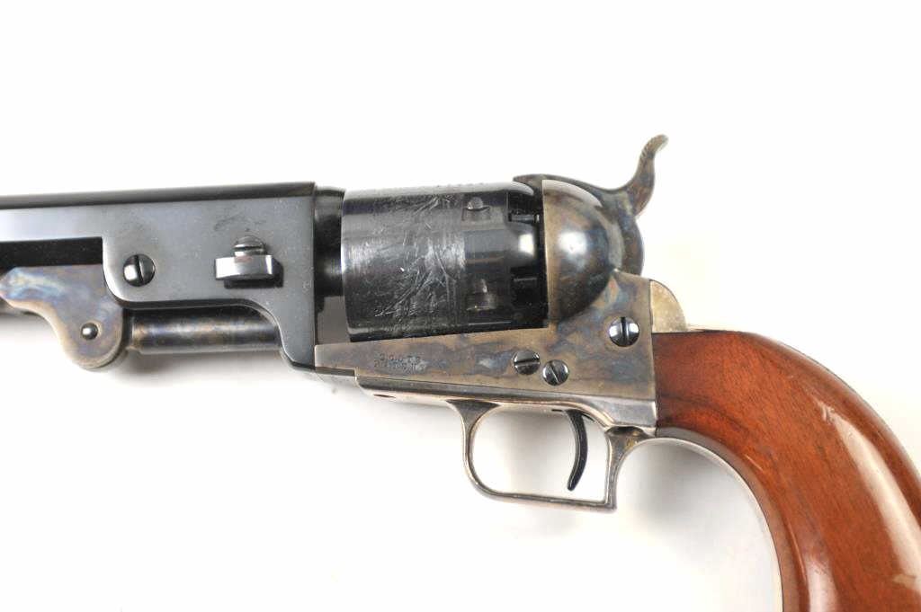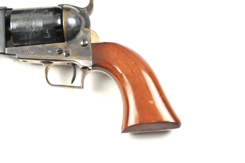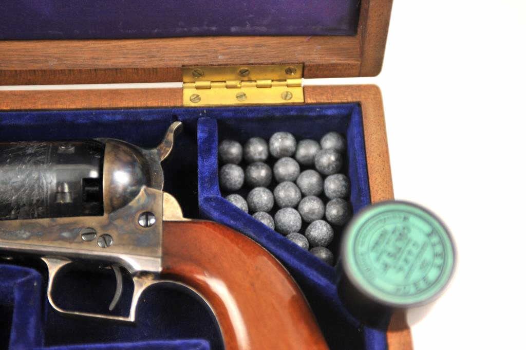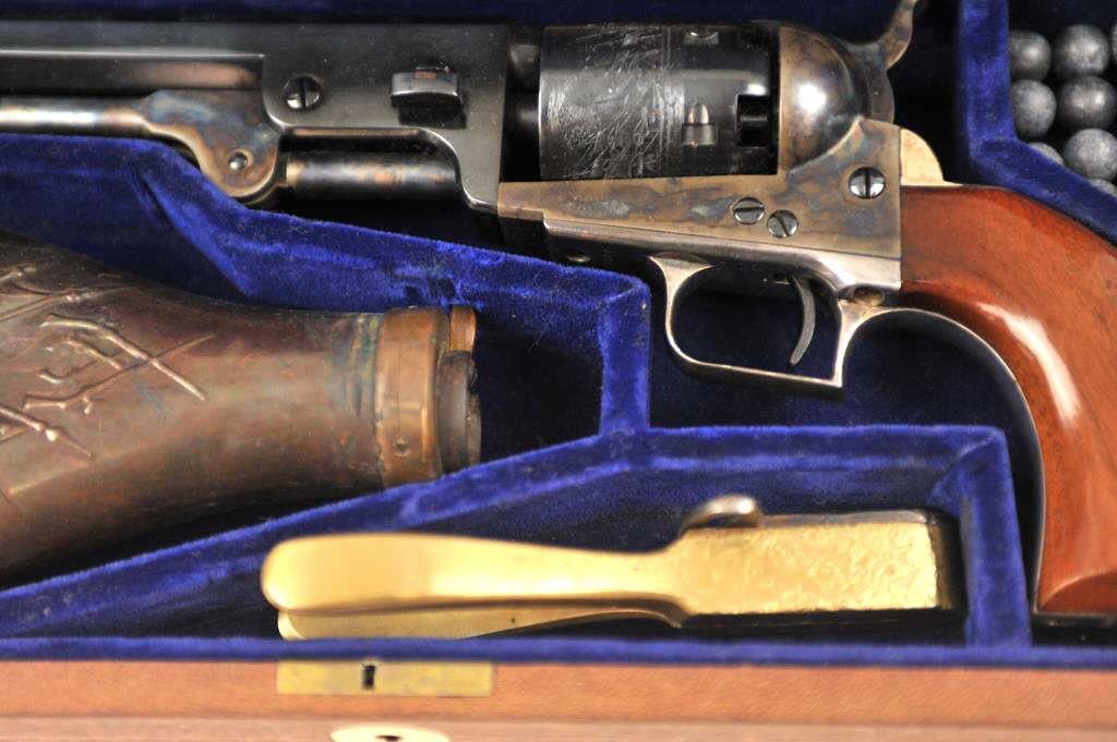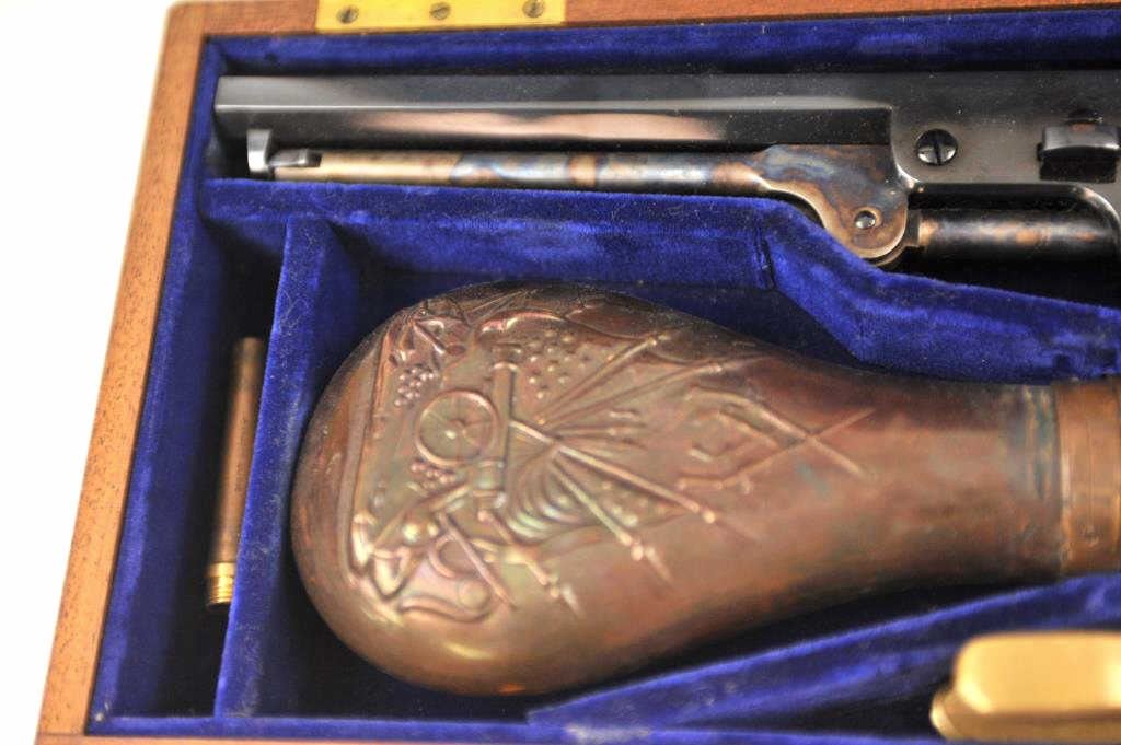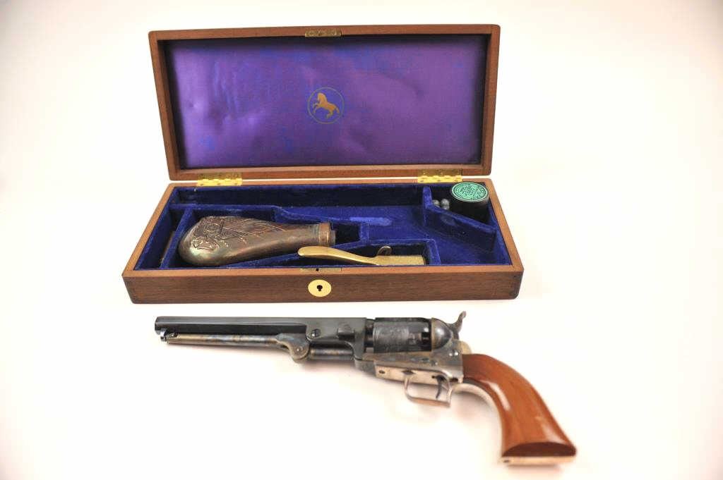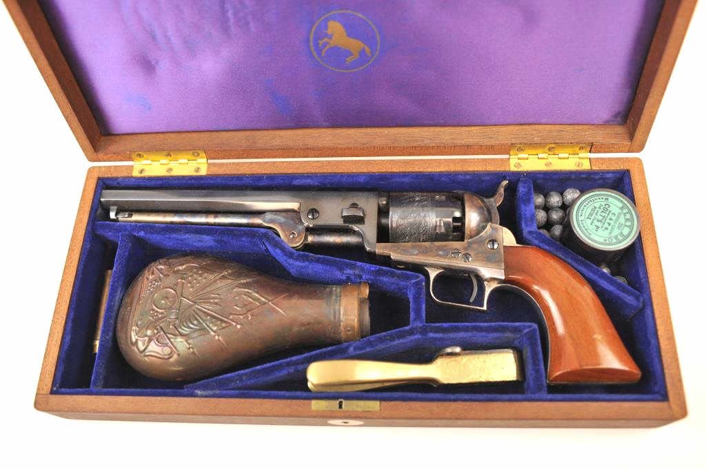 Colt New Black Powder series 1851 Navy percussion pistol, .36 caliber, Serial #11704. The pistol is as new in a hardwood presentation case with all accessories. The pistol retains approximately 99% of the highpolish blue finish with sharp edges. The cylinder scene is 99% complete and the rammer, frame and hammer are vividly case hardened. The straps are silver plated with a square back trigger guard. The smooth wood grips are in excellent condition with light handling marks. The dark wood factory case has a brass Colt emblem on the lid with blue velveteen interior and royal satin on the lid with embossed Colt emblem. The caseincludes a mold, cap tin, powder flask and lead balls. Made in the 1970’s these Colts were well constructed and finished. Est.: $400-$800.