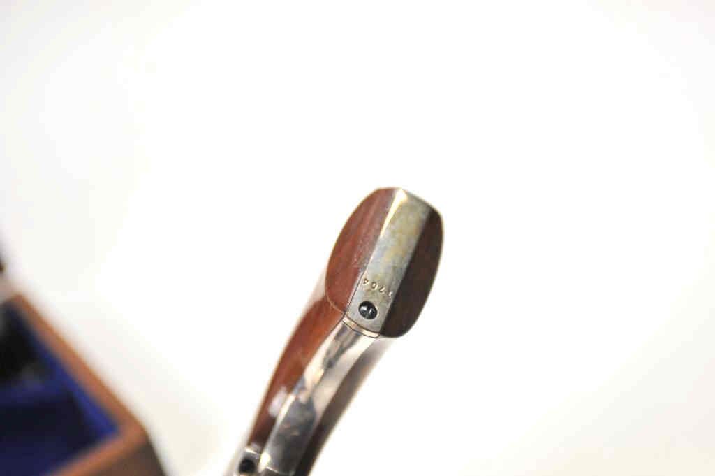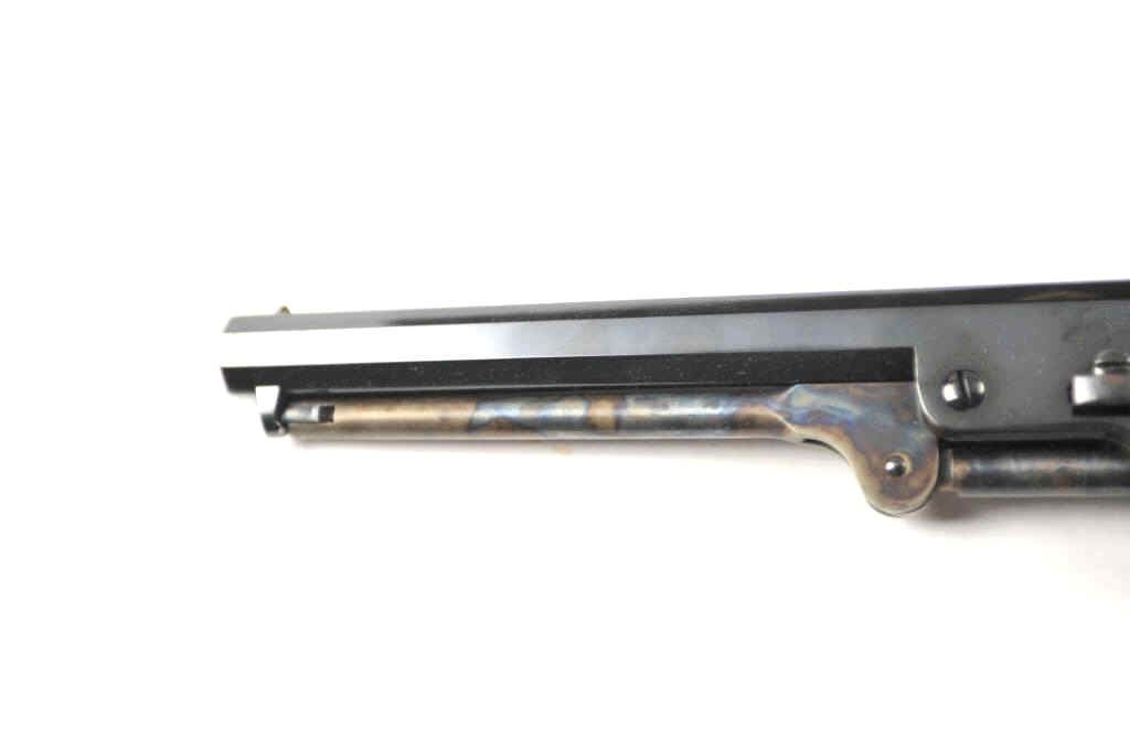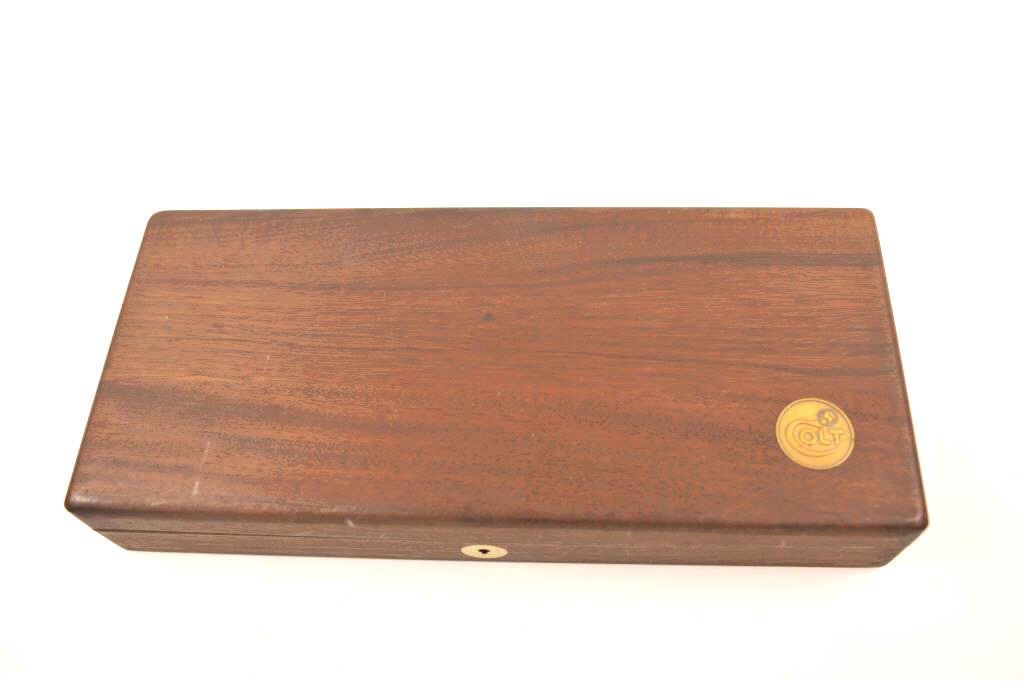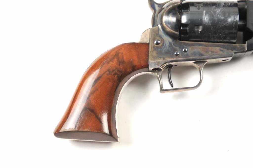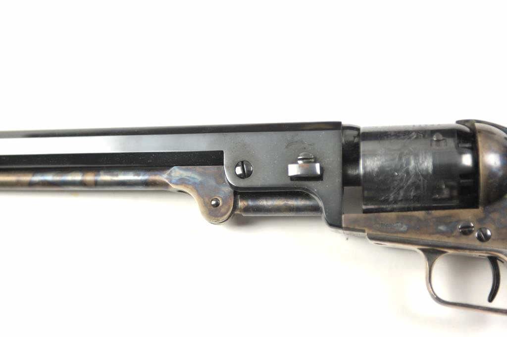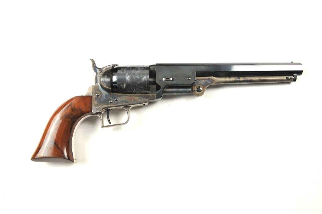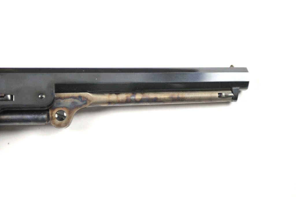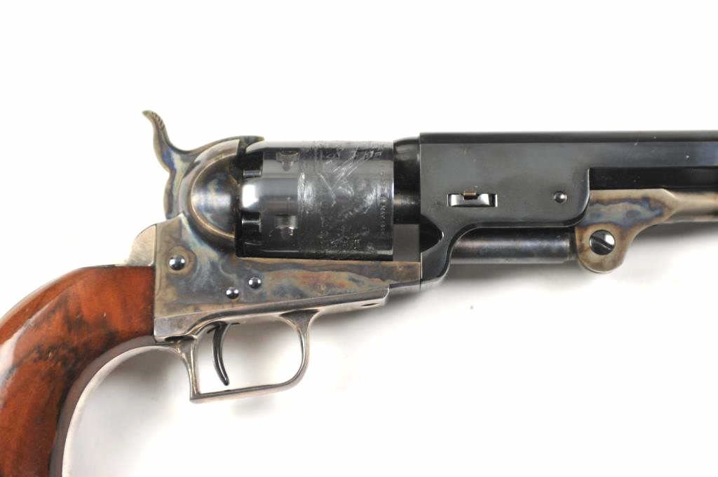 Colt New Black Powder series 1851 Navy percussion pistol, .36 caliber, Serial #11704. The pistol is as new in a hardwood presentation case with all accessories. The pistol retains approximately 99% of the highpolish blue finish with sharp edges. The cylinder scene is 99% complete and the rammer, frame and hammer are vividly case hardened. The straps are silver plated with a square back trigger guard. The smooth wood grips are in excellent condition with light handling marks. The dark wood factory case has a brass Colt emblem on the lid with blue velveteen interior and royal satin on the lid with embossed Colt emblem. The caseincludes a mold, cap tin, powder flask and lead balls. Made in the 1970’s these Colts were well constructed and finished. Est.: $400-$800.