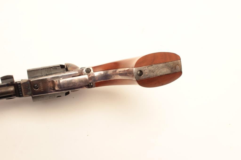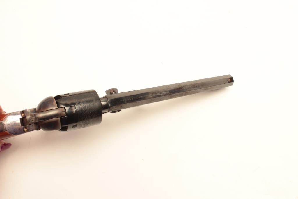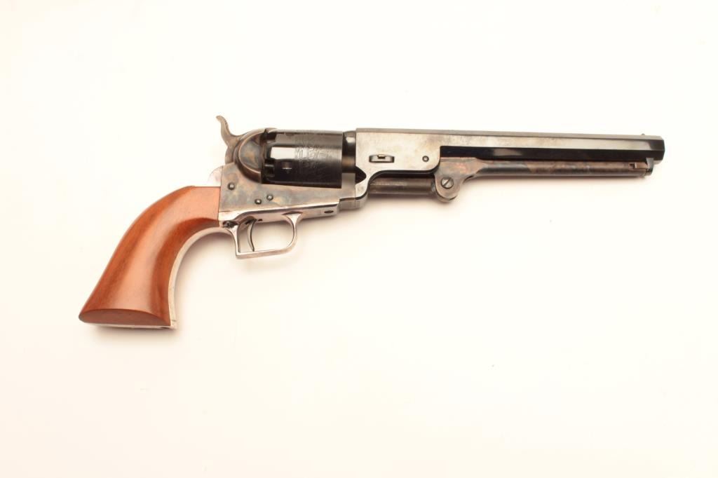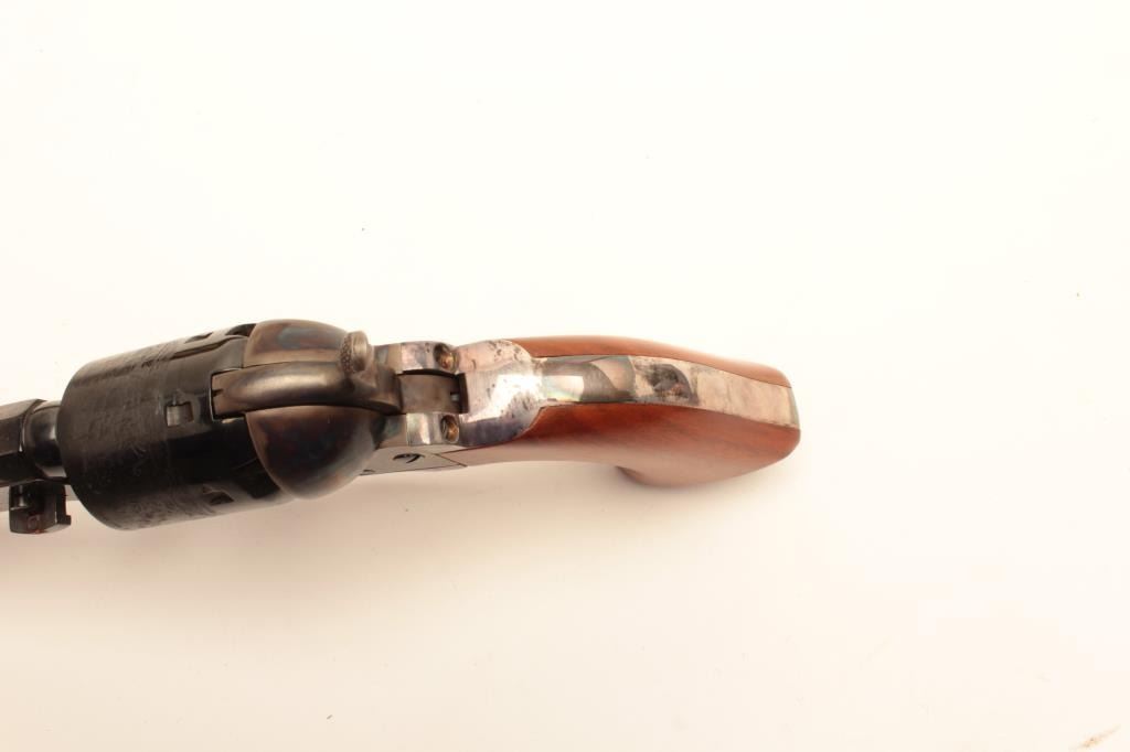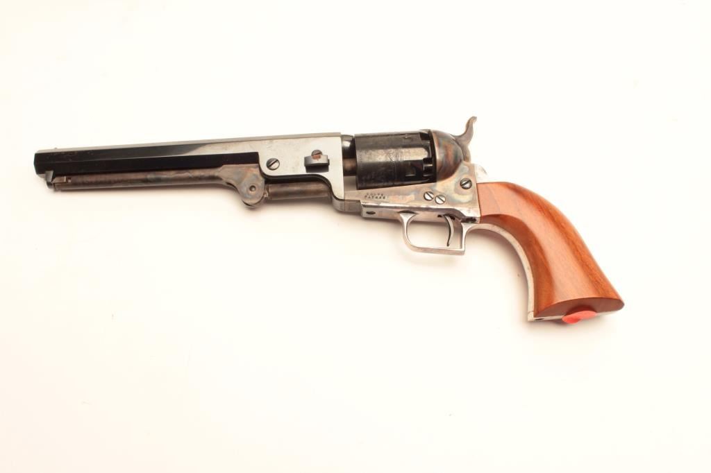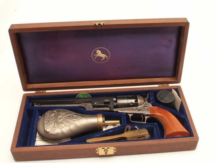 Colt New Black Powder series reproduction 1851 Colt Navy revolver, .36 caliber, Serial #22331. The pistol is as new in the factory wood presentation box with reproduction powder flask, mold and percussion caps. Thebarrel retains nearly all of its polished blue finish while the frame and hammer show dramatic case hardening. The square back trigger guard is finished in silver. The wooden presentation case with inlayed Coltmedallion is in very good condition as well. Est.: $250-$500.