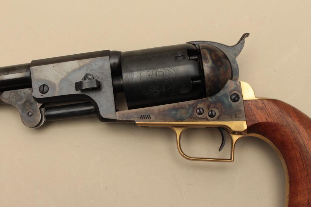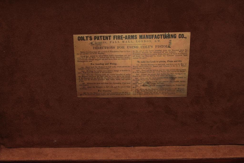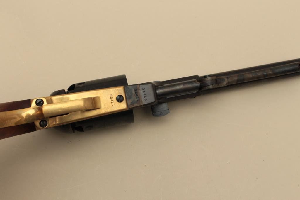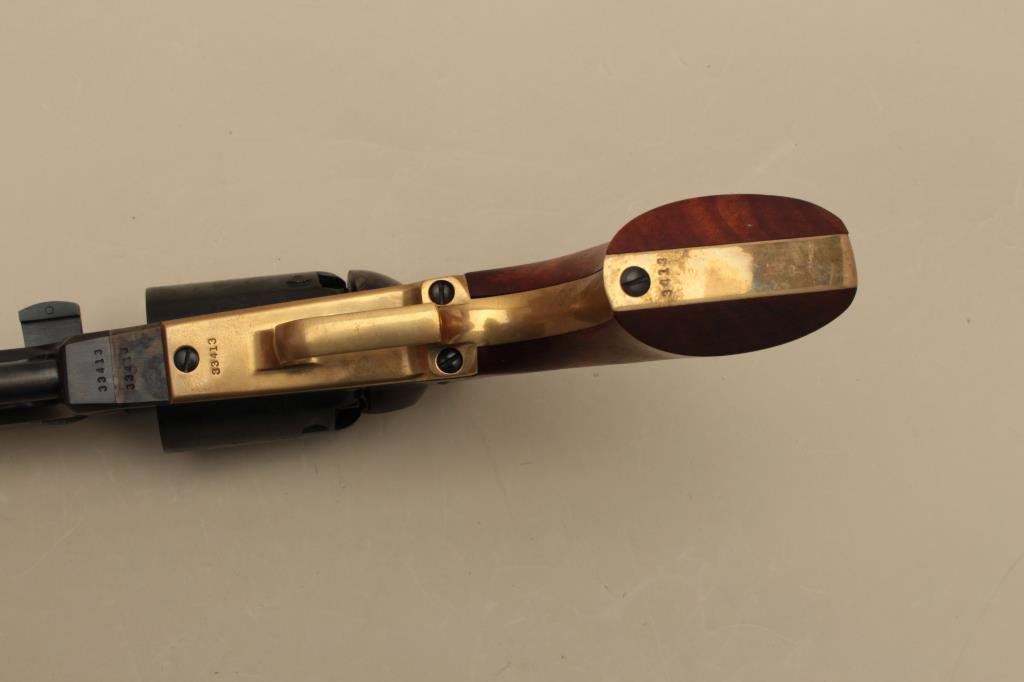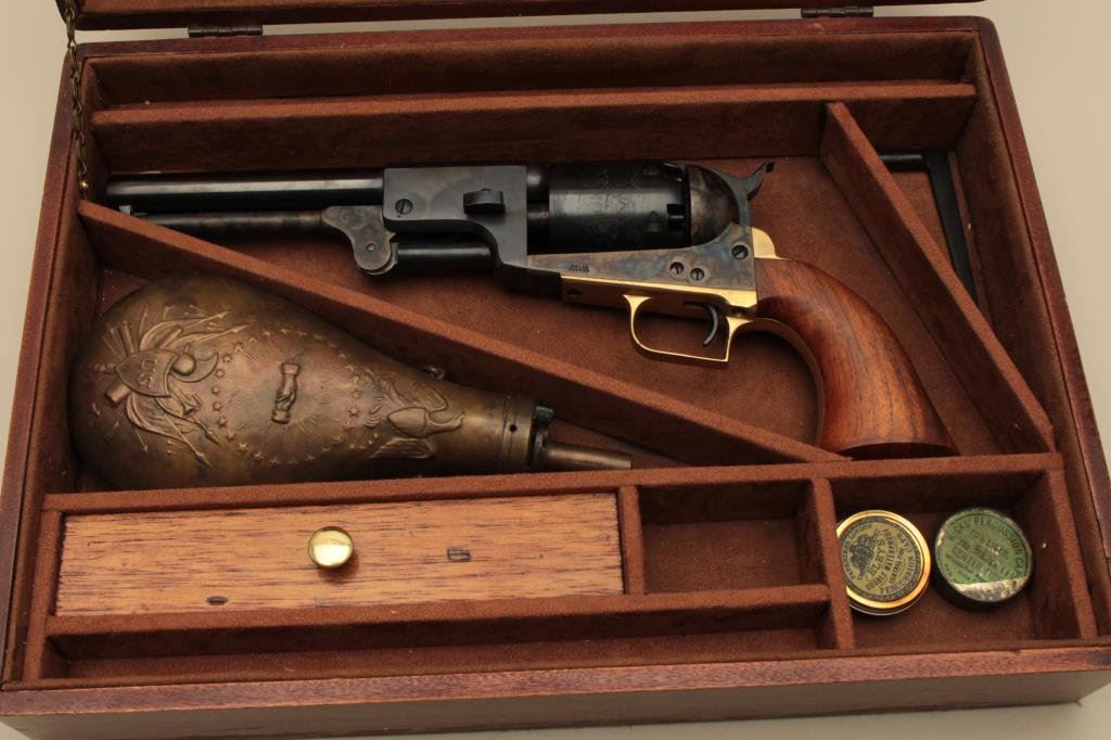blued and case hardened finish, wood grips, S/N 33413, in like new condition with modern wood display case and accessories. (Percussion). Est.: $1,000-$1,500.