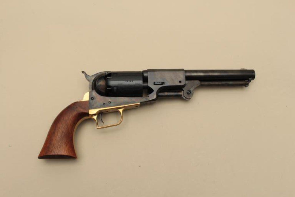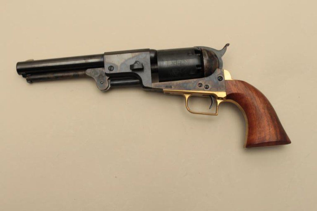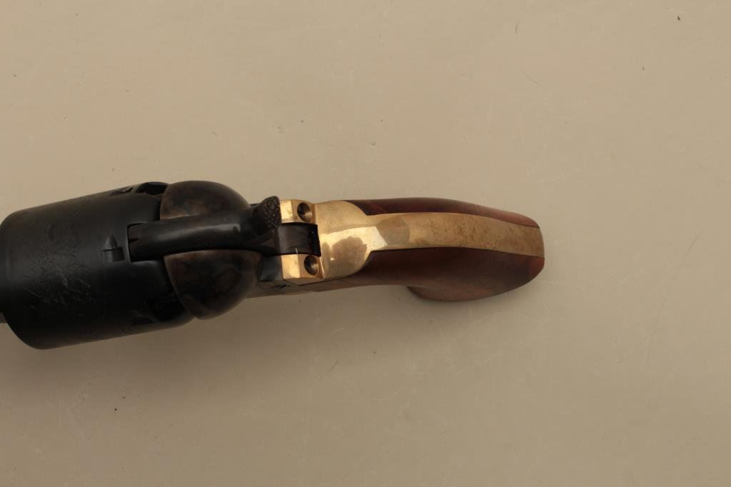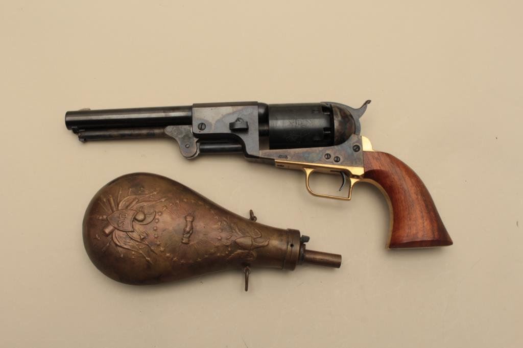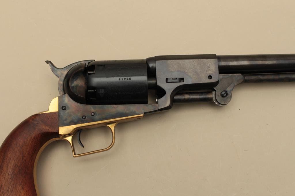 blued and case hardened finish, wood grips, S/N 33413, in like new condition with modern wood display case and accessories. (Percussion). Est.: $1,000-$1,500.