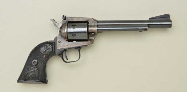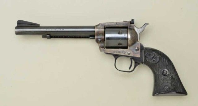 Colt New Frontier .22 single action revolver, .22LR with extra .22 Mag. cylinder, 6” barrel, blue and case hardened finish, checkered black hard rubber grips, #G183088. This gun is in overall very good conditionshowing considerable original finish with holster and high point wear, crisp action, good markings, fine grips, bore should clean to good. Est.: $300-$500.