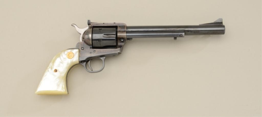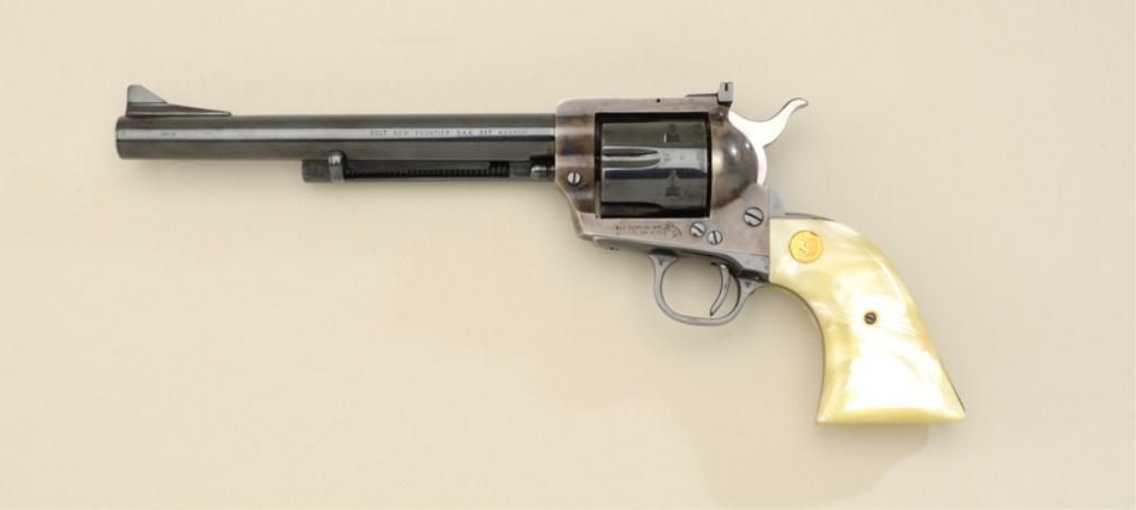 Colt New Frontier .357 Mag., 7 1/2" barrel, blued and case hardened finish, medallion pearl like grips, #5777NF, with extra wooden medallion grips. 92-95% original finish, showing some normal wear. Very good to nearfine. Est. $800-$1,600.