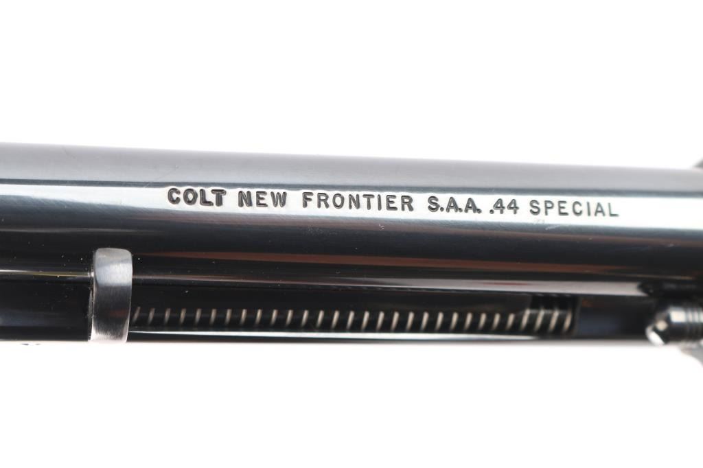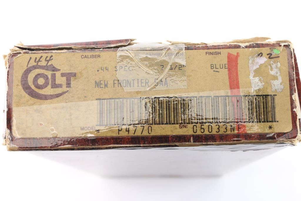 ‘P4770’ Single action revolver chambered in .44 Special. Manufactured in Hartford, CT circa 1979. The New Frontier was introduced as an ‘improved’ version of the Single Action Army with a heavy flattop frame, raised serrated ramp front sight and fully-adjustable rear sight. Features a polished blued & case hardened finish, 7 1/2" barrel, ejector rod with crescent head, fluted six-shot cylinder, checkered hammer spur, smooth curved trigger and smooth oversized walnut grips with gold Colt medallions. Includes the original wood grain cardboard box with matching end label, styrofoam inserts, and documents. Revolver retains approximately 99% of its original finish showing some superficial scratches, a very faint drag line on the cylinder and the triggerguard turned plum. The action is strong, the bore is excellent and walnut grips are very good with light sanding marks on the butt.