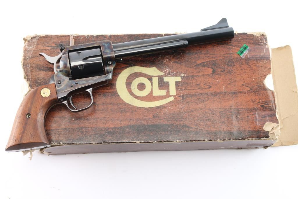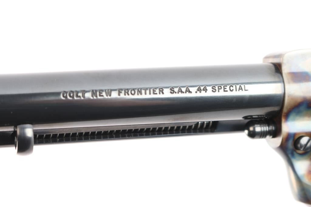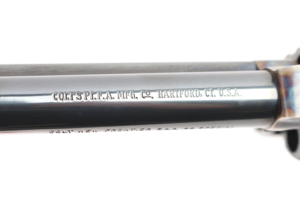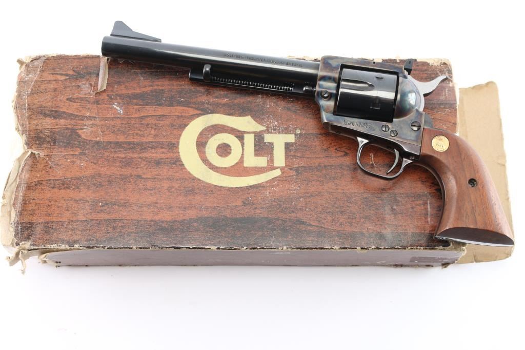 Colt 3rd Generation Single action revolver chambered in .44 Special. Manufactured in Hartford, CT circa 1981. The New Frontier was introduced as an ‘improved’ version of the Single Action Army with a heavy flattop frame, raised serrated ramp front sight and fully-adjustable rear sight. Features a polished blued & case hardened finish, 7 1/2" barrel, ejector rod with crescent head, fluted six-shot cylinder, checkered hammer spur, smooth curved trigger and smooth oversized walnut grips with gold Colt medallions. Includes the original wood grain cardboard box, styrofoam inserts, and documents. Revolver retains approximately 99% of its original finish showing a very faint drag line on the cylinder. The action is strong, the bore is excellent and walnut grips are excellent. Box is poor, missing end flap, torn, scuffed.