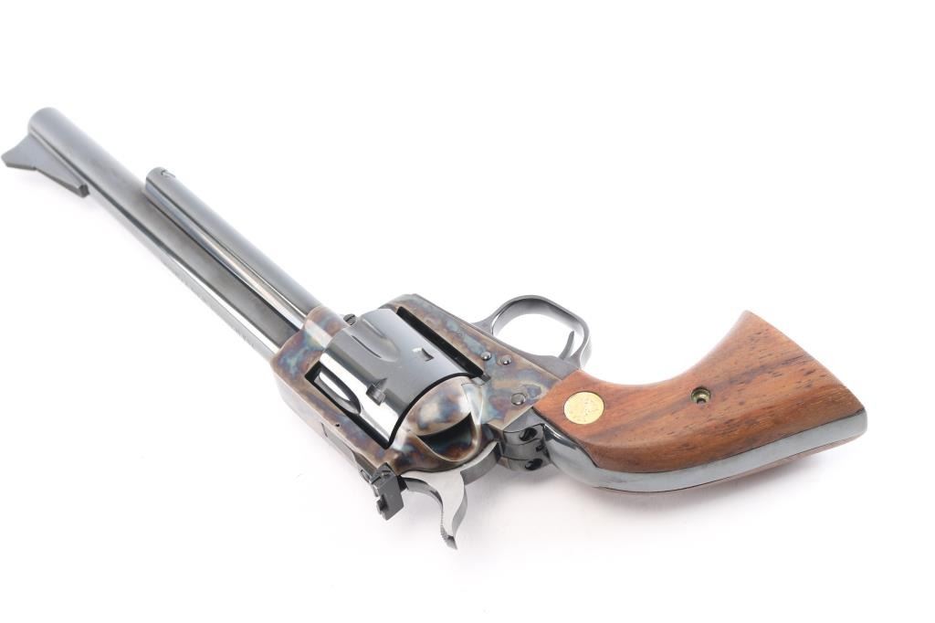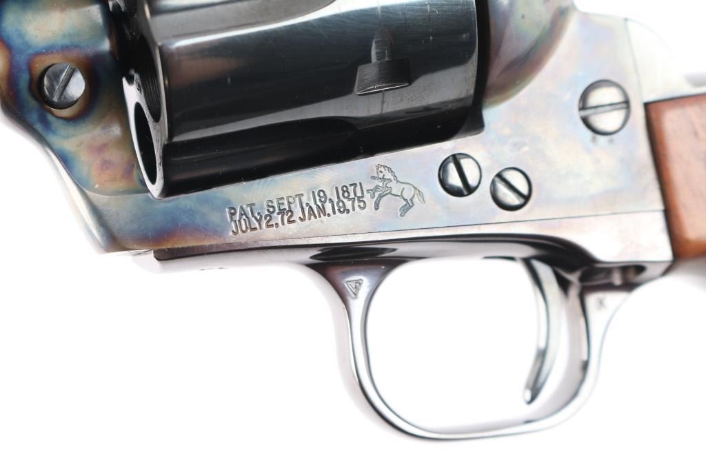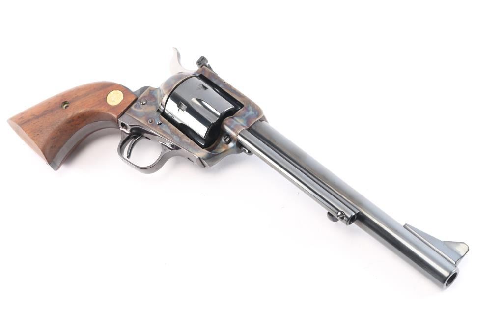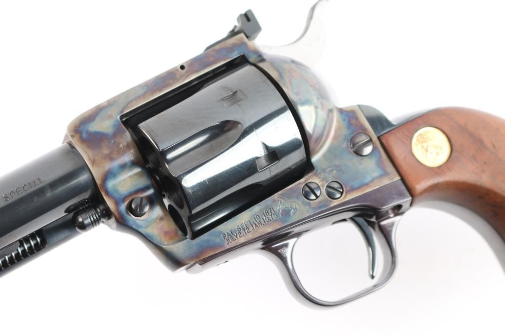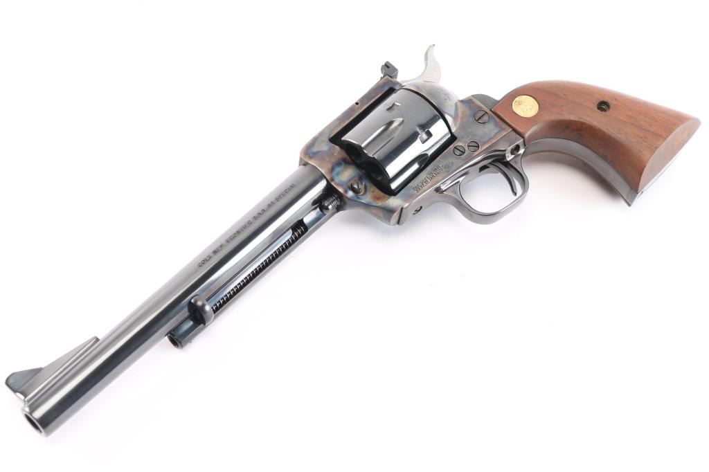 Colt 3rd Generation Single action revolver chambered in .44 Special. Manufactured in Hartford, CT circa 1981. The New Frontier was introduced as an ‘improved’ version of the Single Action Army with a heavy flattop frame, raised serrated ramp front sight and fully-adjustable rear sight. Features a polished blued & case hardened finish, 7 1/2" barrel, ejector rod with crescent head, fluted six-shot cylinder, checkered hammer spur, smooth curved trigger and smooth oversized walnut grips with gold Colt medallions. Includes the original wood grain cardboard box, styrofoam inserts, and documents. Revolver retains approximately 99% of its original finish showing a very faint drag line on the cylinder. The action is strong, the bore is excellent and walnut grips are excellent. Box is poor, missing end flap, torn, scuffed.