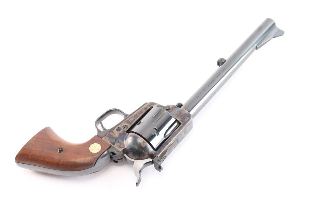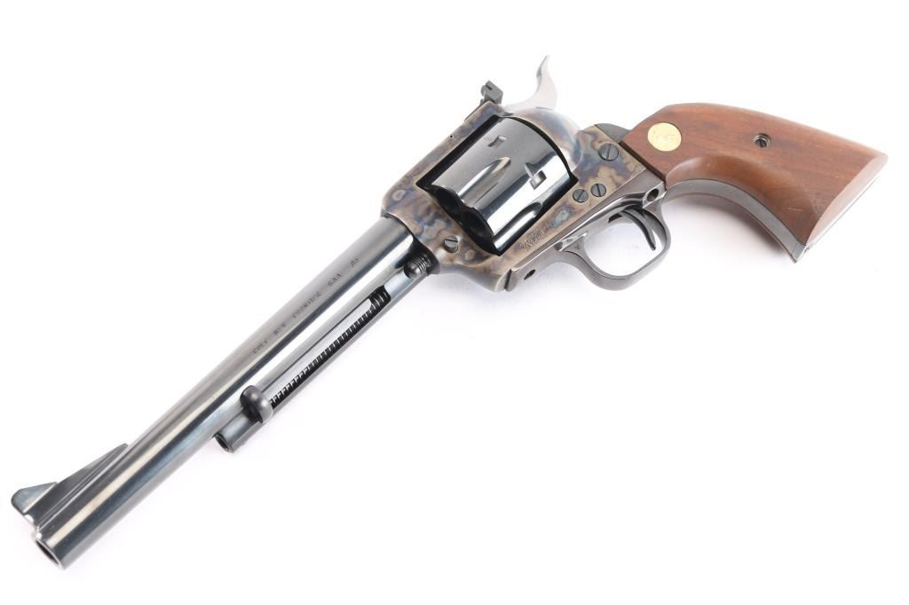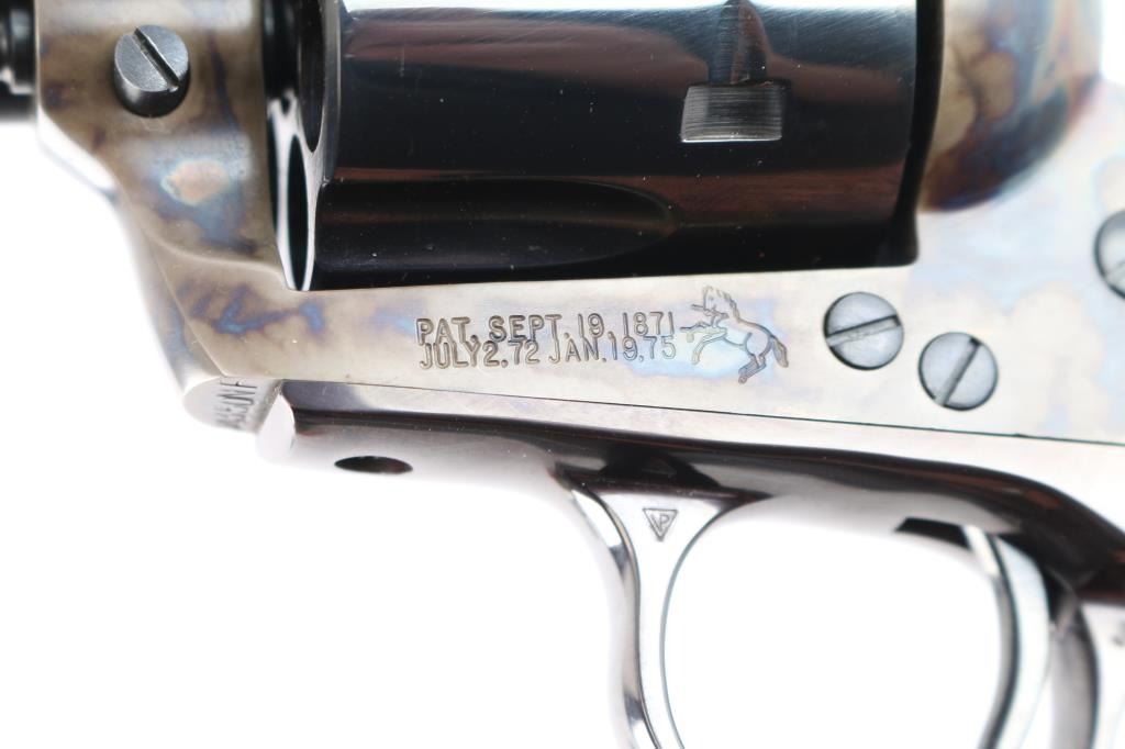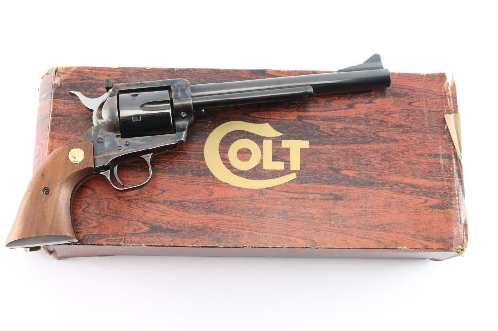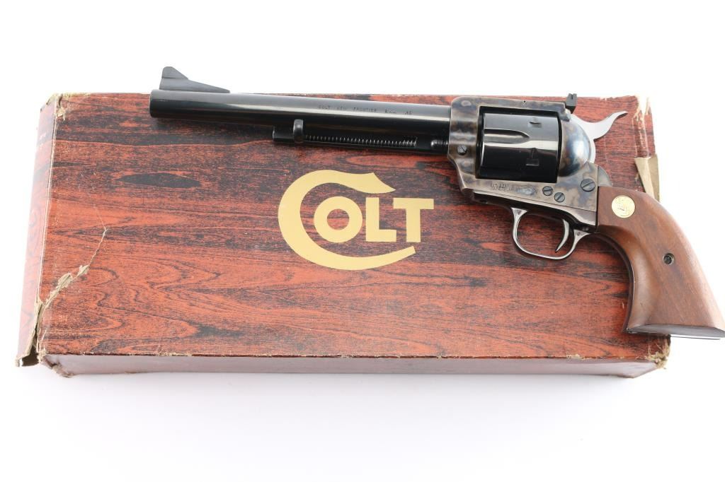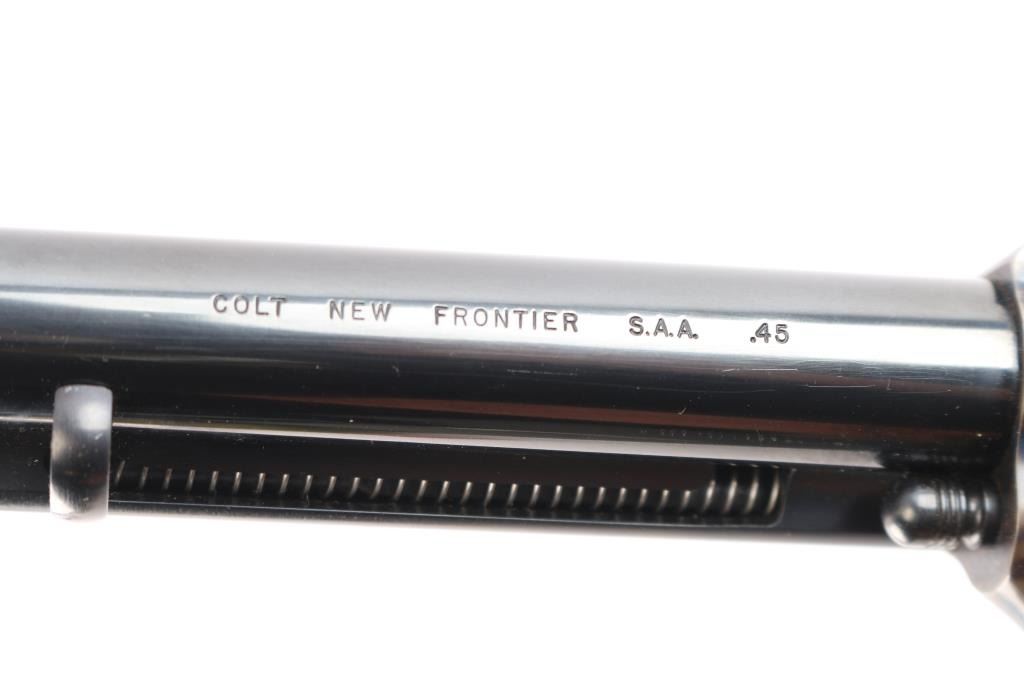American made, Colt 2nd Generation Single-Action Army revolver chambered in .45 Long Colt, manufactured in Hartford, CT. The 'New Frontier with the 'NF' serial suffix was produced between 1961 and 1975, with approximately 42,000 made. The New Frontier was introduced as an ‘improved’ version of the Single Action Army with a heavy flattop frame, raised serrated ramp front sight, micrometer adjustable rear sight, and the cylinder pin held in with a cross-pin instead of a screw. Revolver features a blued round 7 1/2" barrel, bird's head style ejector rod button, fluted six-shot cylinder, collard cylinder pin head, two-toned hammer with firing pin on the nose, checkered hammer spur, thin smooth curved trigger, smooth grip straps, and two-piece smooth oversized walnut grips with gold-toned Colt medallions. The frame is color-case hardened, and the remaining components are blued. The original blued finish retained is approximately 99% with only superficial scratches. Metal displays no rust or deformation. The action is smooth and crisp with a tight lock-up. The walnut grips are excellent with only light handling dings. Bore is bright with strong rifling, and the cylinder chambers are also excellent. Includes the original wood grain cardboard box, styrofoam inserts, and documents.