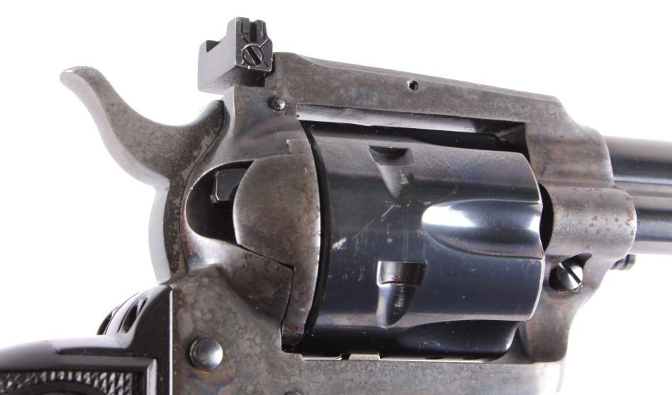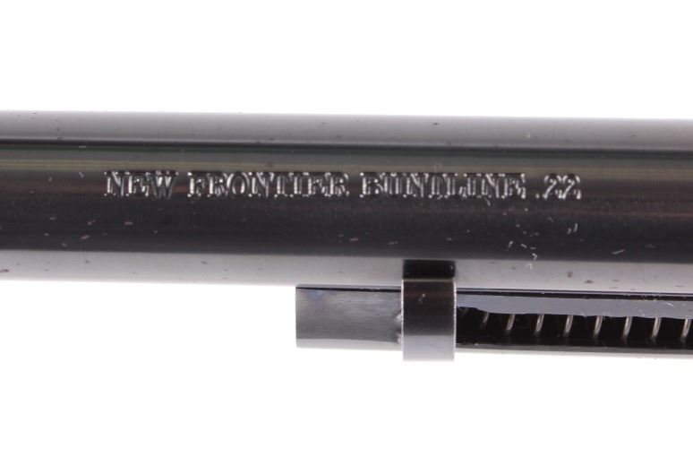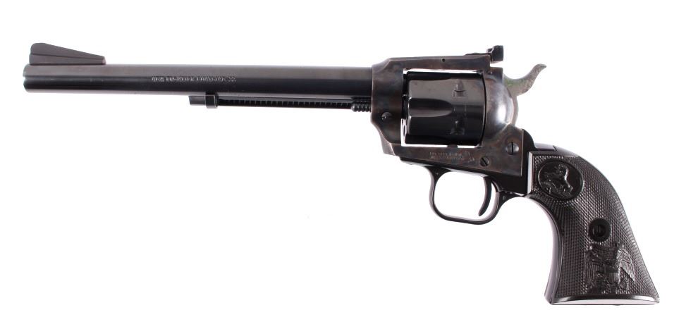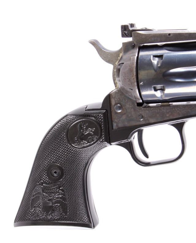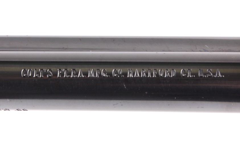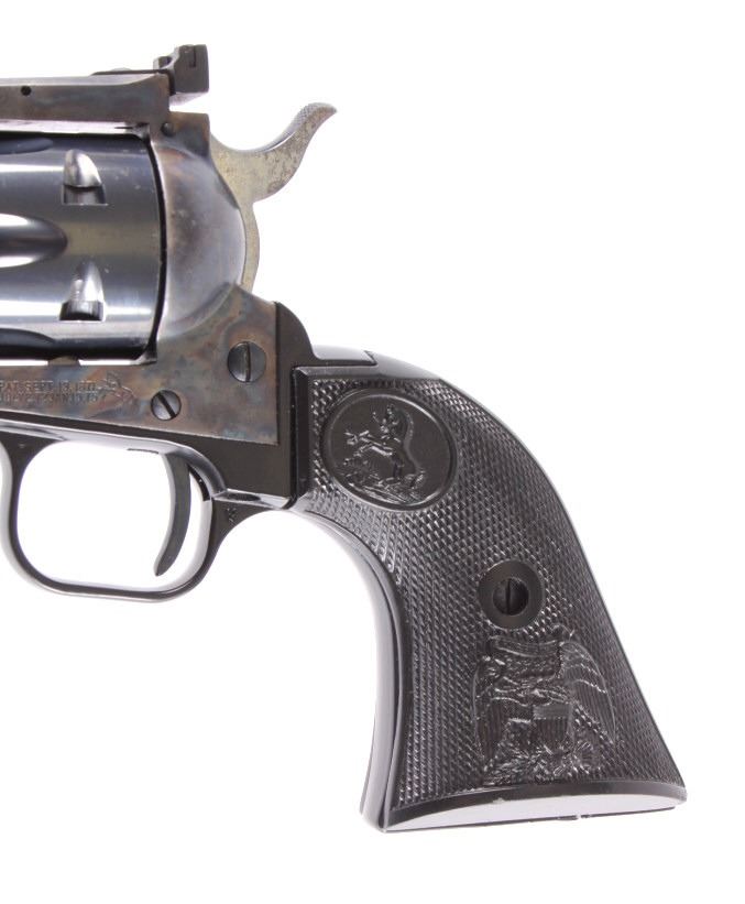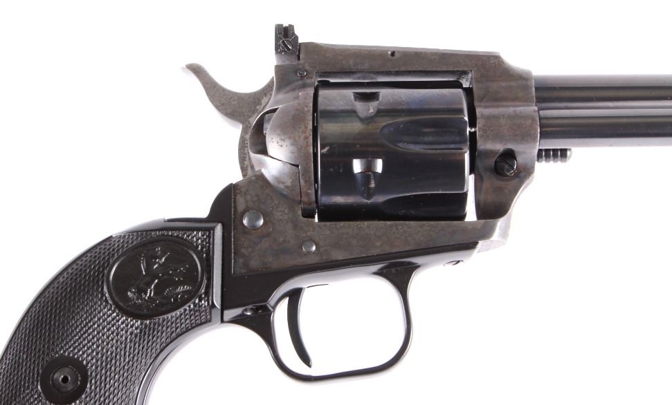 This is a Colt New Frontier Buntline single action revolver chambered in .22 caliber. The revolver features a case hardened frame with a blued 7.5" barrel and grip frame. The checkered grips show the Rampant Colt emblem at the top and the Army eagle with shield, arrows and olive branch at the bottom. The barrel is marked "New Frontier Buntline .22" and "Colt's Pt. F.A. Mfg. Co. Hartford, Conn. U.S.A.". The colt revolver is in good overall condition and has retained much of its original finish. Serial number is G210313. This is a modern manufactured handgun and requires an FFL or NICS background check for transfer. The revolver measures 12.75" long with a 7.5" barrel.