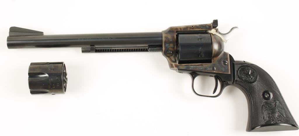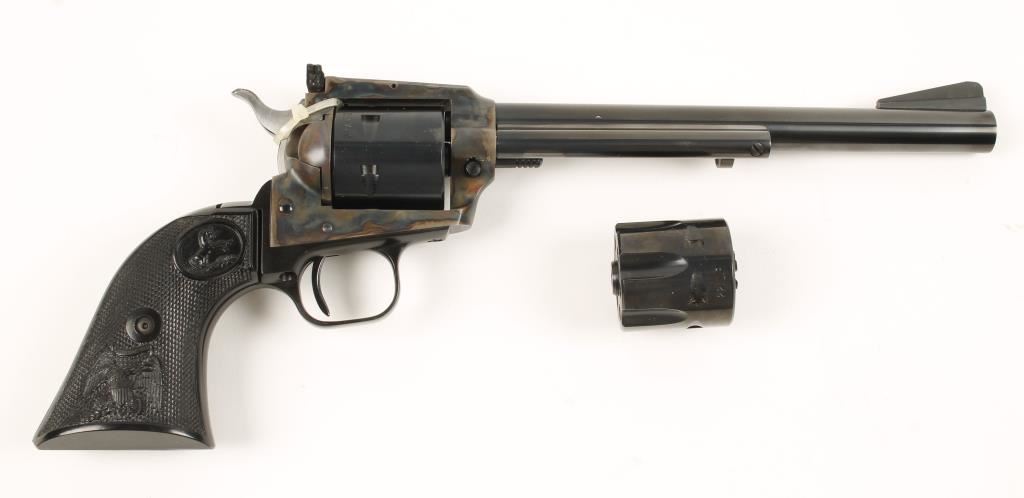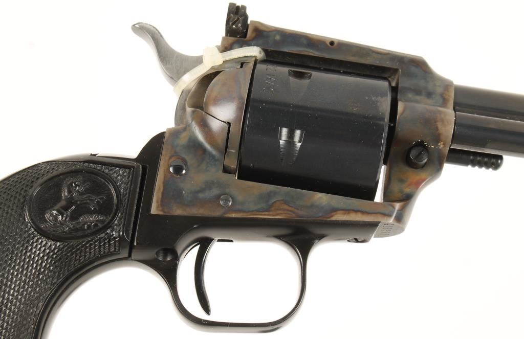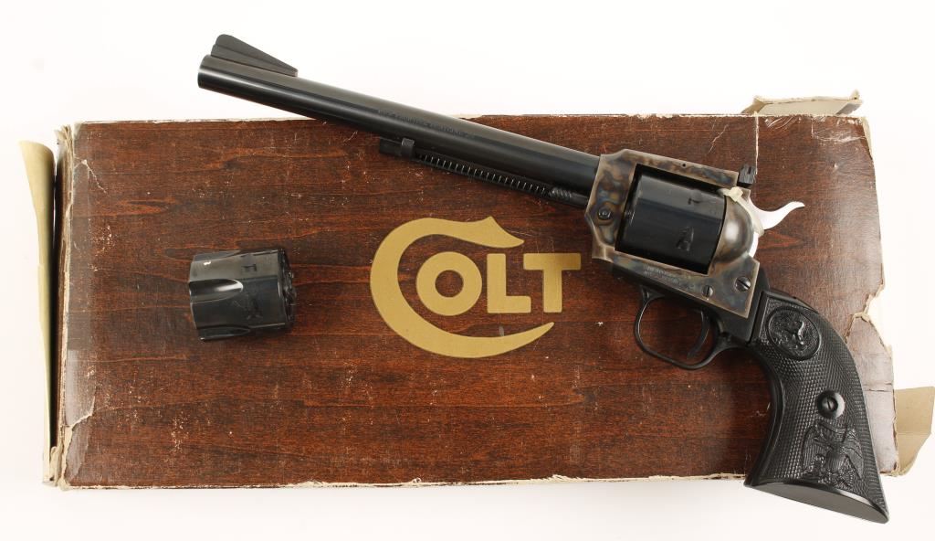Blued and color cased single-action 6-shot revolver with a 7-1/2" barrel in factory box. Stamped "New Frontier Buntline". Has two cylinders, fluted for .22LR and unfluted for .22 Mag. Cylinder chambers are free from any deficiencies. Bore is immaculate. Finish is bright on barrel, ejector rod housing and cylinders as well as the alloy grip frame. The case colored frame is un-marred. The plastic grips are pristine. Function can't be checked as it came to us with the hammer tied down. The Colt factory box is in poor condition with tears, missing pieces and taped flap. Condition is excellent. *Modern Firearm*