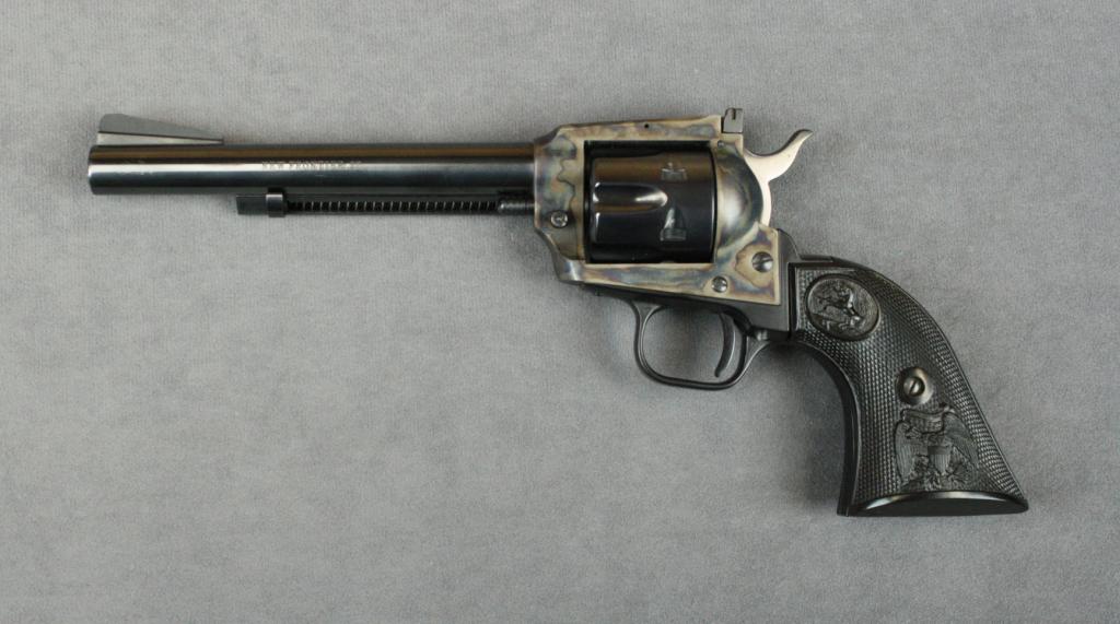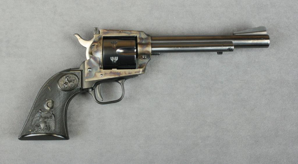 Colt New Frontier Model SAA revolver, .22  cal., 6” barrel, blue and case hardened  finish, checkered eagle hard rubber factory  grips, #G206370. This gun is in overall  excellent condition showing approx. 98%original blue and case color, fine bore,  action, markings, and grips.  Est.:   $300-$500.