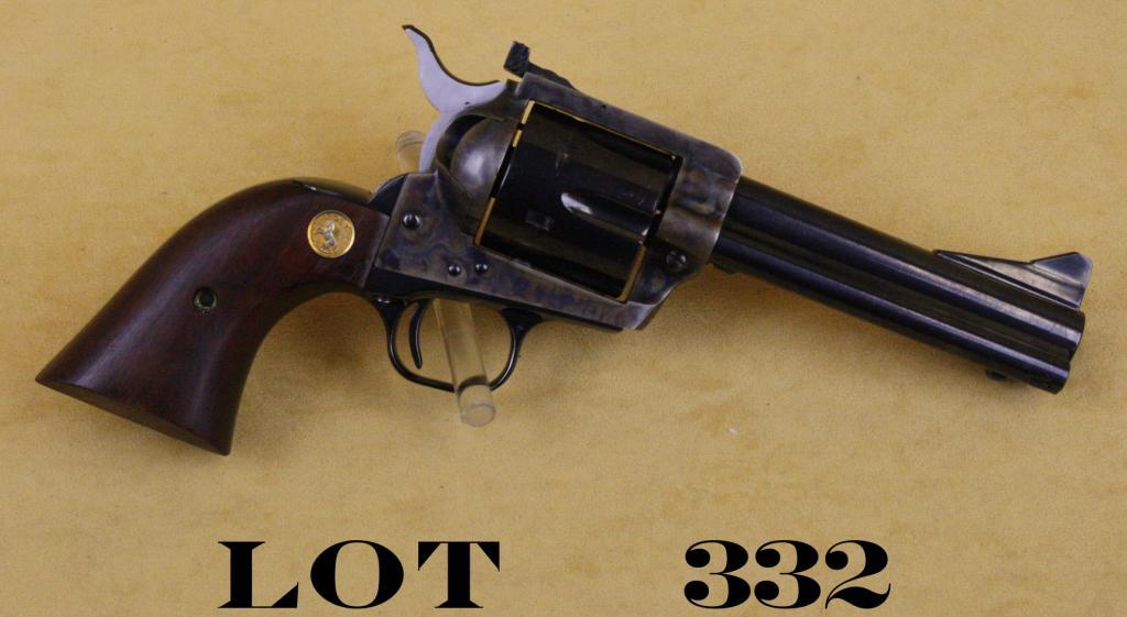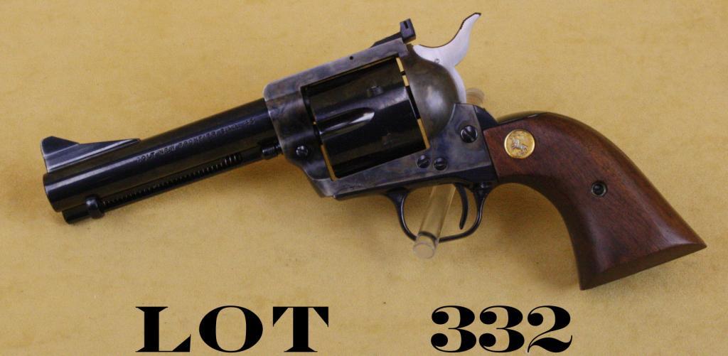 Colt New Frontier Model SAA revolver, .45 cal., 4-3/4” barrel, blue and case hardened finish, smooth wood medallion grips, #11089NF. This gun is in overall like new condition showing little handling, just aslight trace of drag line on cylinder, fine bore, action and markings and grips; in factory box with end label numbered to this gun and instruction book, etc.; box is overall fair + in condition and one endpiece is separated by included. Est.: $800-$1,400.