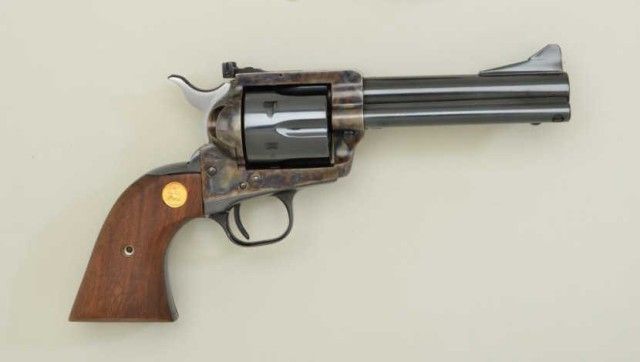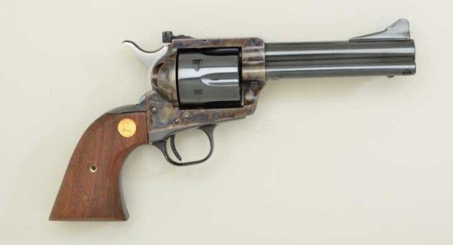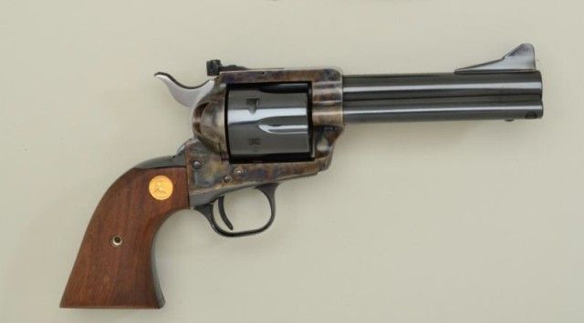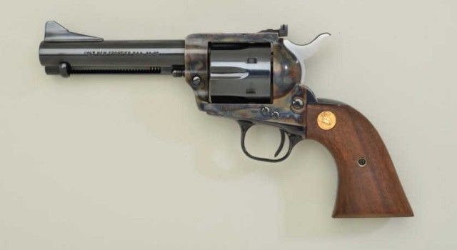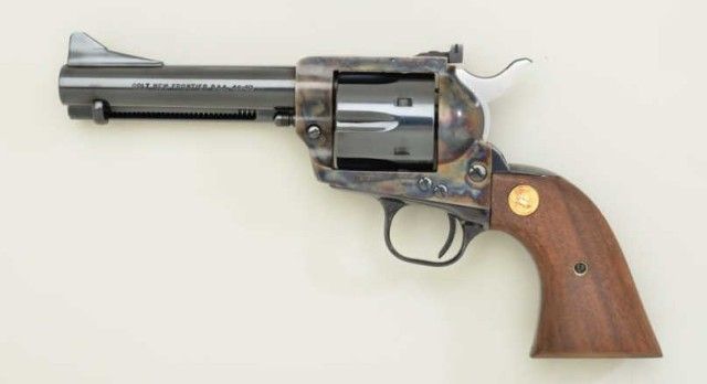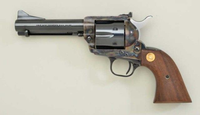 Colt New Frontier SAA revolver, .44-40 cal., 4-3/4” barrel, blue and case hardened finish, smooth wood medallion grips, #15441NF in factory wood grained cardboard box with instruction manual and hang tag. This gun isin overall like new condition showing little handling; box is fair with scuffing and repairs but end label is numbered to this gun. Est.: $1,000-$2,000.