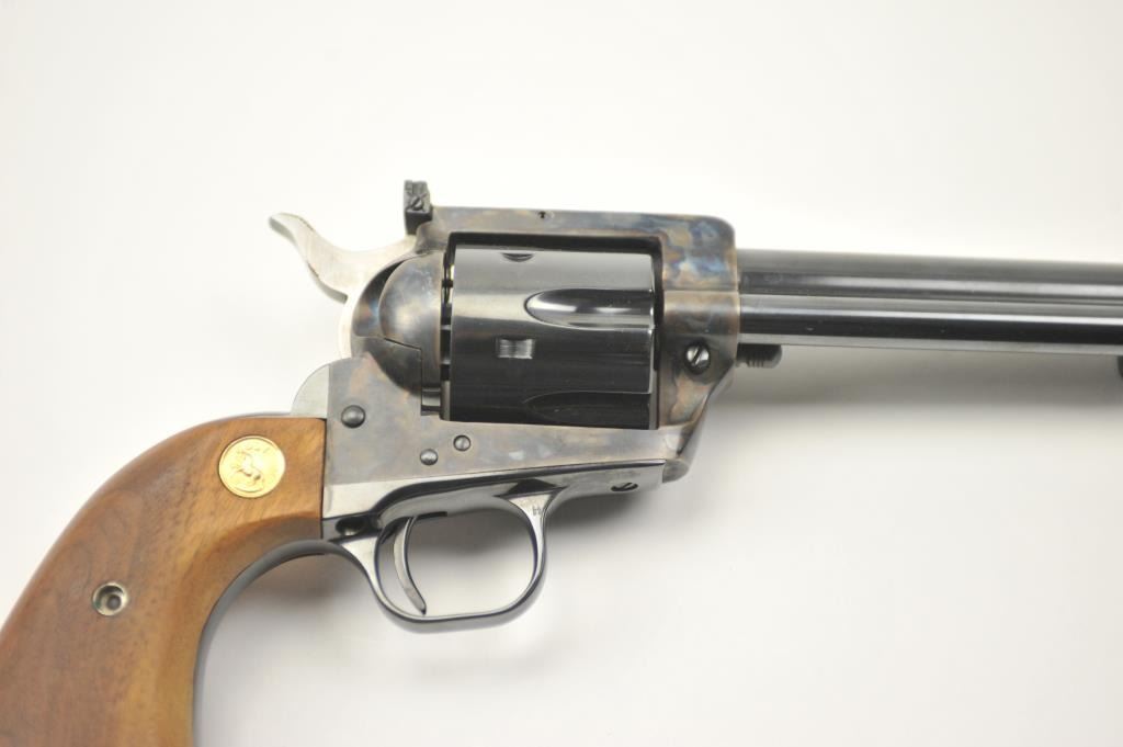 Colt New Frontier SAA revolver, .44 Special caliber, Serial #08803NF. The pistol is as new in the factory box with a 7 ½” barrel. The pistol retains approximately 99% of the factory blue finish with beautiful vivid case colors on the frame. The smooth wood medallion grips are in excellent condition. The pistol comes in the original woodgrain cardboard factory box with matching end label. Est.: $900-$1,800. (Modern/PPT).
