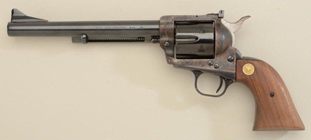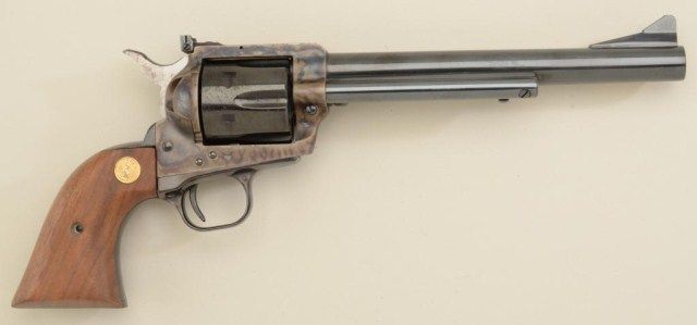 Colt New Frontier SAA revolver, .45 Colt cal., 7-1/2” barrel, blue and case hardened finish, wood grips, #02382NF; slight storage rust and beginning pitting; 90-95% finish that may clean; good action; fine bore.Est.: $600-$1,200.