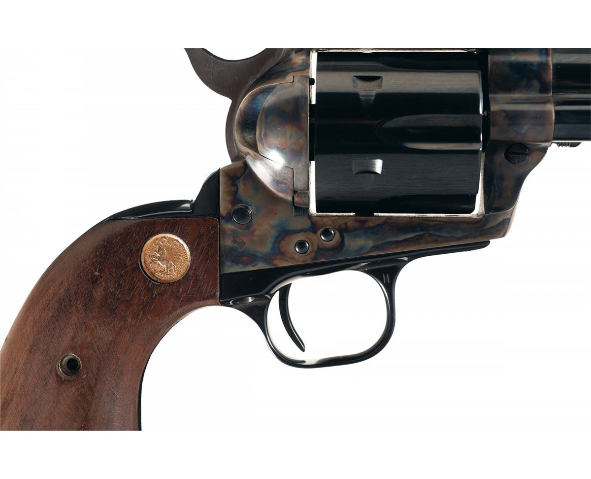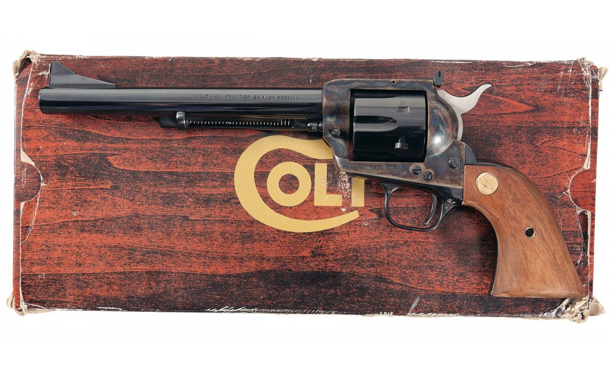 Standard one line barrel address with the left side of barrel marked "COLT NEW FRONTIER S.A.A. .44 SPECIAL". Fixed ramp front and adjustable rear sights. Casehardened flattop frame with standard two line, three patent date marking with Rampant Colt. Smooth walnut grips with gold Colt medallions. Complete with Colt "wood grain" box.
