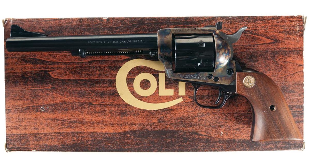 Manufactured in 1979. Standard markings, ramp front sight and an adjustable notch rear sight. Fitted with smooth walnut grips with gold Colt medallions. Comes with the original "woodgrain" box numbered to the gun.