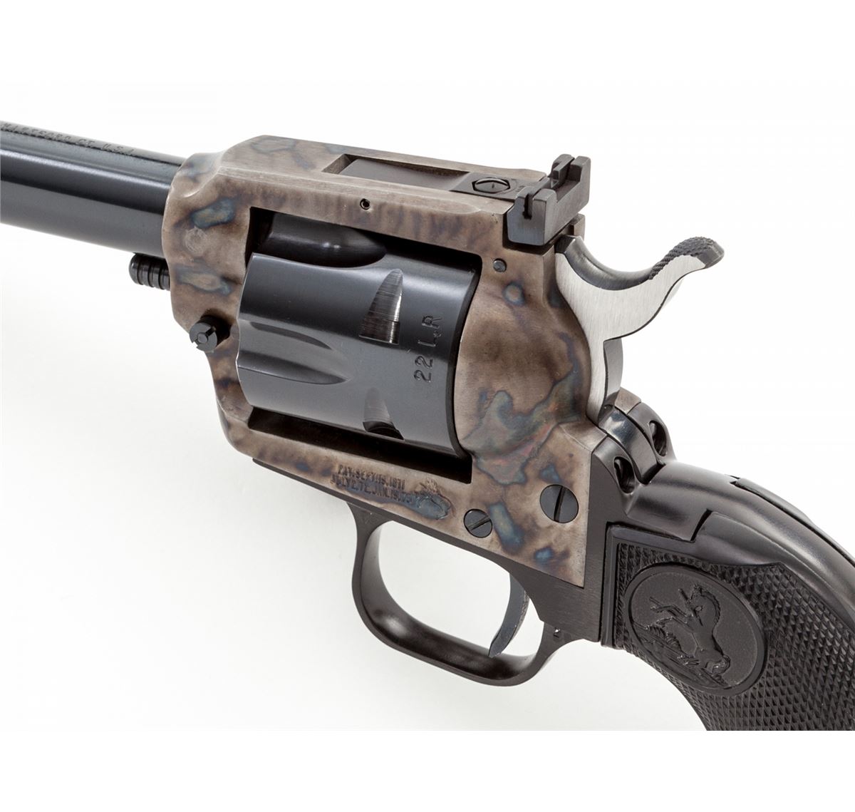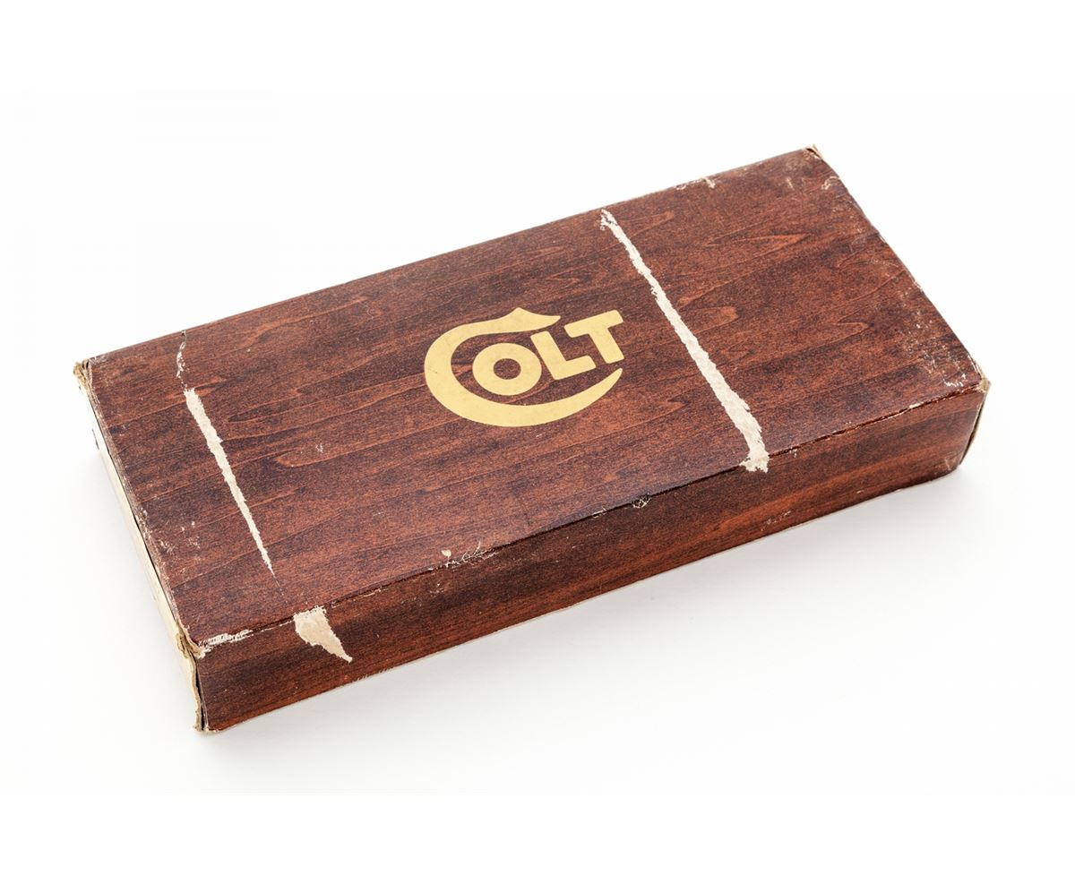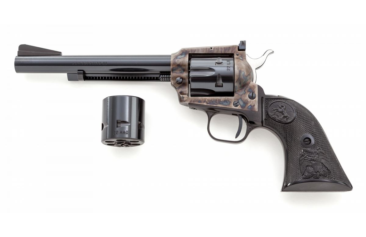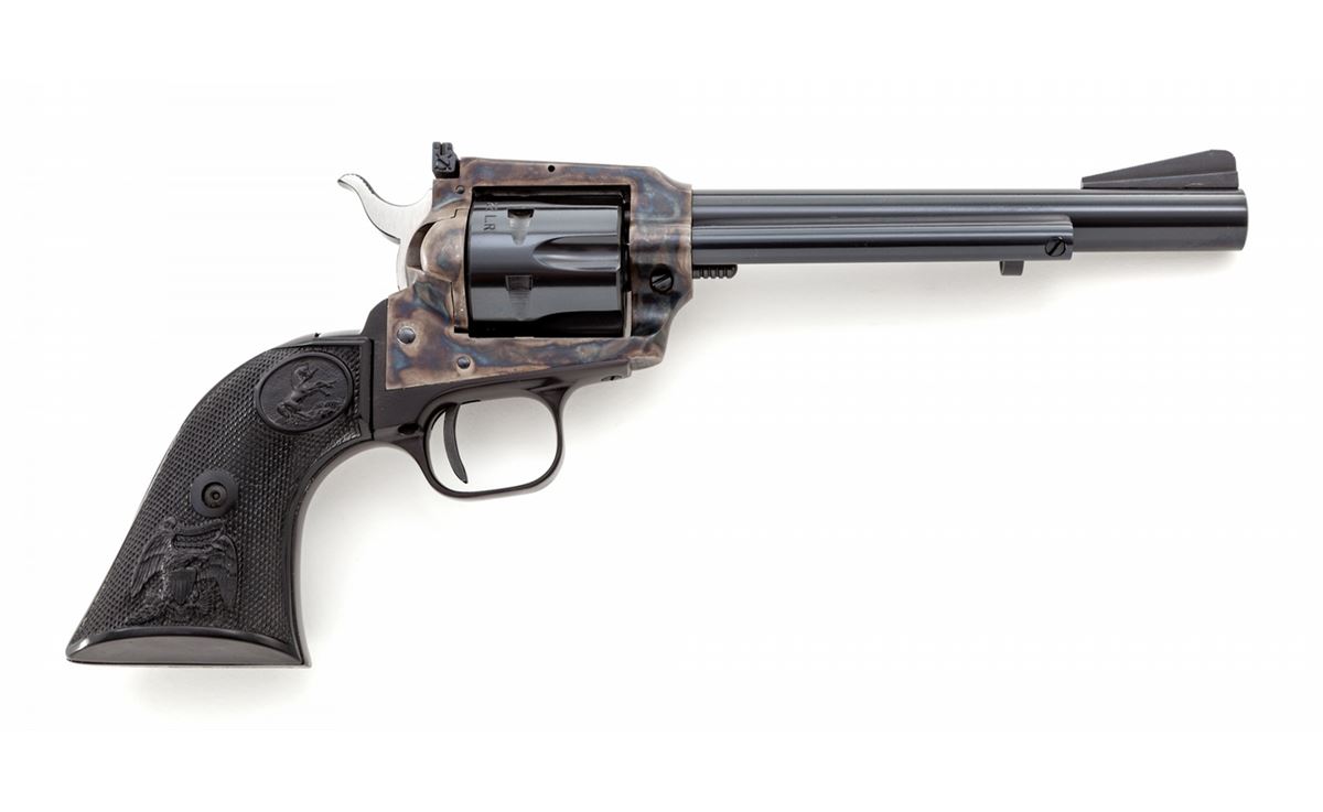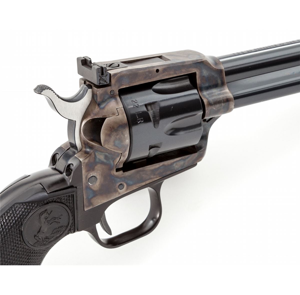 Colt New Frontier Single Action Revolver, #G135108, .22 LR/.22 mag. cal., 6'' barrel, blue and case hardened finish, factory adjustable rear sight, with American eagle black plastic checkered grips. Condition is excellent, appearing as new, in original box with instructions. Box with some tape pull losses. Est.: $500-$750. (C&R/PPT)