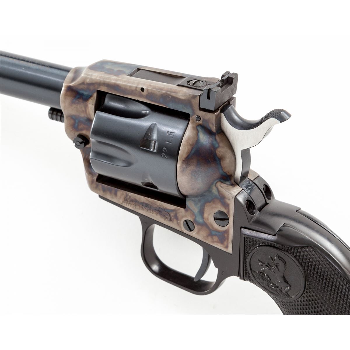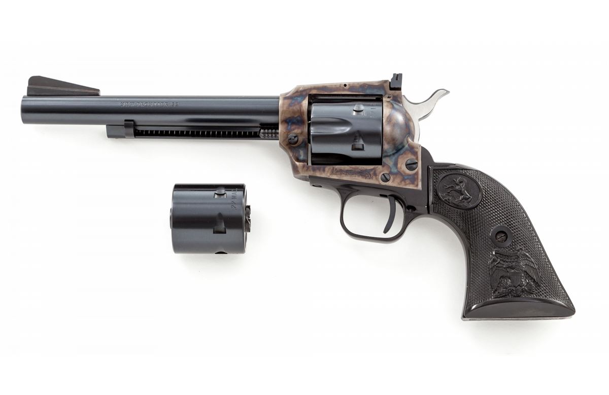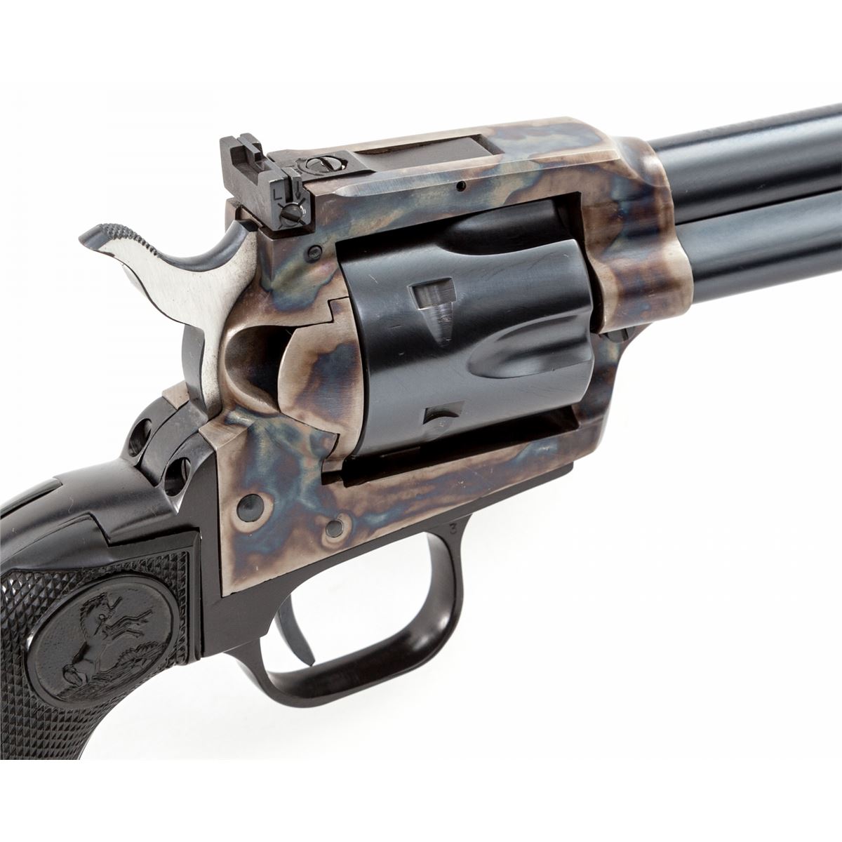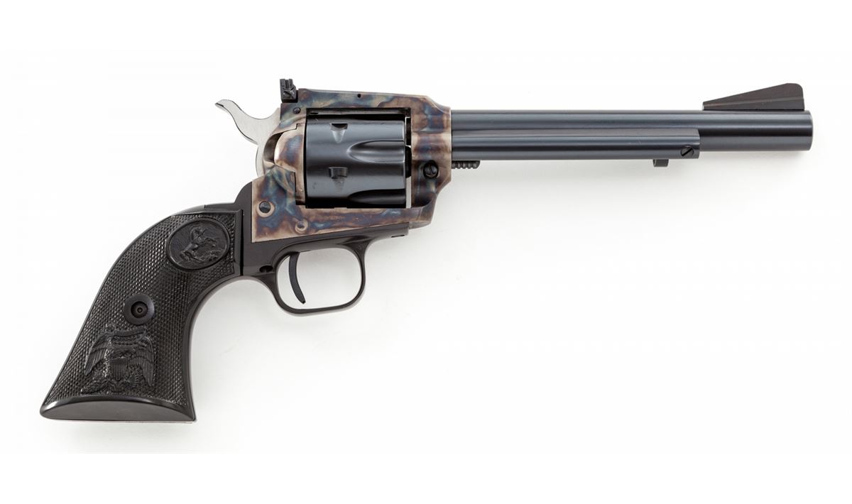 Colt New Frontier Single Action Revolver, #G197329, .22 LR/.22 mag. cal., 6'' barrel, blue and case hardened finish, factory black plastic checkered American eagle grips, with factory adjustable sights. Condition is excellent, appearing as new, in original box. Box with tatters, tape repairs and missing both end flaps. Est.: $500-$750. (C&R/PPT)