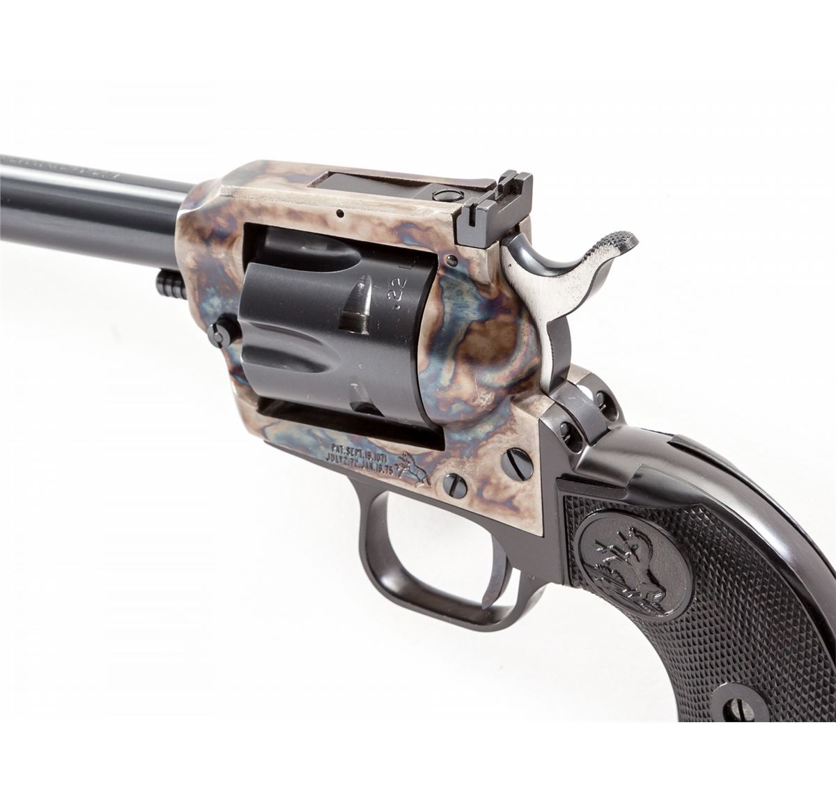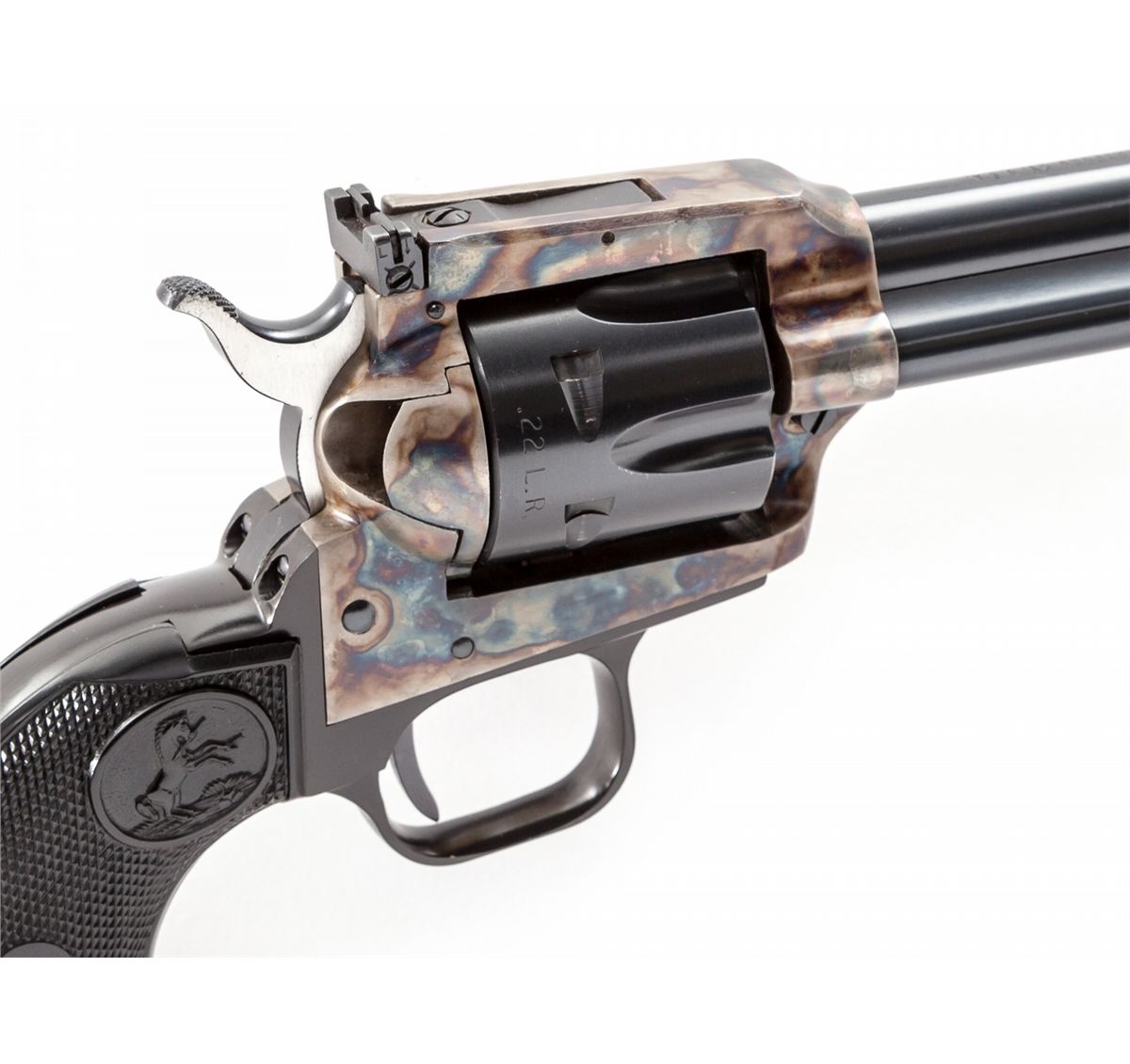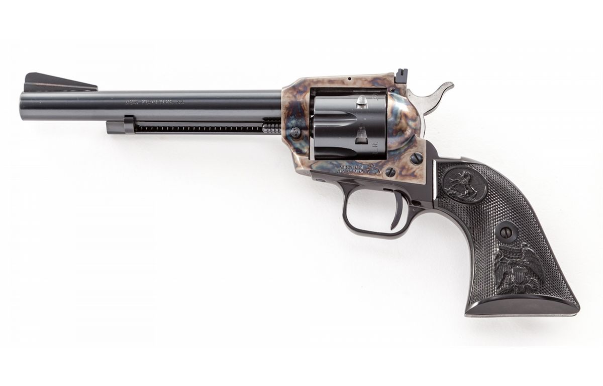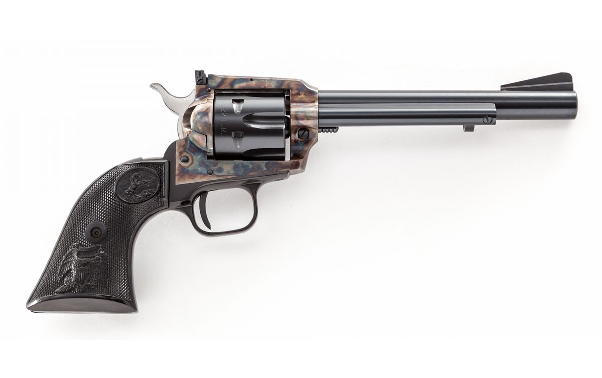 Colt New Frontier Single Action Target Revolver, #G57350, .22 LR cal., 6'' barrel, blue and case hardened finish, factory black plastic checkered eagle grips, with adjustable sights. Mfg'd in the early 1970s. Condition is excellent, appearing as new. Est.: $650-$850. (C&R/PPT)