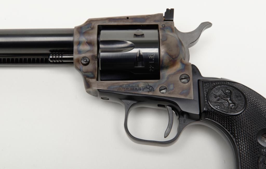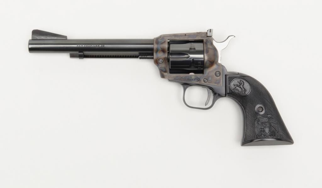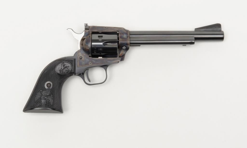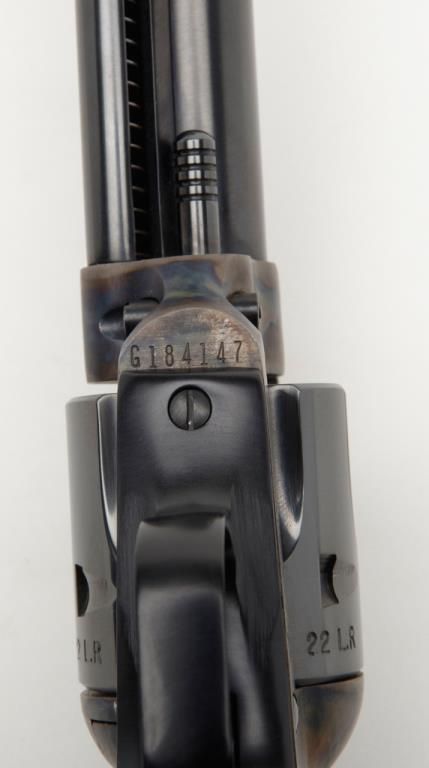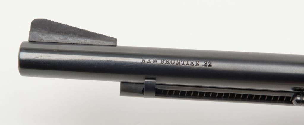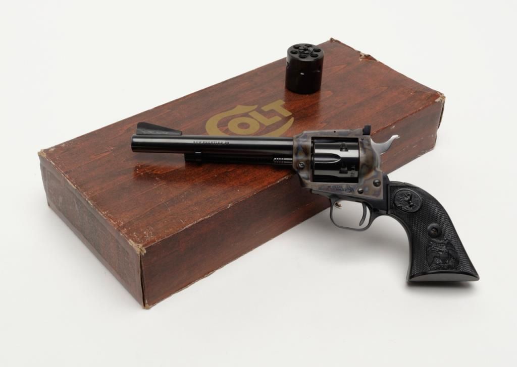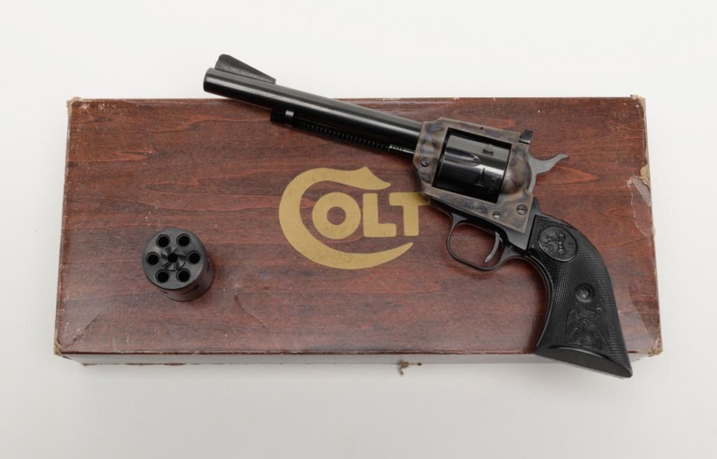 Colt New Frontier Single Action revolver, .22LR cal., 6” barrel, blue and case hardened finish, checkered black plastic eagle grips, with extra .22 Mag. cylinder in factory wood grain cardboard box with inserts and hang tag, #G184147 in likenew condition showing little handling. (C&R/PPT). Est.: $400-$800