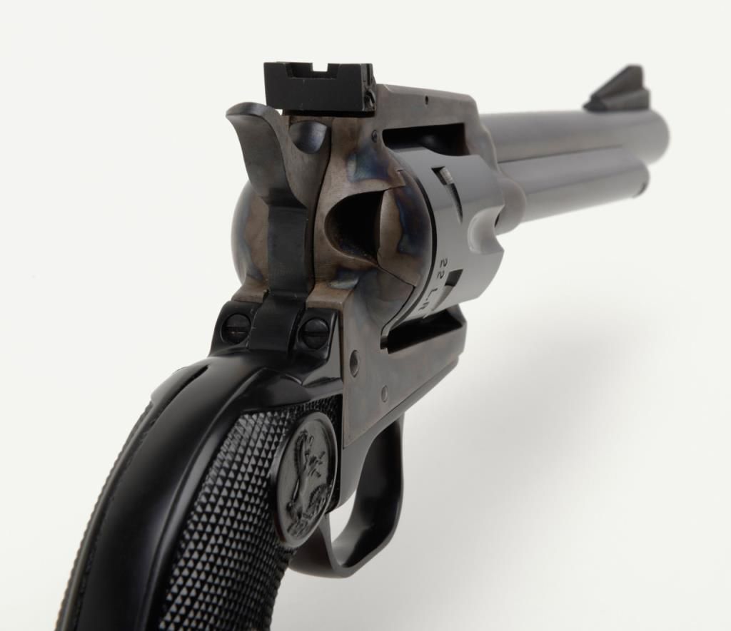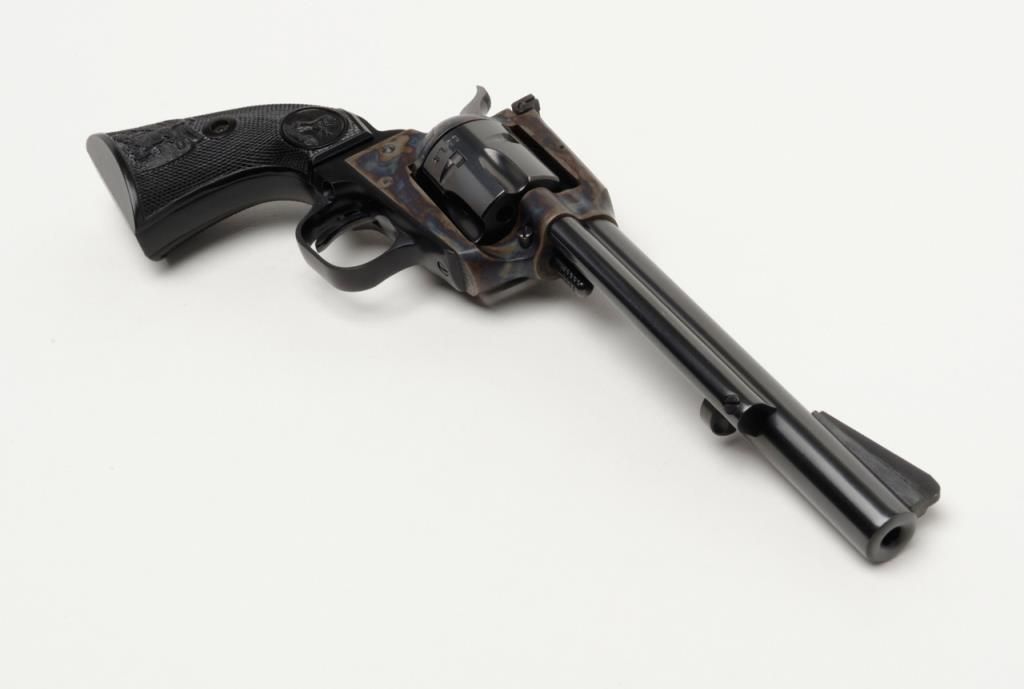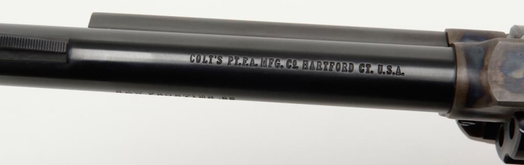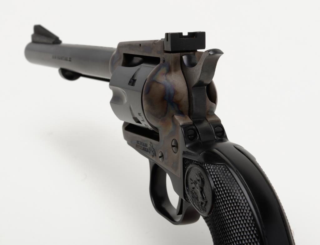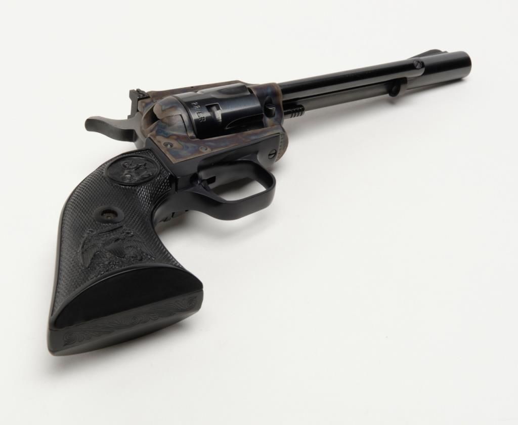 Colt New Frontier Single Action revolver, .22LR cal., 6” barrel, blue and case hardened finish, checkered black plastic eagle grips, with extra .22 Mag. cylinder in factory wood grain cardboard box with inserts and hang tag, #G184147 in likenew condition showing little handling. (C&R/PPT). Est.: $400-$800