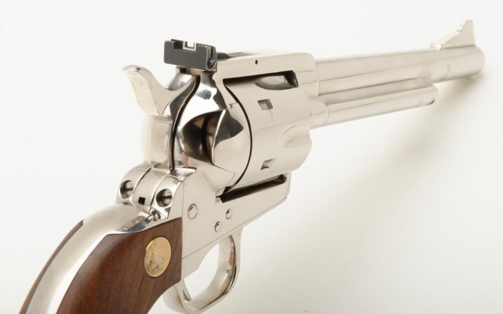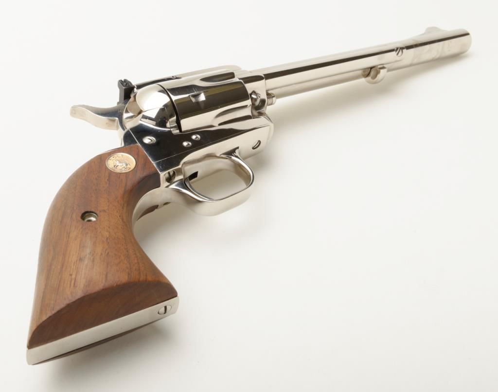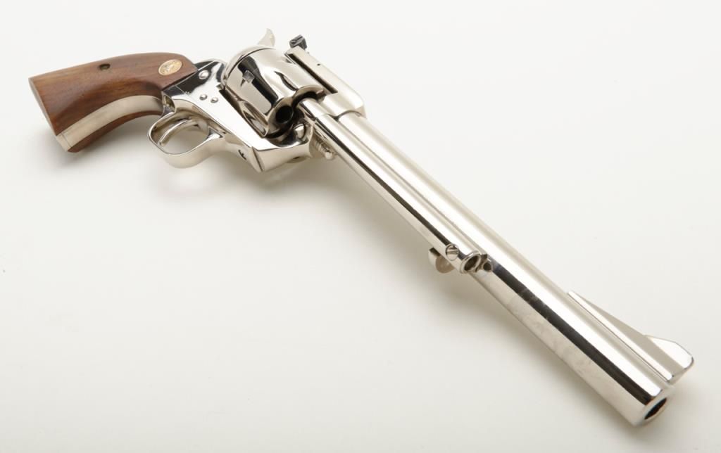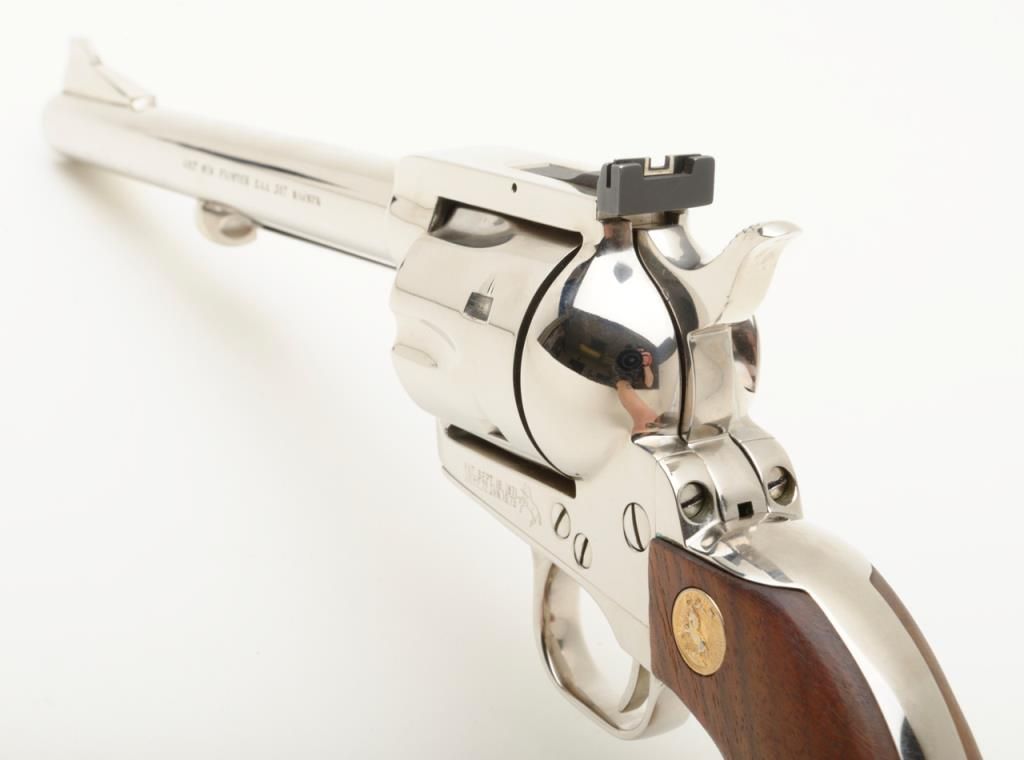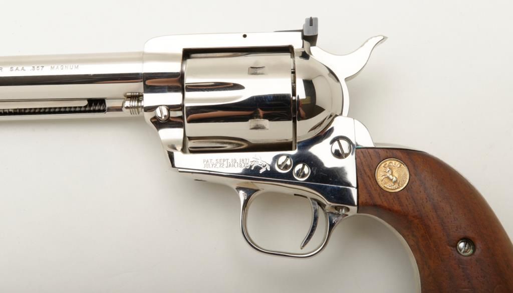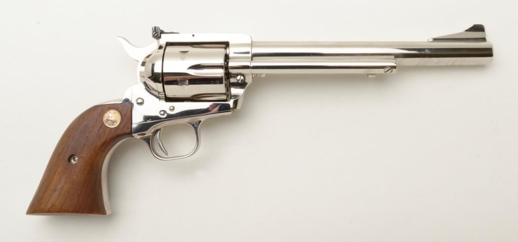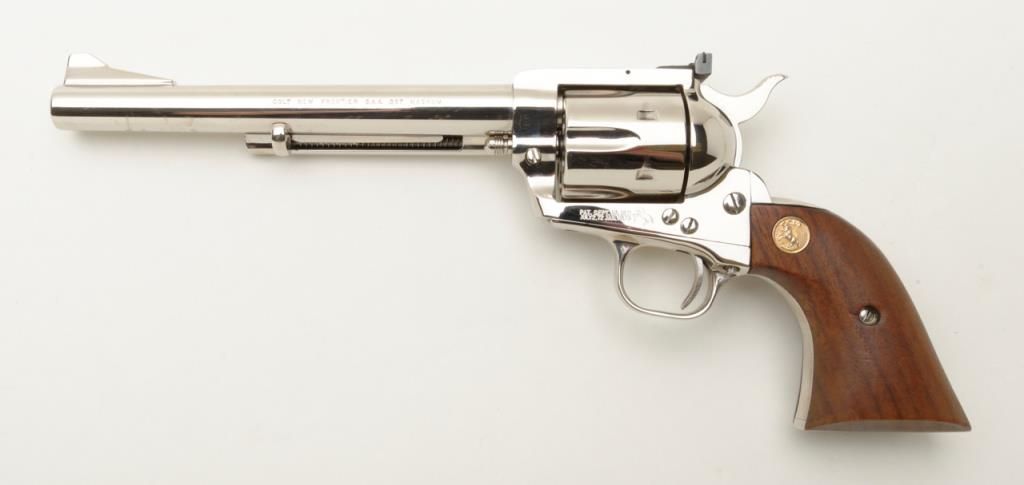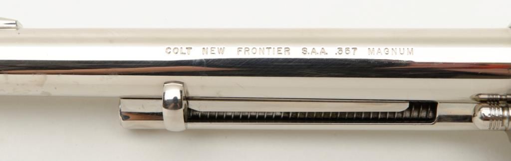 Colt New Frontier flat top target single action revolver, .357 Magnum cal., 7-1/2” barrel, nickel finish, smooth wood Colt medallion grips, #14329 in like new condition showing little use or handling. (C&R/PPT). Est.: $850-$1,700.
