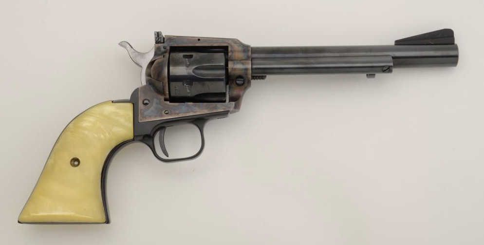 Colt New Frontier single action revolver, .22LR cal., 6” barrel, blue and case hardened finish, pearl-like grips, #G78117. This gun is in excellent condition showing approx. 99% original finish, crisp action, markings,bore and grips. Est.: $250-$350.