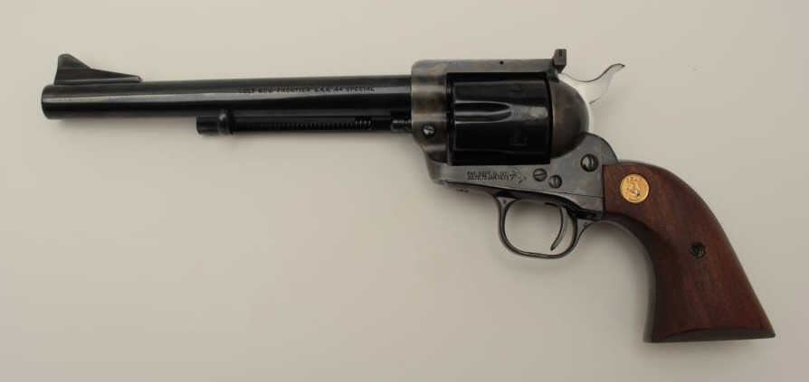 Colt New Frontier single action revolver, .44 Special caliber, 7.5” barrel, blued and case hardened finish, smooth wood medallion grips, S/N 13868NF, like new in the factory wood grain cardboard box with inserts.(Modern/PPT). Est.: $700-$1,400.