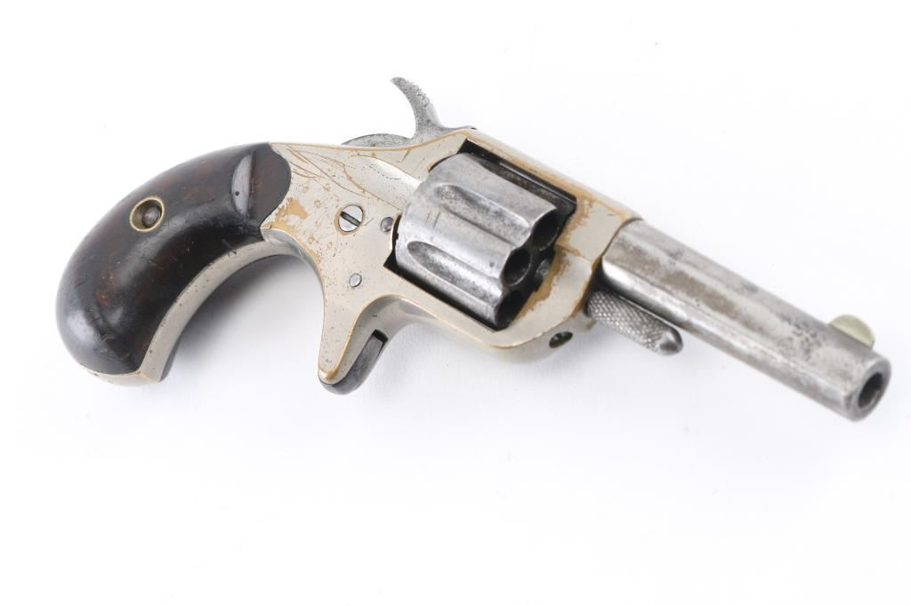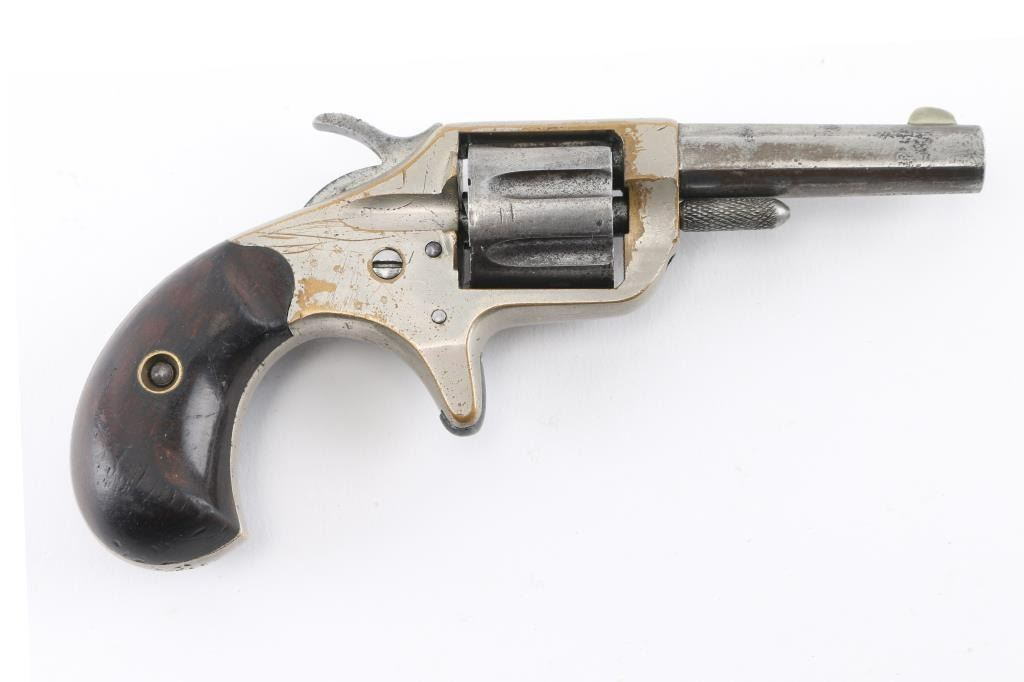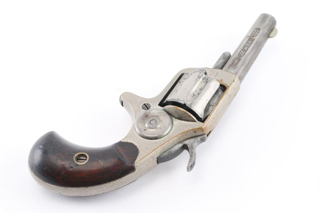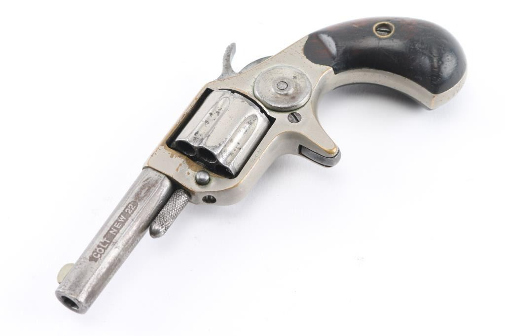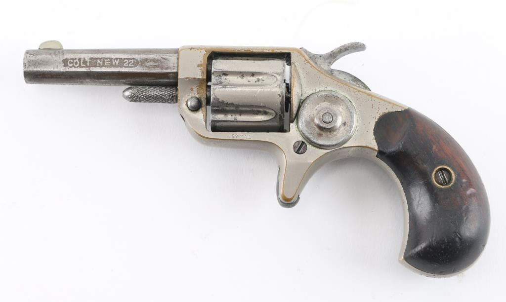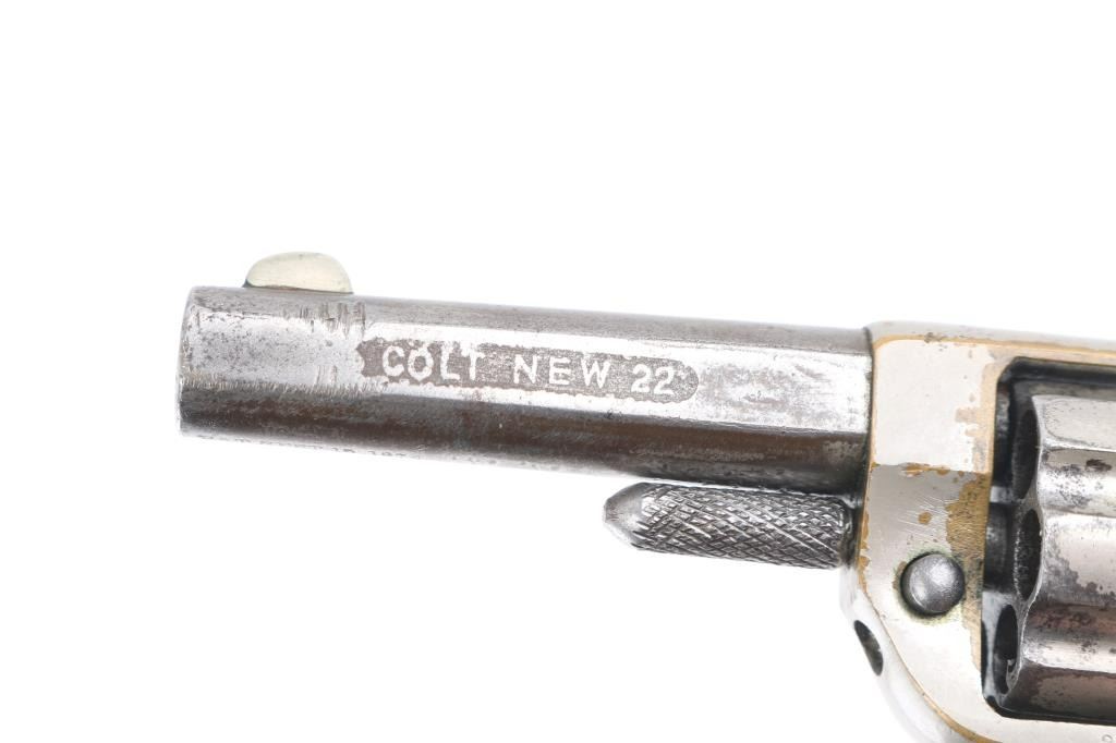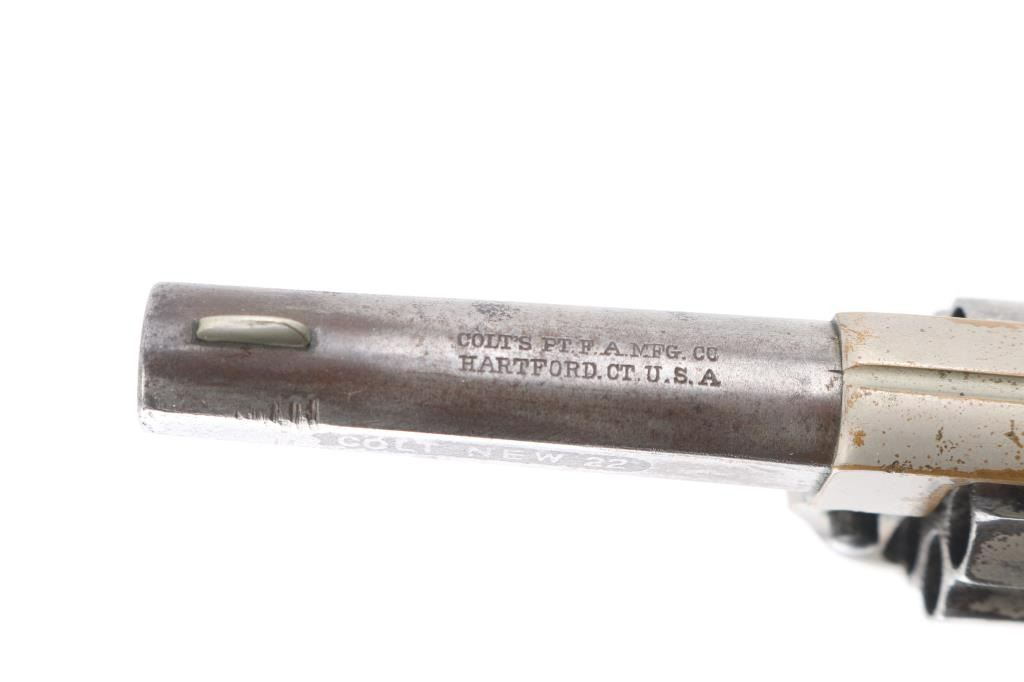 Manufactured 1876, second variation with long cylinder flutes, single action, 7 shot revolver with 2 1/4' slab sided barrel, serial number matched on frame, barrel, and rear of cylinder. fluted cylinder, knurled cylinder rod and hammer spur. "Colt New 22" etched on left flat of barrel. Colt address on top of barrel and patent date on the underside. Varnished 'birds head' wood grips, nickel finish with blue barrel. Action is crisp/tight, grips are very good with some minor dents, bore has rifling present, but has scattered areas of pin-prick pitting. barrel has turned a gray/blue patina, and nickel finish is about about 70% with loss to the edges, some scratches, and mostly to the cylinder. NRA Condition-Very Good to Fine as Antique
